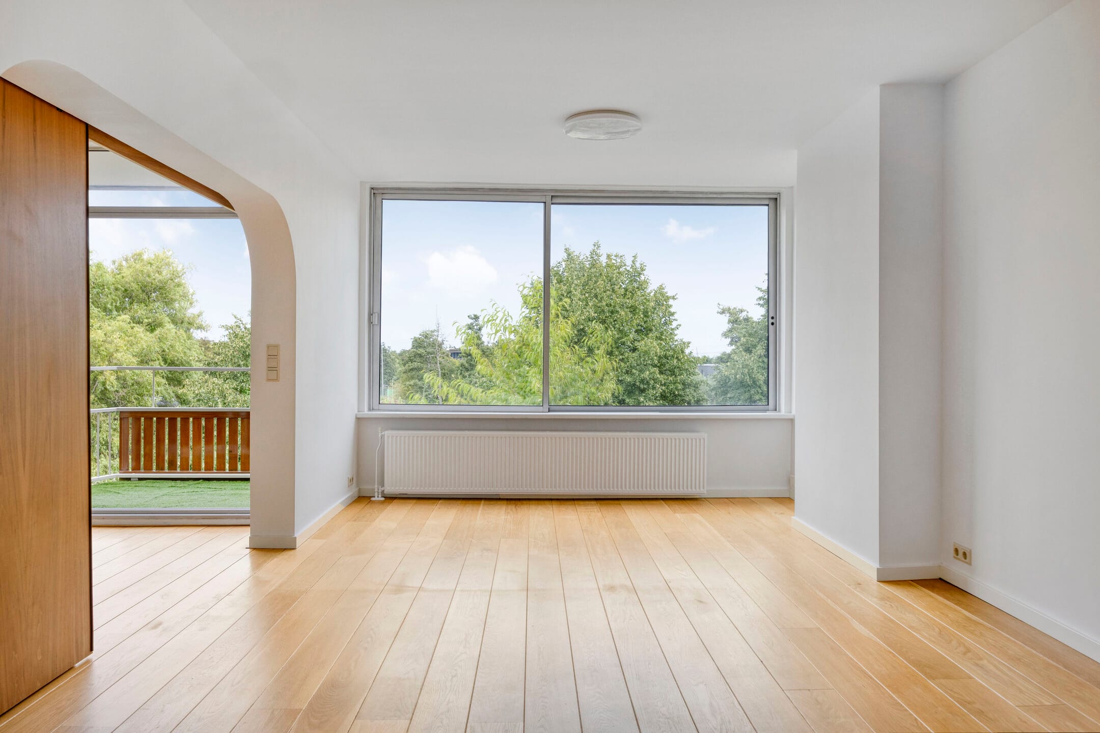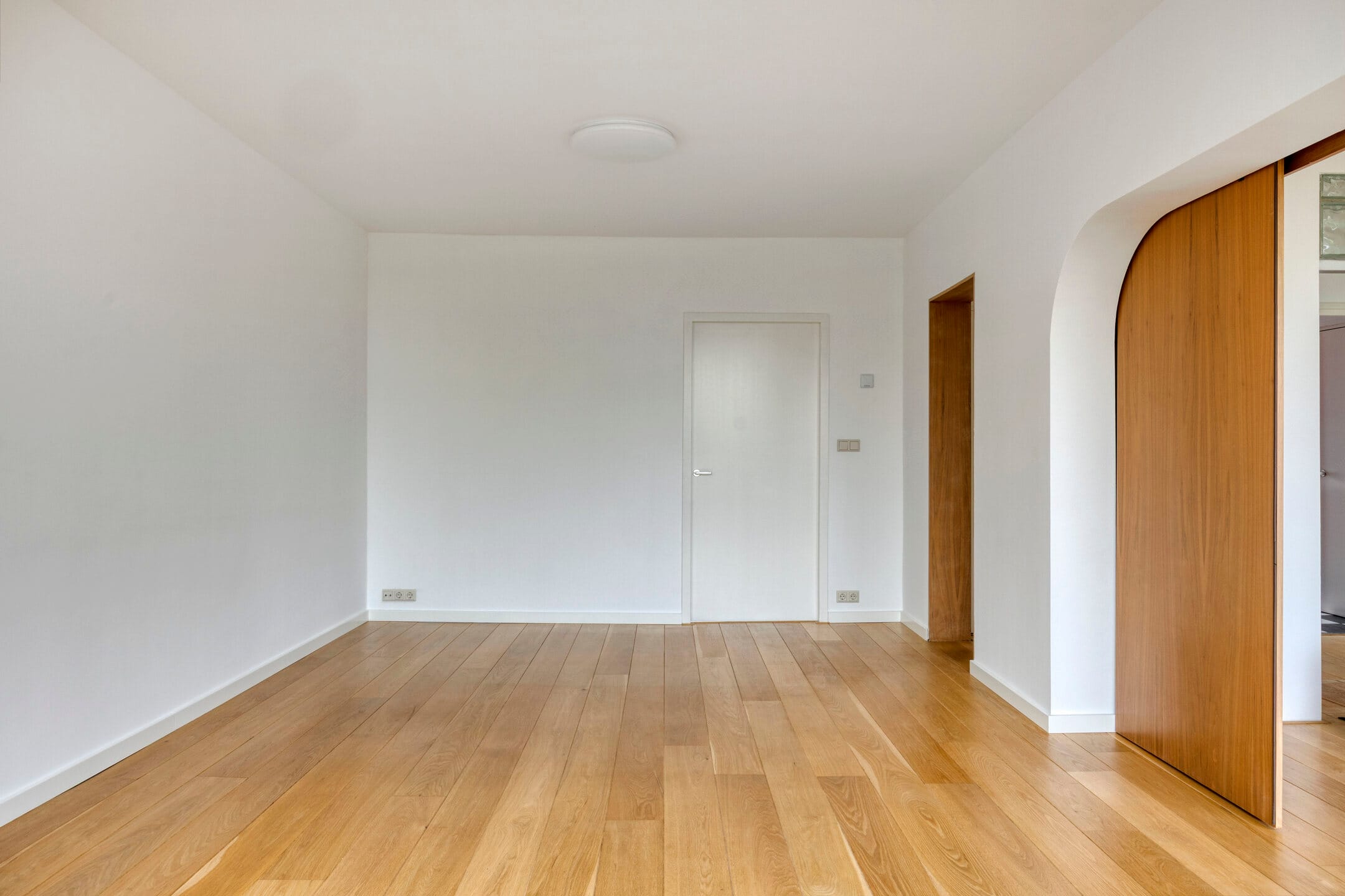 The wide, light hallway gives access to the first bedroom, equipped with a built-in closet and washing machine/dryer connections. The second bedroom has large windows and is directly connected to the expanded en-suite bathroom. A third room, currently accessible through a round passage with sliding door, can easily be arranged as a bedroom, study, or even a dining room.