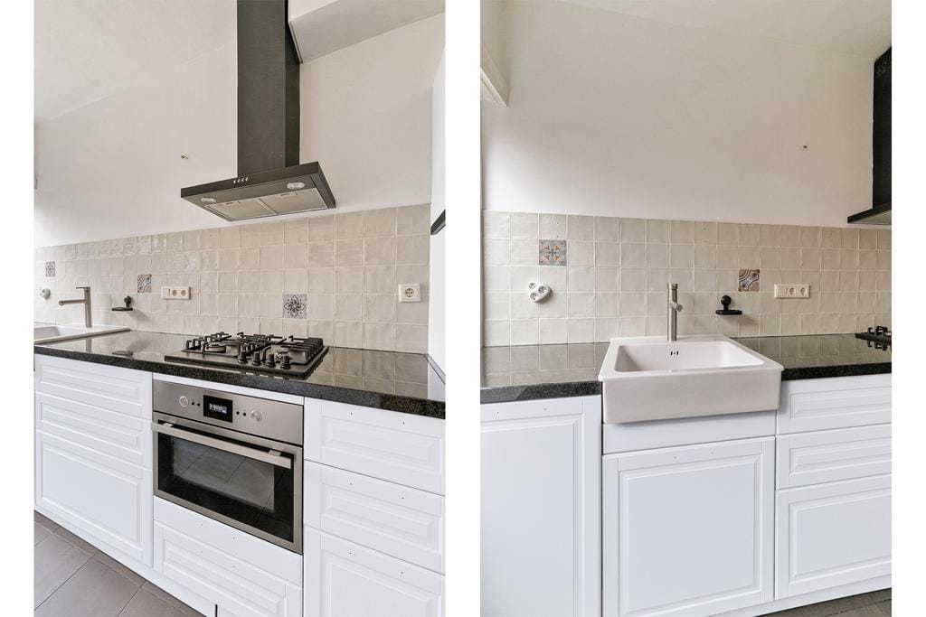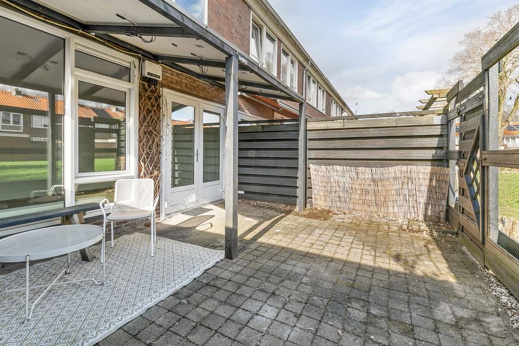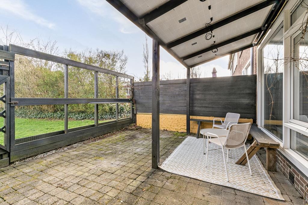 At the end of the spacious and deep (6.8 m) front garden you arrive at the front door. A roof has been placed at the beginning, suitable for storing a motorcycle or bicycles. Inside the hall, the large marble tiled floor is immediately noticeable. These tiles give the room a very luxurious and open appearance. On the right is a utility room, which also has the entrance to the detached toilet. The entrance to the bathroom is located opposite the front door. This is a building construction that is typical of 1940s homes. These areas can be extended to the utility room, creating a large bathroom. A door with a glass insert has been placed on the left side of the hall. This gives the hall a lot of natural light, because it runs in line with the large rear window. Behind the door you will find access to the basement on the right and the kitchen on the left. The very modern kitchen is equipped with a four-burner hob, extractor hood, fridge-freezer combination, combination microwave and a large country sink with mixer tap. Upon entering the living room, you immediately notice the beautiful wooden floor. This is richly illuminated by the large windows and the French doors. In the corner of the room you will also find a closet, ideal for storing things that you would rather not have in direct view! From the French doors you walk into the covered terrace of the backyard. Here you can enjoy drinks with friends and family until late in the evening.