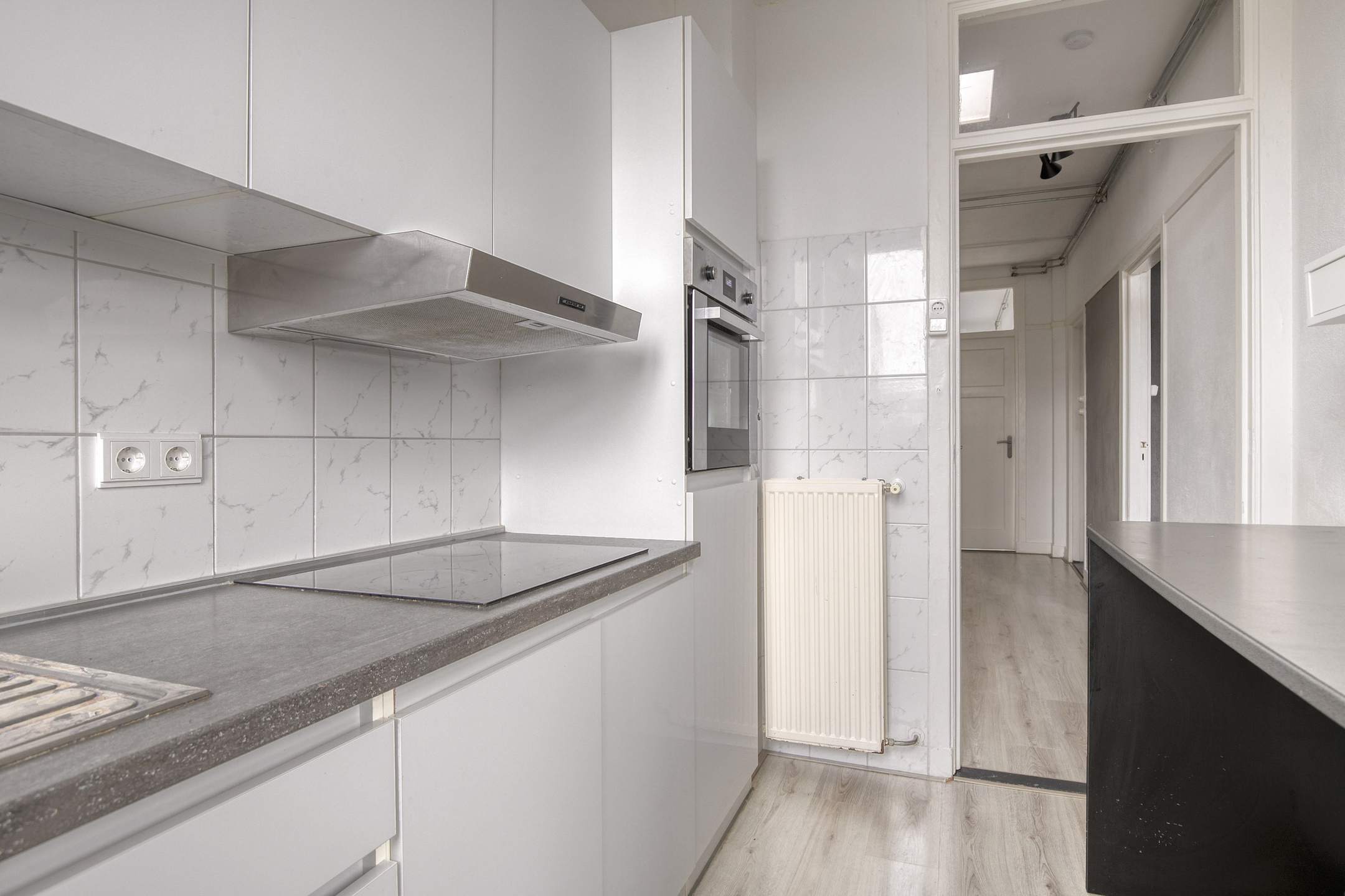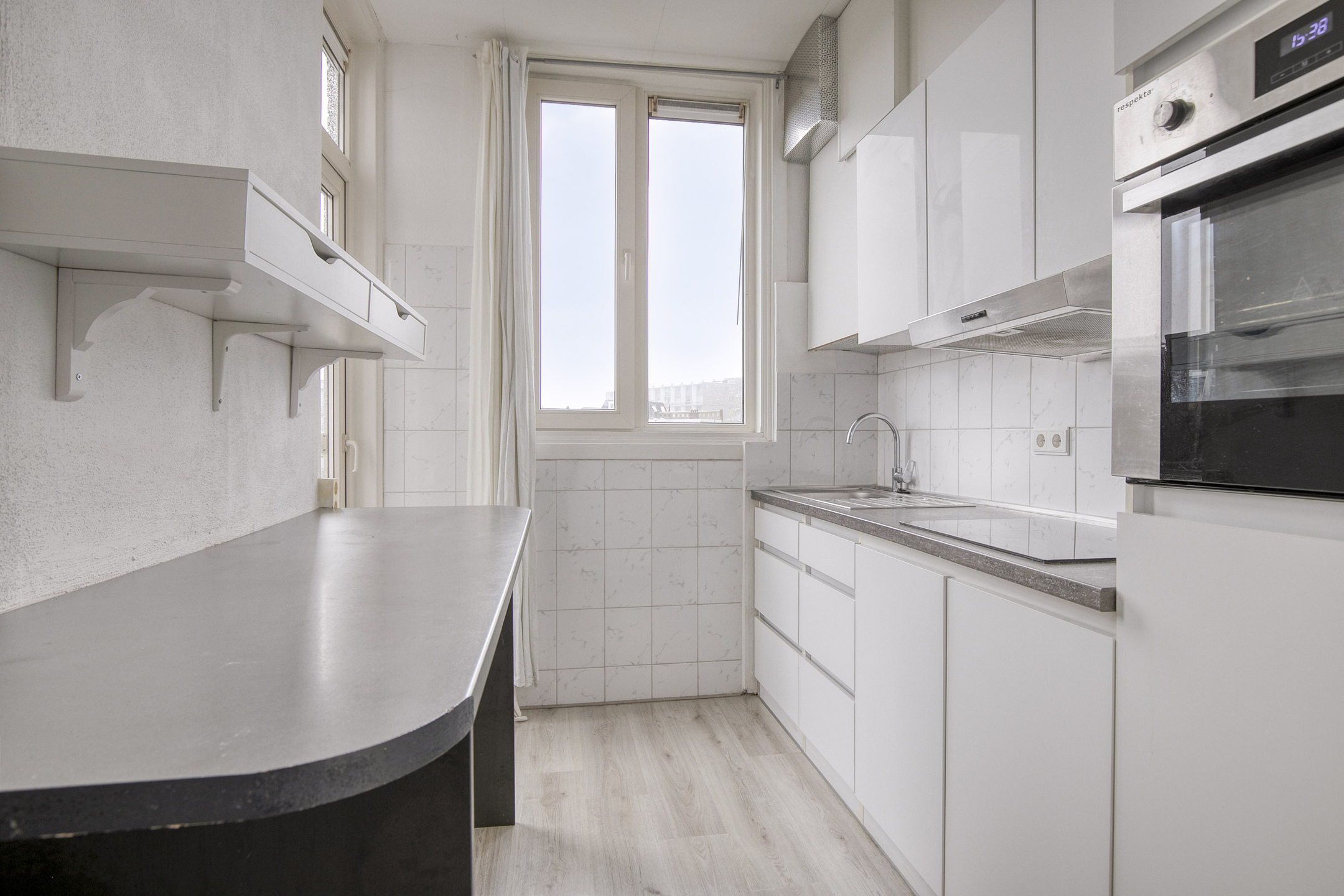 Vanuit de hal betreedt u de keuken, die praktisch is ingericht met een langwerpig werkblad en diverse inbouwapparatuur zoals een inductiekookplaat, afzuigkap, oven, koelkast en spoelbak. Hier is voldoende ruimte om comfortabel te koken en uw keukenbenodigdheden op te bergen. Daarnaast beschikt de keuken over een extra werkblad voor meer werkoppervlak. Hoewel de keuken in functionele staat verkeert, kan deze – indien gewenst – naar eigen smaak worden gemoderniseerd. Vanuit deze ruimte heeft u direct toegang tot het balkon.