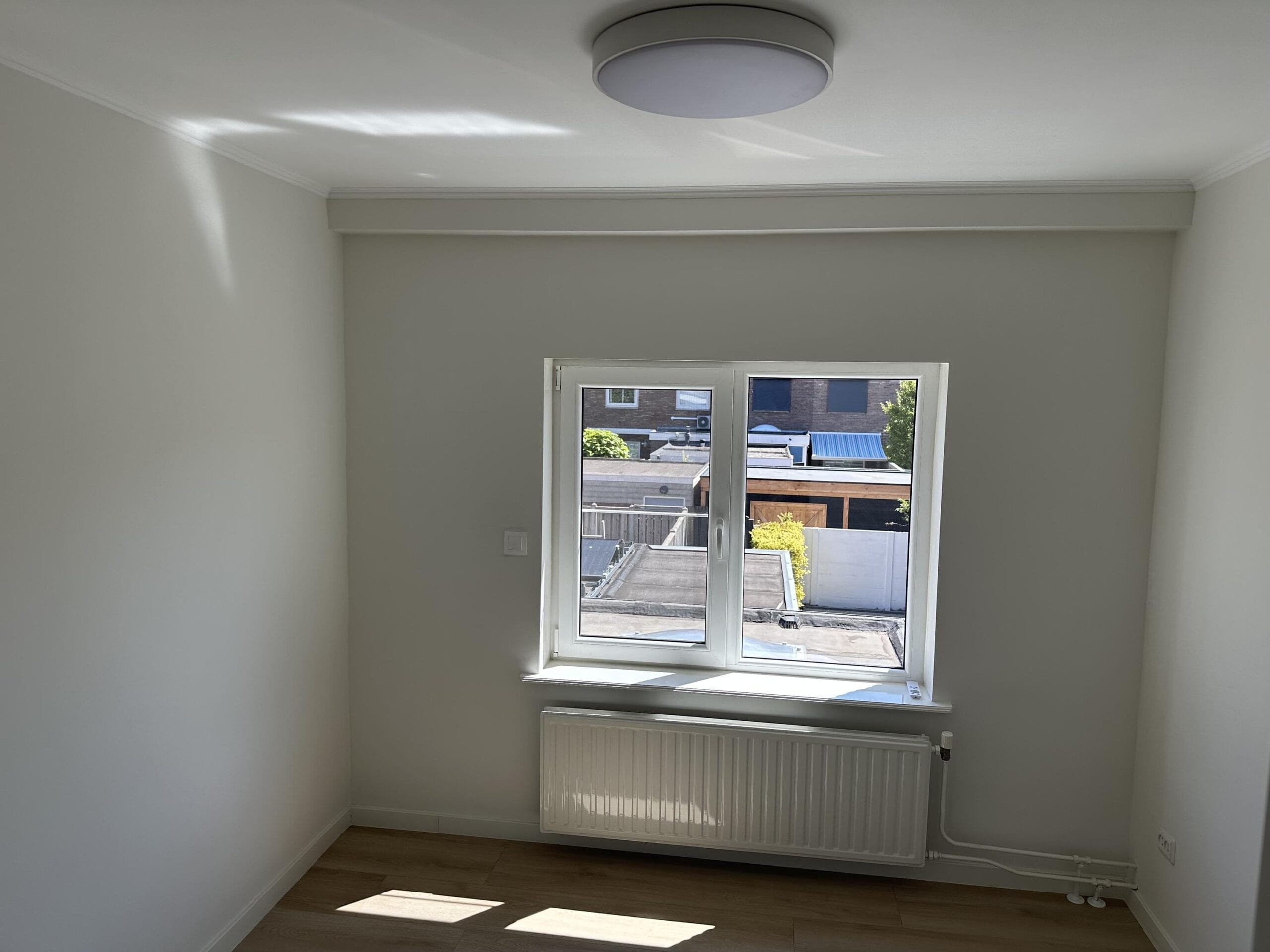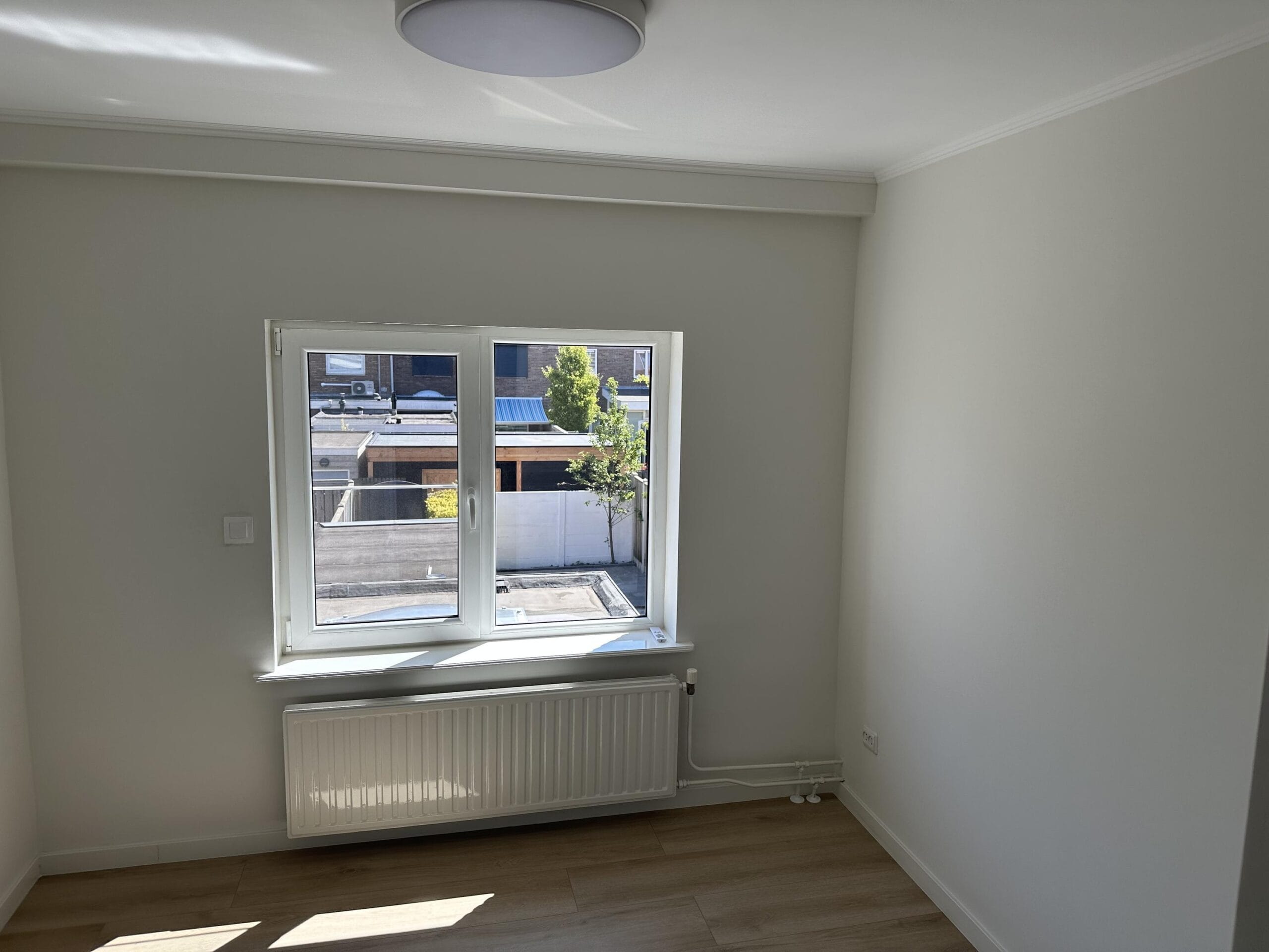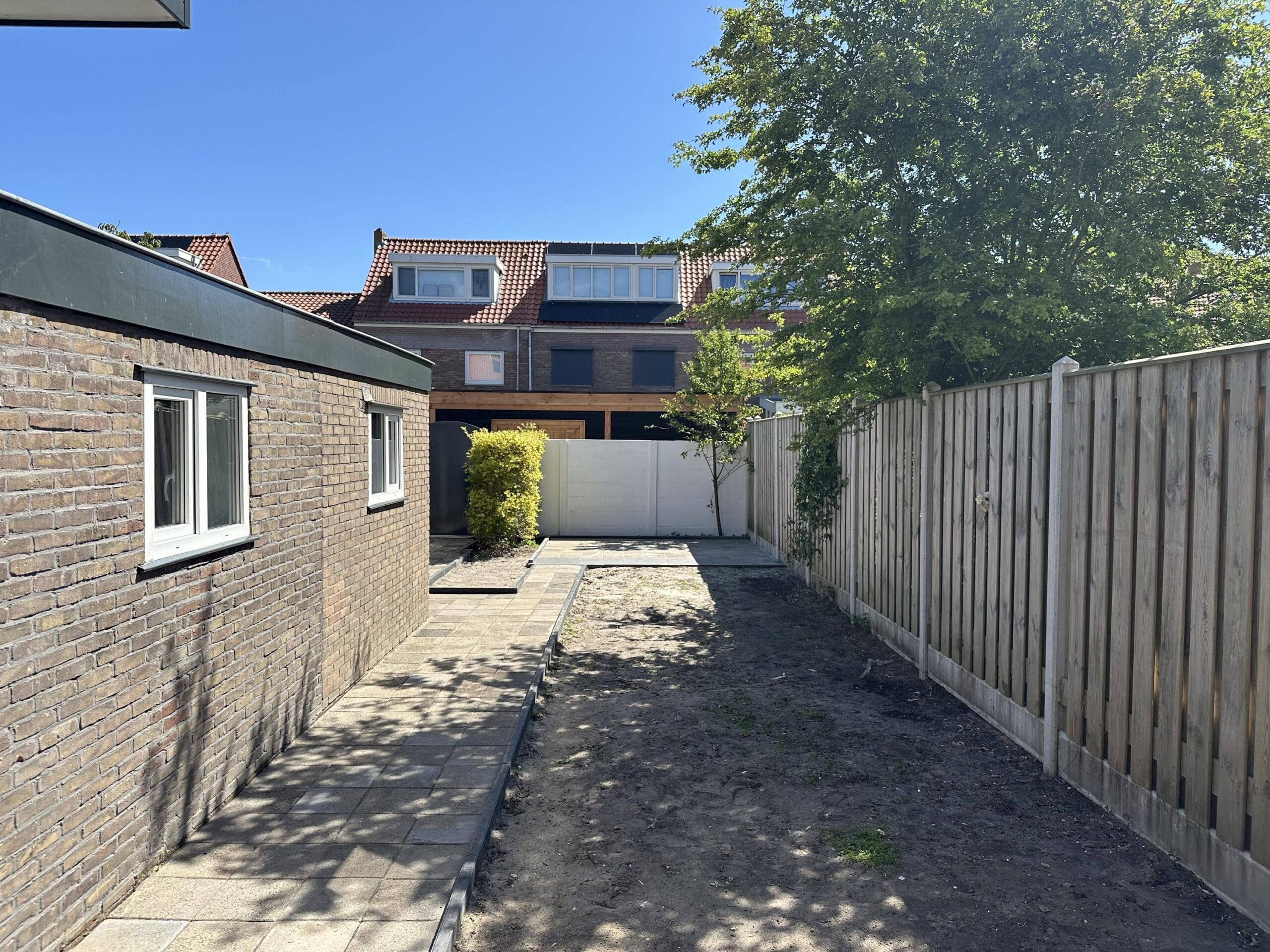 De woning beschikt over een royale, zonnige tuin van circa 75 m² met een praktische achterom, ideaal voor wie graag buiten leeft of kinderen een veilige speelplek wil bieden. Via de trap in de woonkamer kom je op de eerste verdieping. Hier vind je drie ruime, lichte en volledig opgeknapte slaapkamers, allemaal netjes afgewerkt en instapklaar. De moderne badkamer is voorzien van een inloopdouche, een extra toilet en een stijlvolle wastafel.