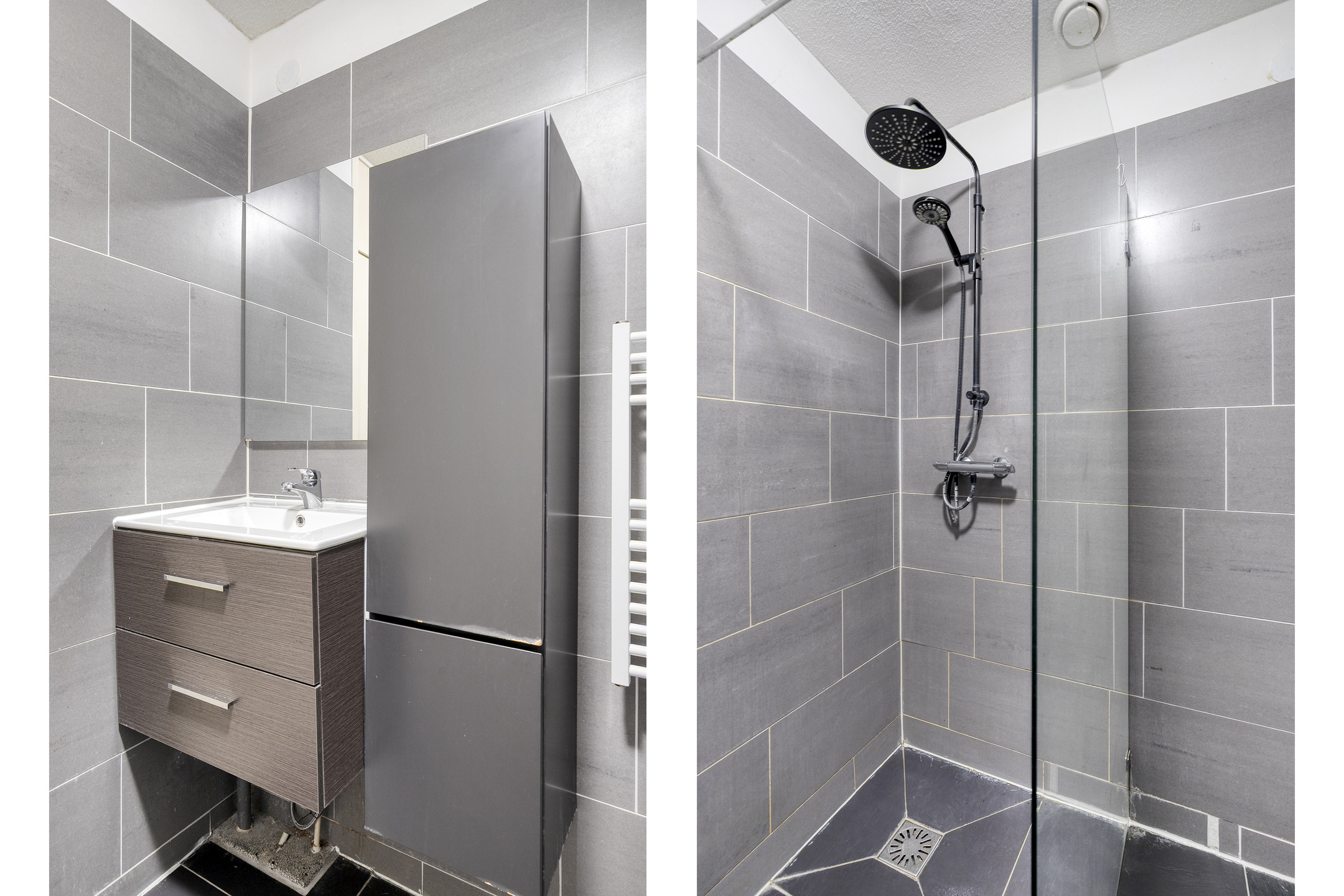 Through the well-maintained communal entrance, you reach the first floor via the stairs. The spacious hallway provides access to all rooms and offers an immediate sense of welcome. The separate toilet features modern sanitary ware, including a wall-mounted toilet and a small washbasin. The adjacent fully tiled bathroom is equipped with a walk-in rain shower, washbasin cabinet and space for an additional storage unit.