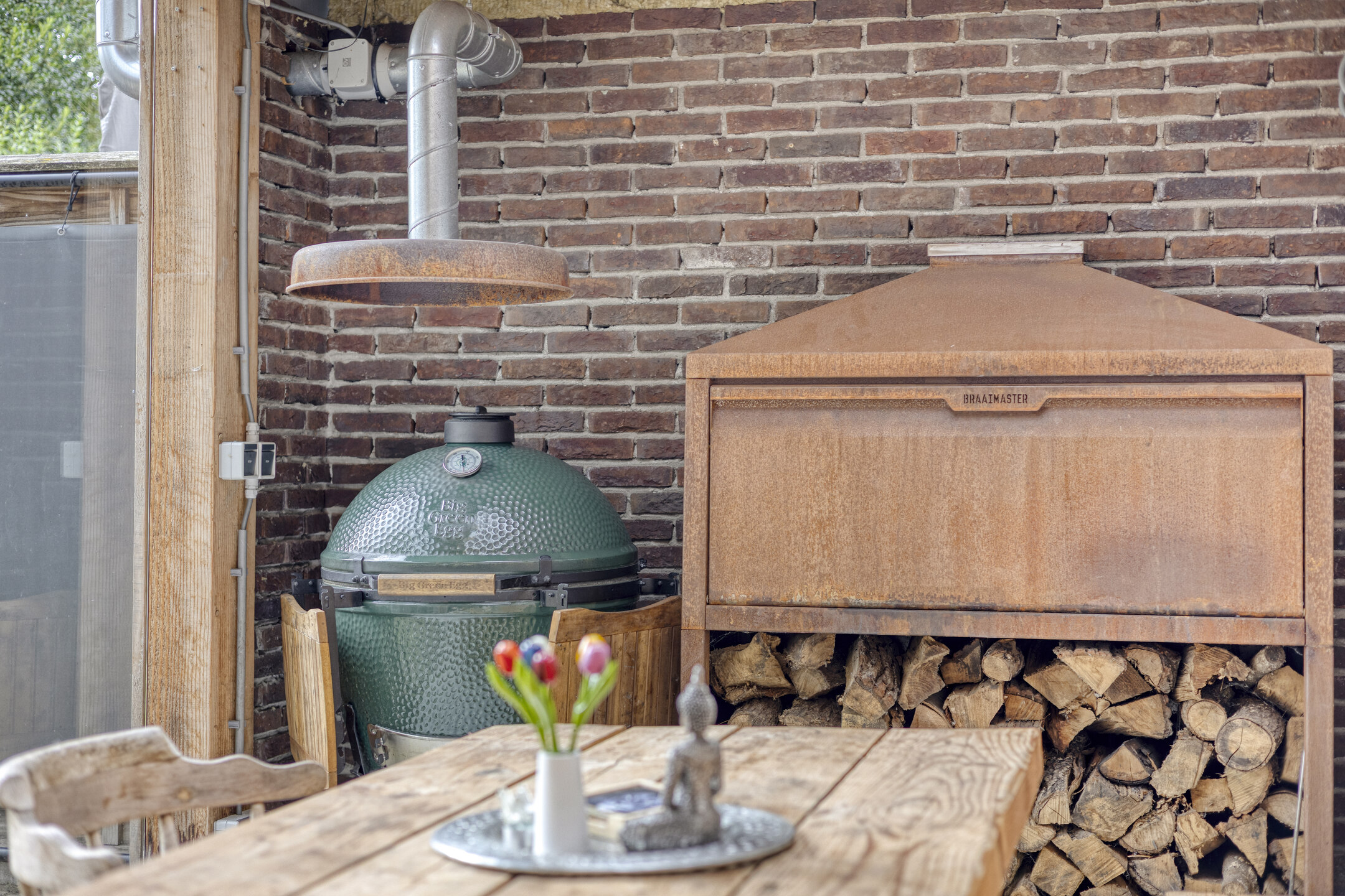 Een bijzonder detail is de achtergevel, die volledig is afgewerkt met houten shingles – een warme en natuurlijke uitstraling die perfect aansluit bij de landelijke keuken en het hoogwaardige afwerkingsniveau in de rest van de woning.