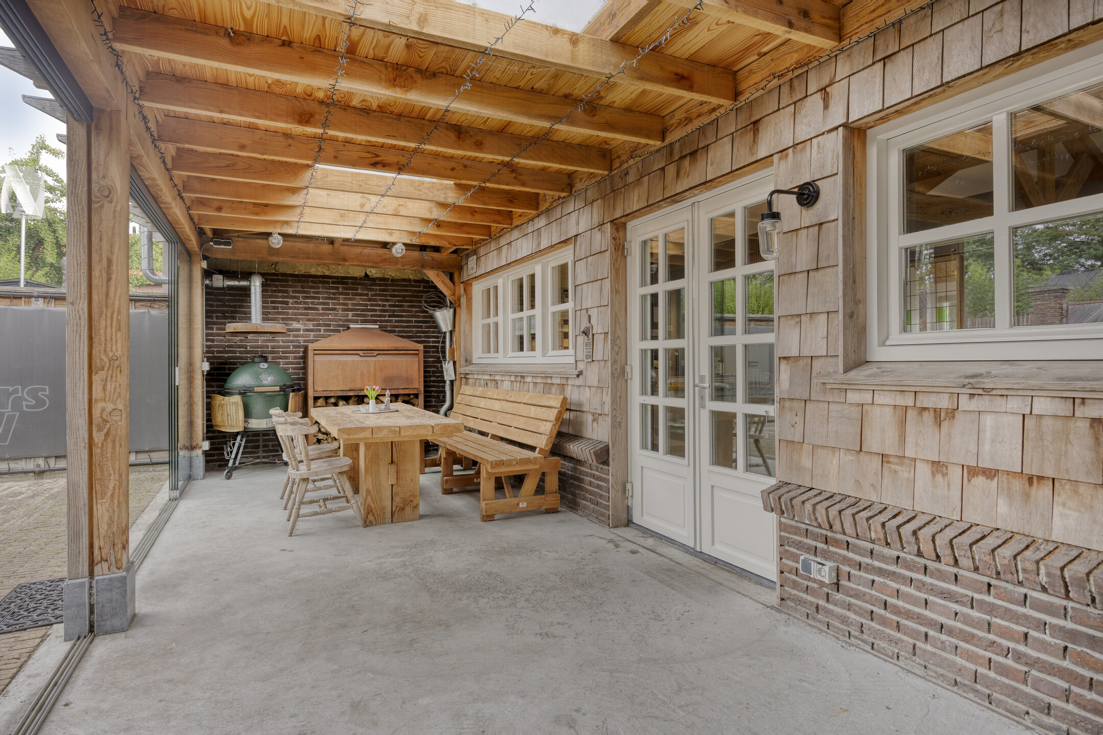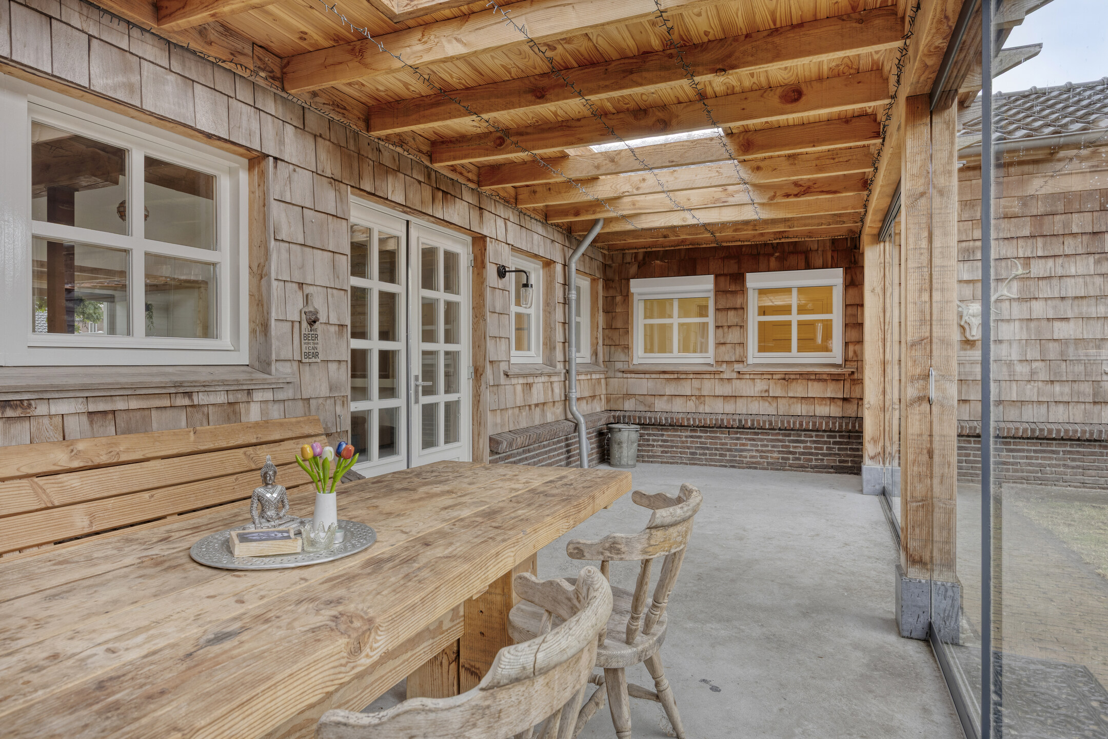De tuin is onderhoudsvriendelijk aangelegd. De grote veranda met glazen pui is volledig afsluitbaar, waardoor u hier het hele jaar door kunt genieten van een extra leefruimte in direct contact met buiten. Achter in de tuin vindt u tevens een handige berging.De gevelbekleding aan de achterzijde bestaat uit hoogwaardige houten shingles, wat deze woning niet alleen karaktervol maakt, maar ook extra isolatie biedt.