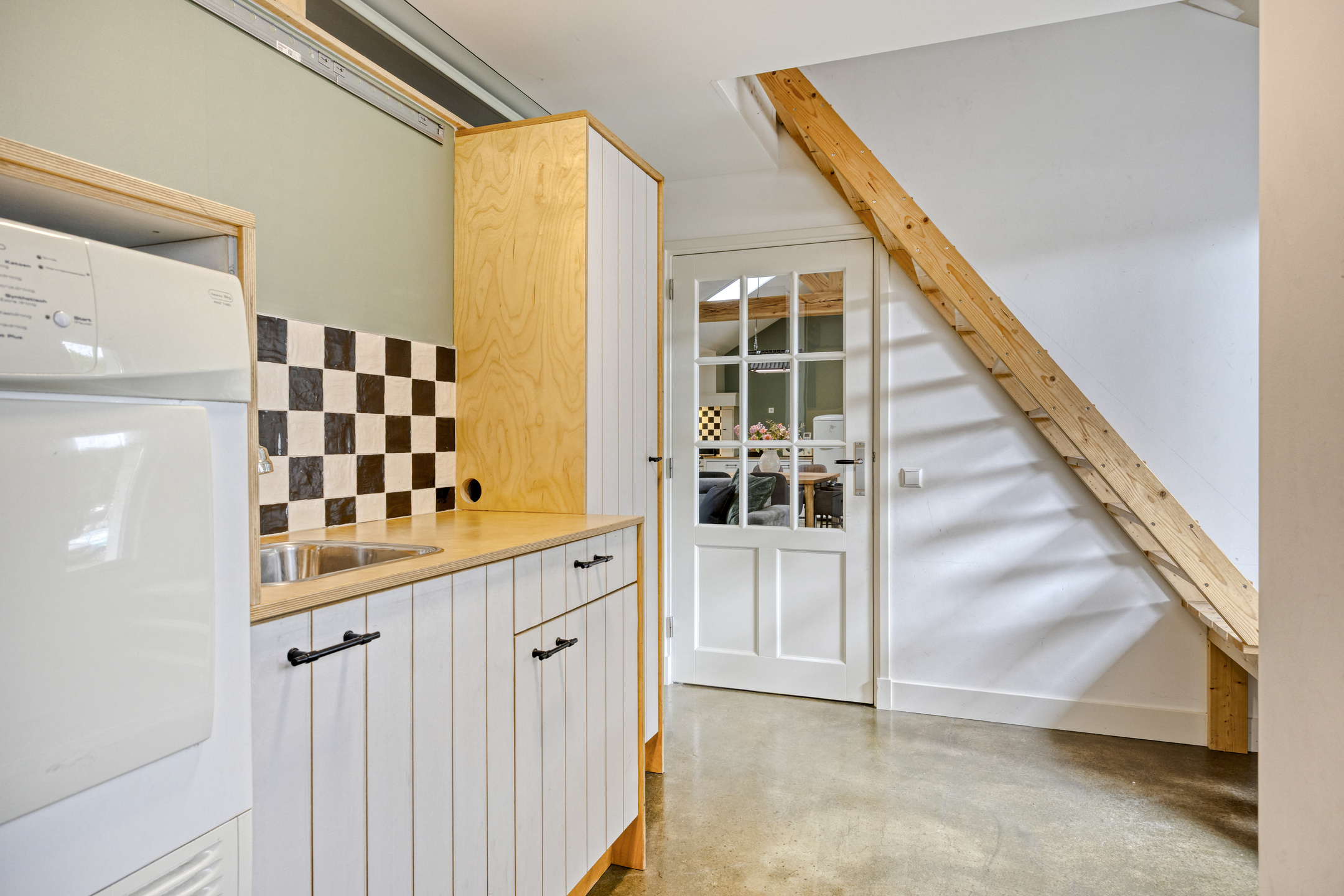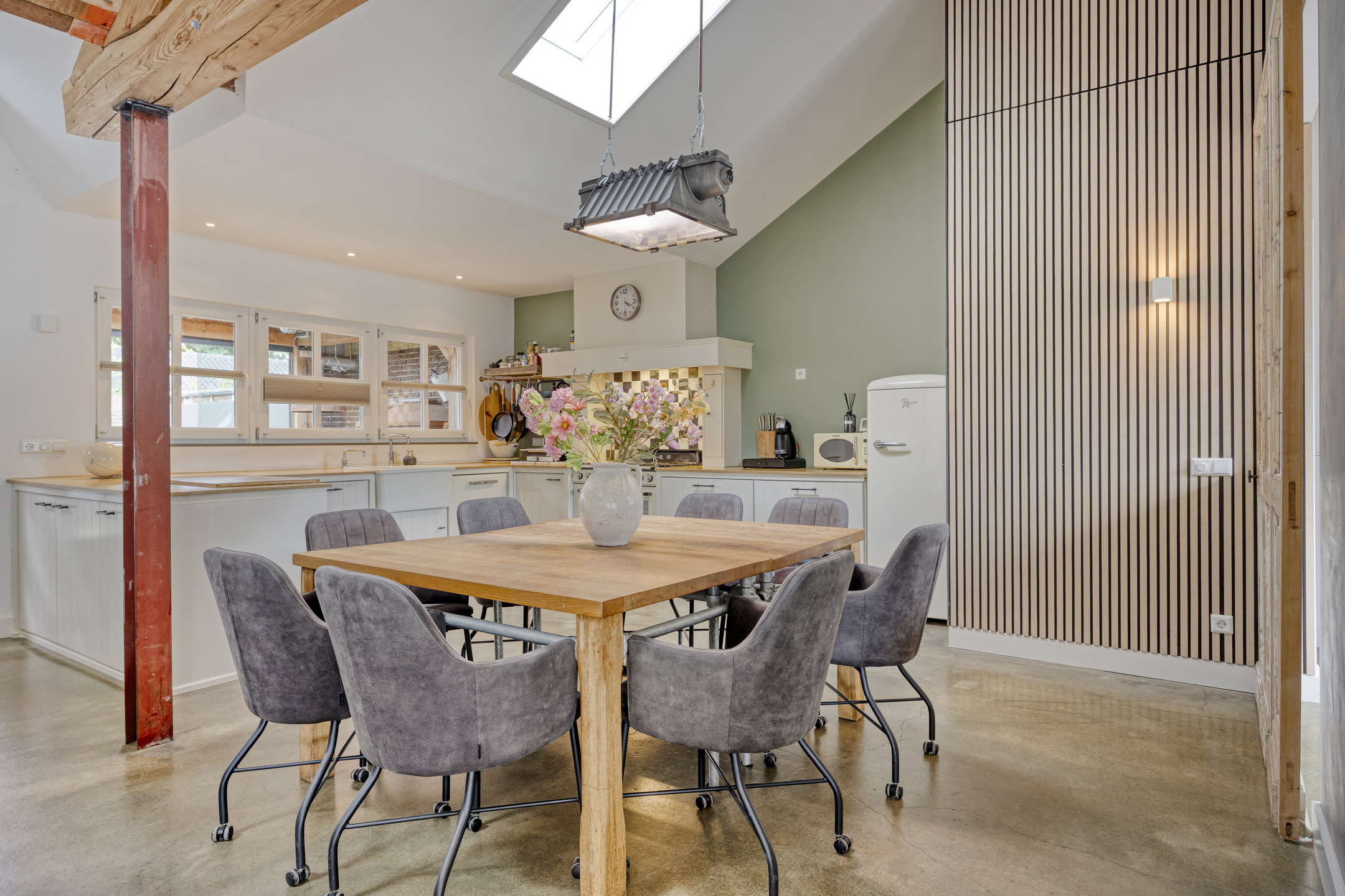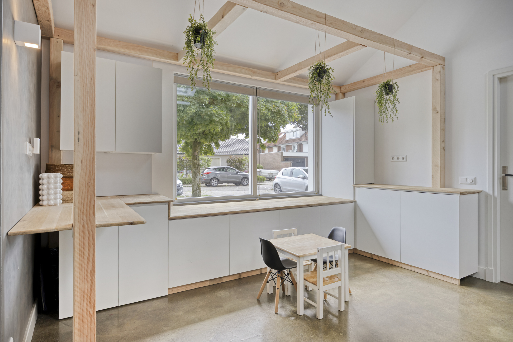 Via de centrale hal met een apart toilet betreedt u de woning. Een stijlvolle schuifdeur leidt u naar de open keuken in landelijke stijl, die naadloos overgaat in de lichte woonkamer. De keuken is uitgerust met hoogwaardige inbouwapparatuur en biedt volop werkruimte. De woonkamer wordt gekenmerkt door grote raampartijen en een dakraam, waardoor er veel natuurlijk licht naar binnen valt.