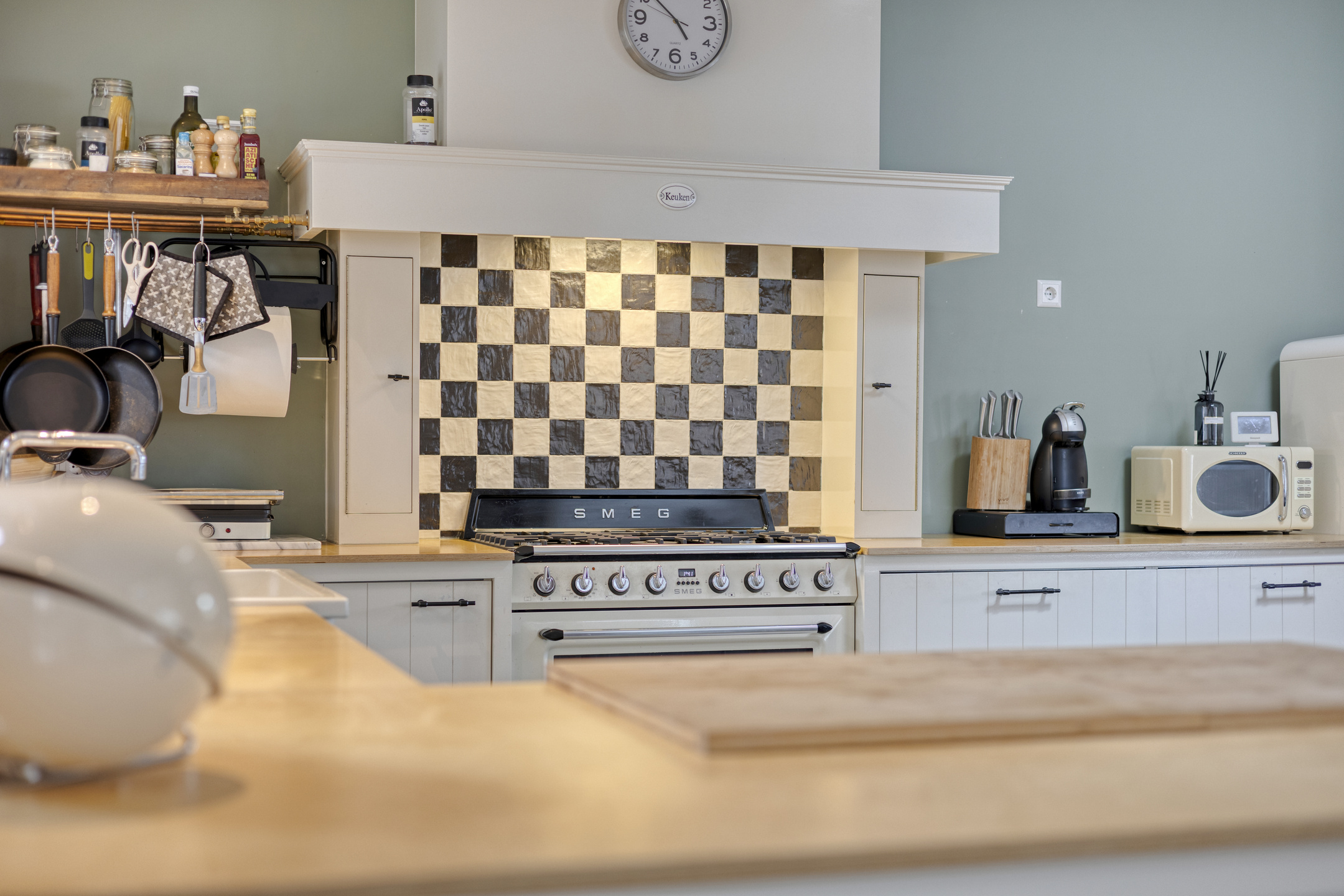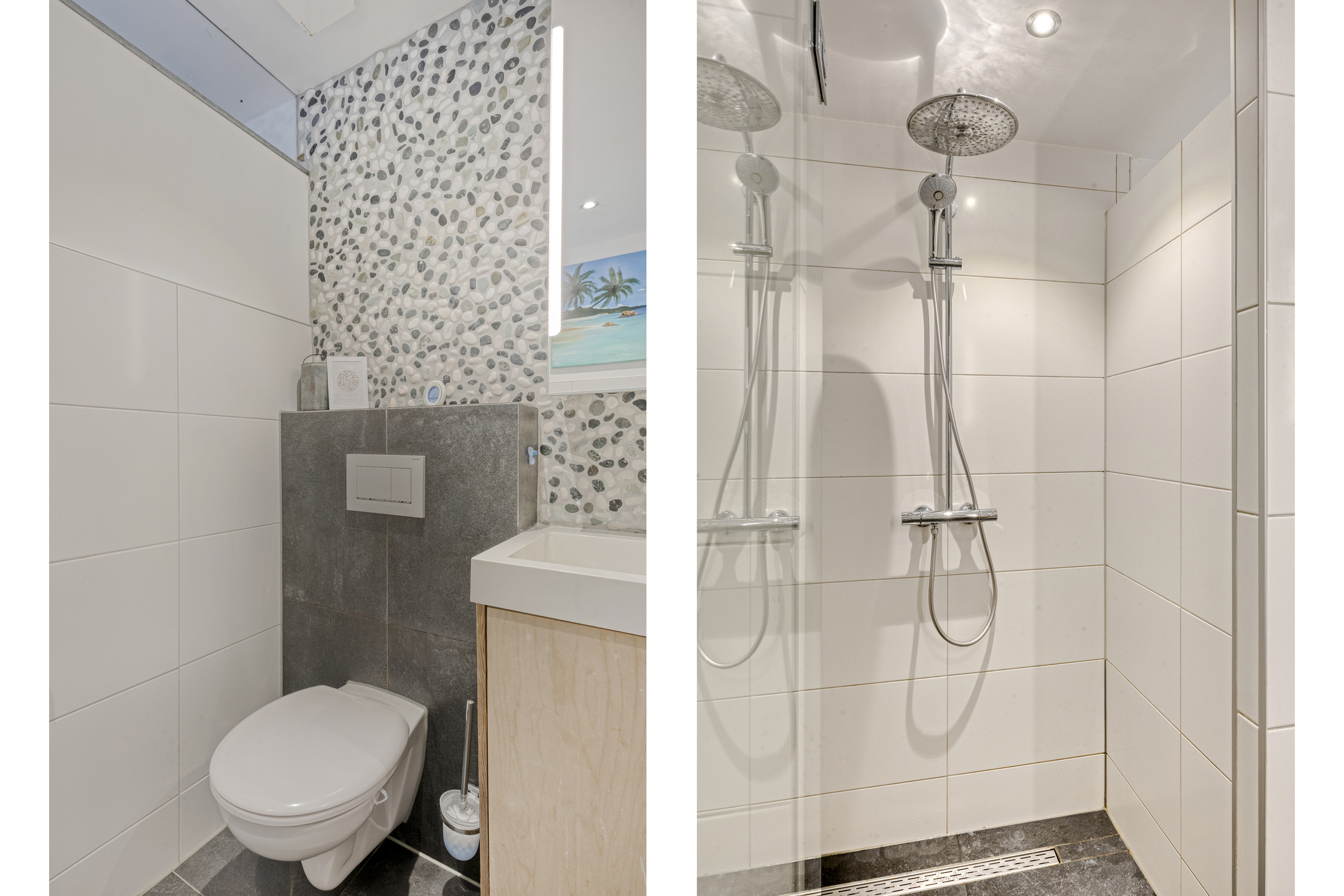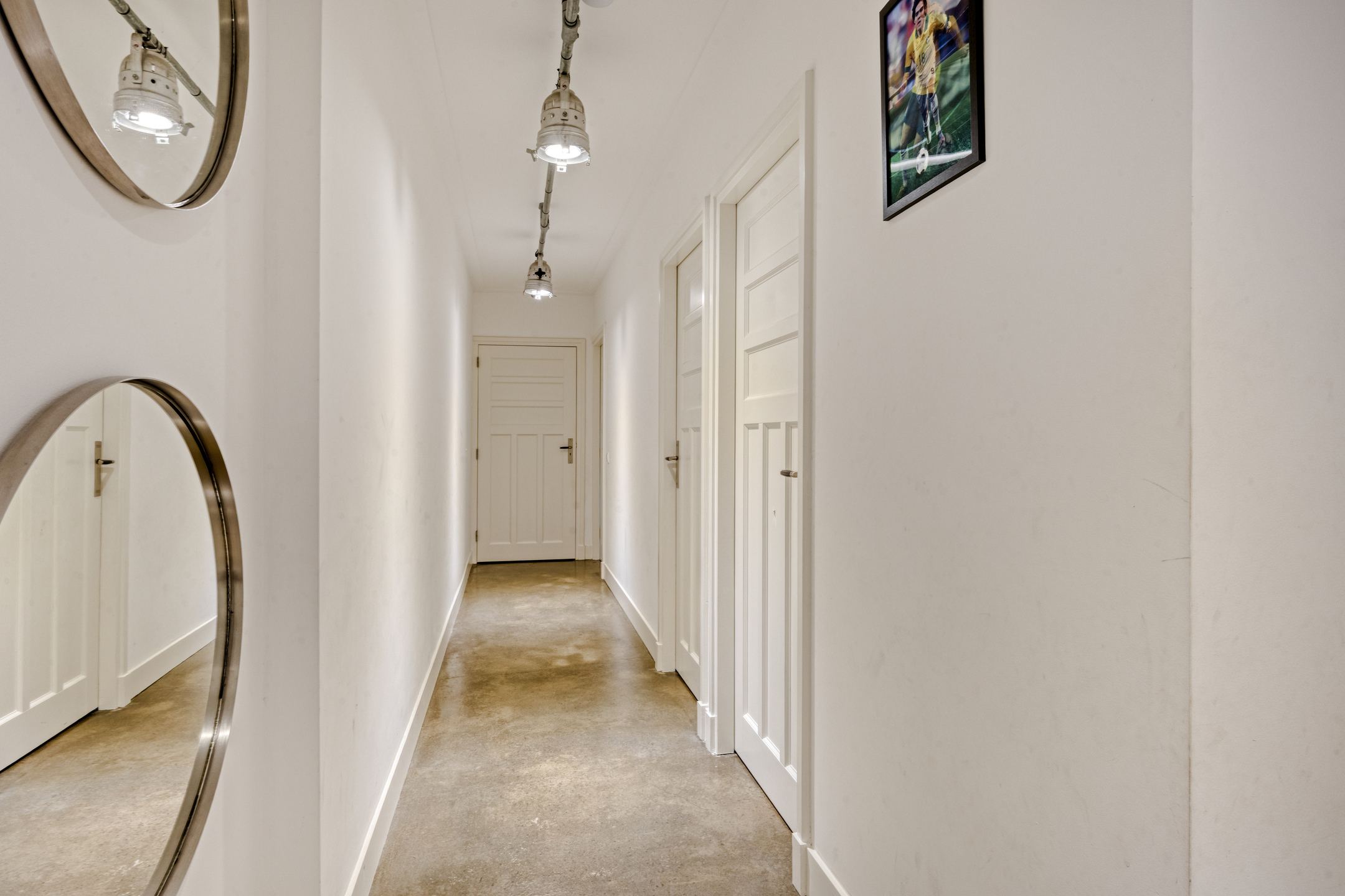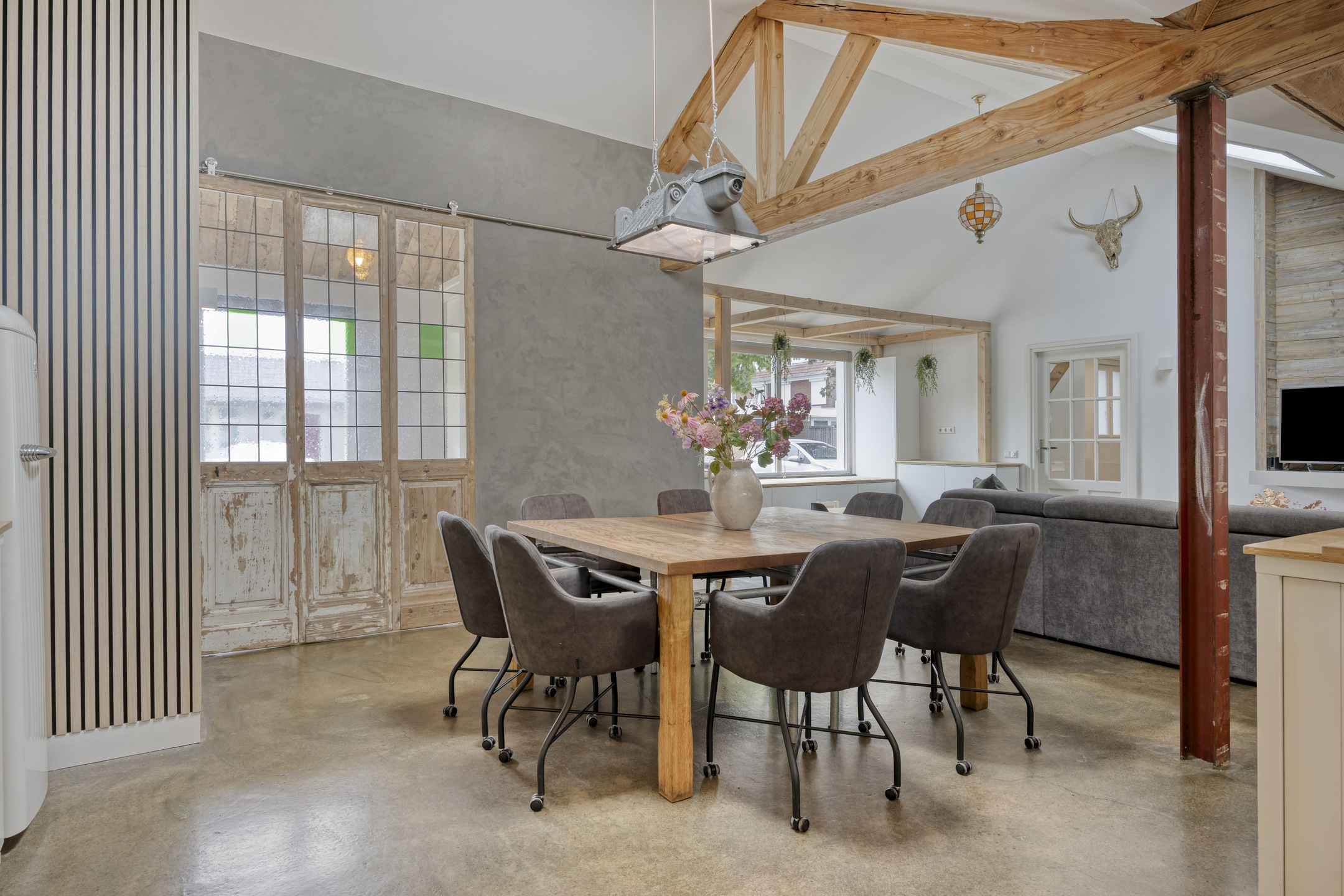 Via de centrale hal met een apart toilet betreedt u de woning. Een stijlvolle schuifdeur leidt u naar de open keuken in landelijke stijl, die naadloos overgaat in de lichte woonkamer. De keuken is uitgerust met hoogwaardige inbouwapparatuur en biedt volop werkruimte. De woonkamer wordt gekenmerkt door grote raampartijen en een dakraam, waardoor er veel natuurlijk licht naar binnen valt.
