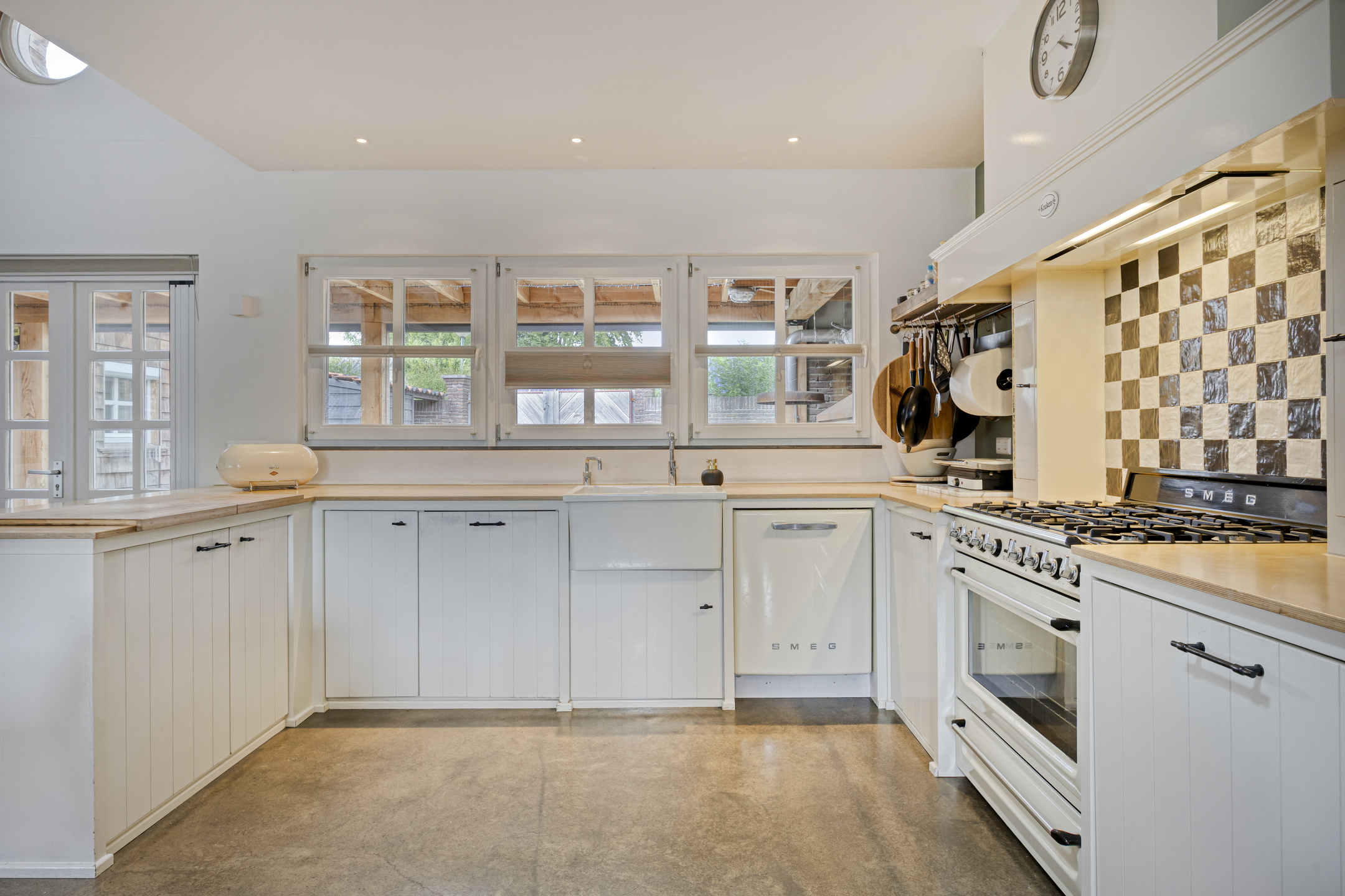 Enter through the central hall with a separate toilet. A stylish sliding door leads to the open country-style kitchen, which flows seamlessly into the bright living room. The kitchen is equipped with high-end built-in appliances and offers plenty of workspace. Large windows and a skylight flood the living area with natural light.
