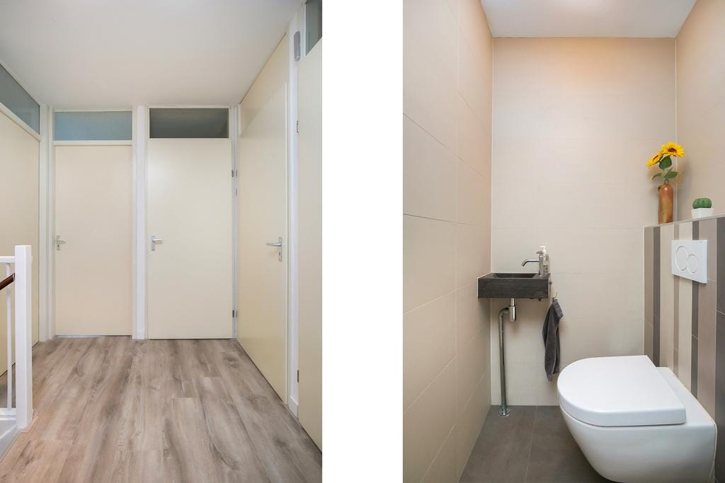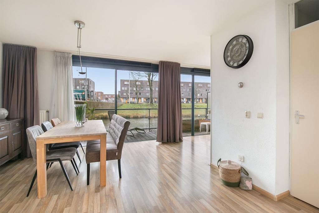 From the hallway, you walk down the stairs and enter the corridor of the ground floor. At the moment, the spaces on this floor are separated by walls. There is a neat kitchen and next to the living and dining room, there is also an additional closet space and storage room. However, you can also choose to break through these walls and create a large open space. Due to the generous dimensions of this floor, you create the feeling of a loft, with the icing on the cake being the view over the water from the terrace. The window spanning the entire width of over 6 meters provides an incredible amount of natural light to this floor. In short: a ready-to-move-in home with a beautiful ground floor that you can also transform according to your own taste!