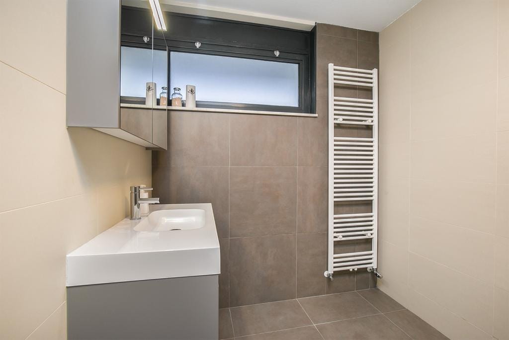 On the exterior of the building, the video intercom system is installed, allowing you to let guests in. Through the central and enclosed hallway with mailboxes, access to the apartment is located on the ground floor. To the right of the front door is a separate space for district heating, fiber optic, and electrical connections. Upon entering the apartment, the openness and spaciousness of the hallway immediately catch the eye. This hallway provides access to various rooms. Behind the first door on the right is the separate toilet. This is in a very modern state and features a small sink. Also on this floor, you will find the spacious bathroom. A tasteful combination of sleek dark and light tiles adorns the walls and floor. Additionally, the bathroom is equipped with a large vanity unit with mixer tap, a mirrored cabinet, towel warmer, and a walk-in rain shower. The largest bedroom of the apartment is located next to the bathroom. Due to its large dimensions, there is more than enough space for a double bed and a sizable wardrobe. With windows on two sides of the room, this space is naturally illuminated, giving it an open and airy character. The second bedroom is also suitable for a double bed, but you can also choose to turn it into an office or walk-in closet.