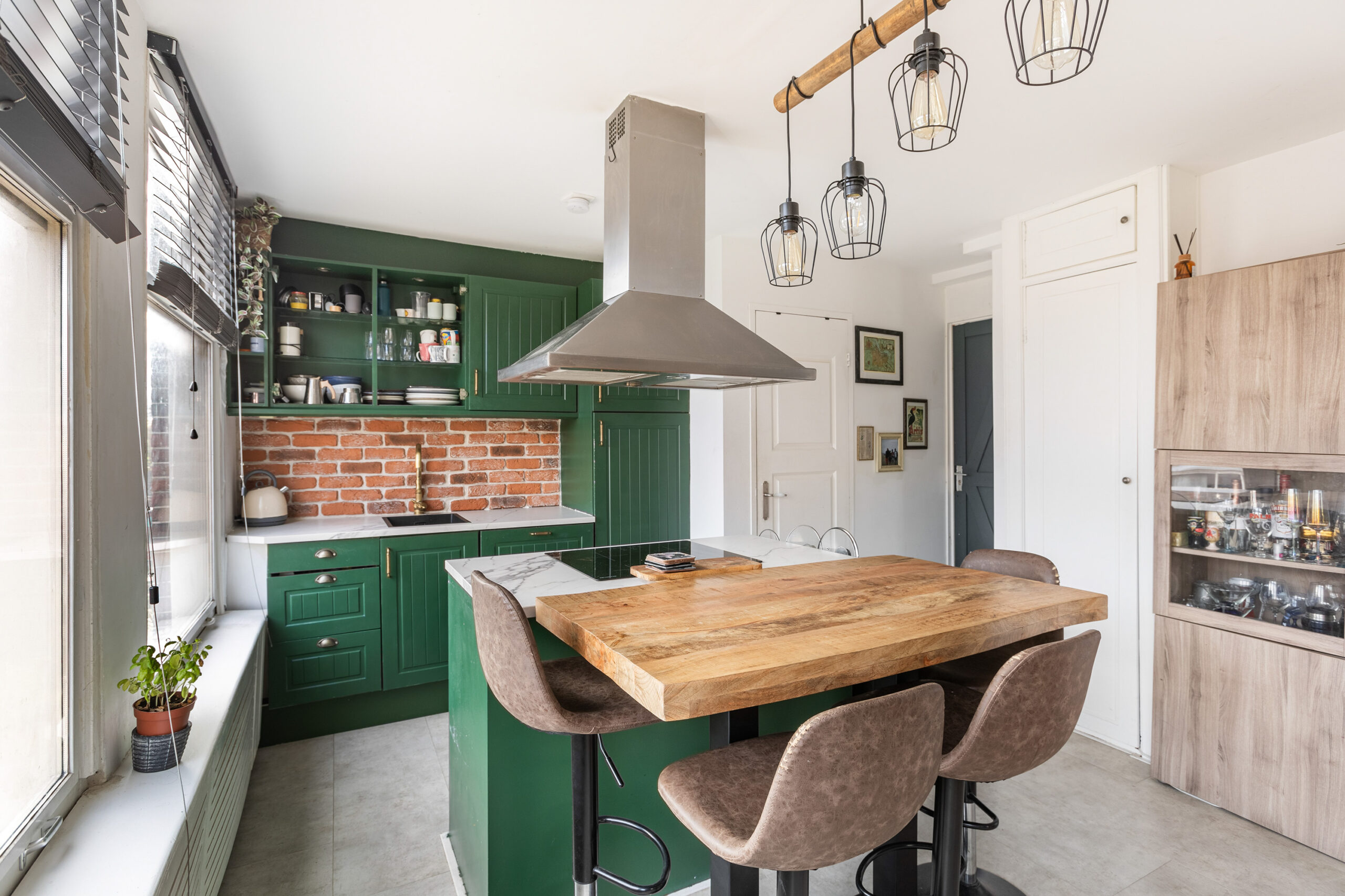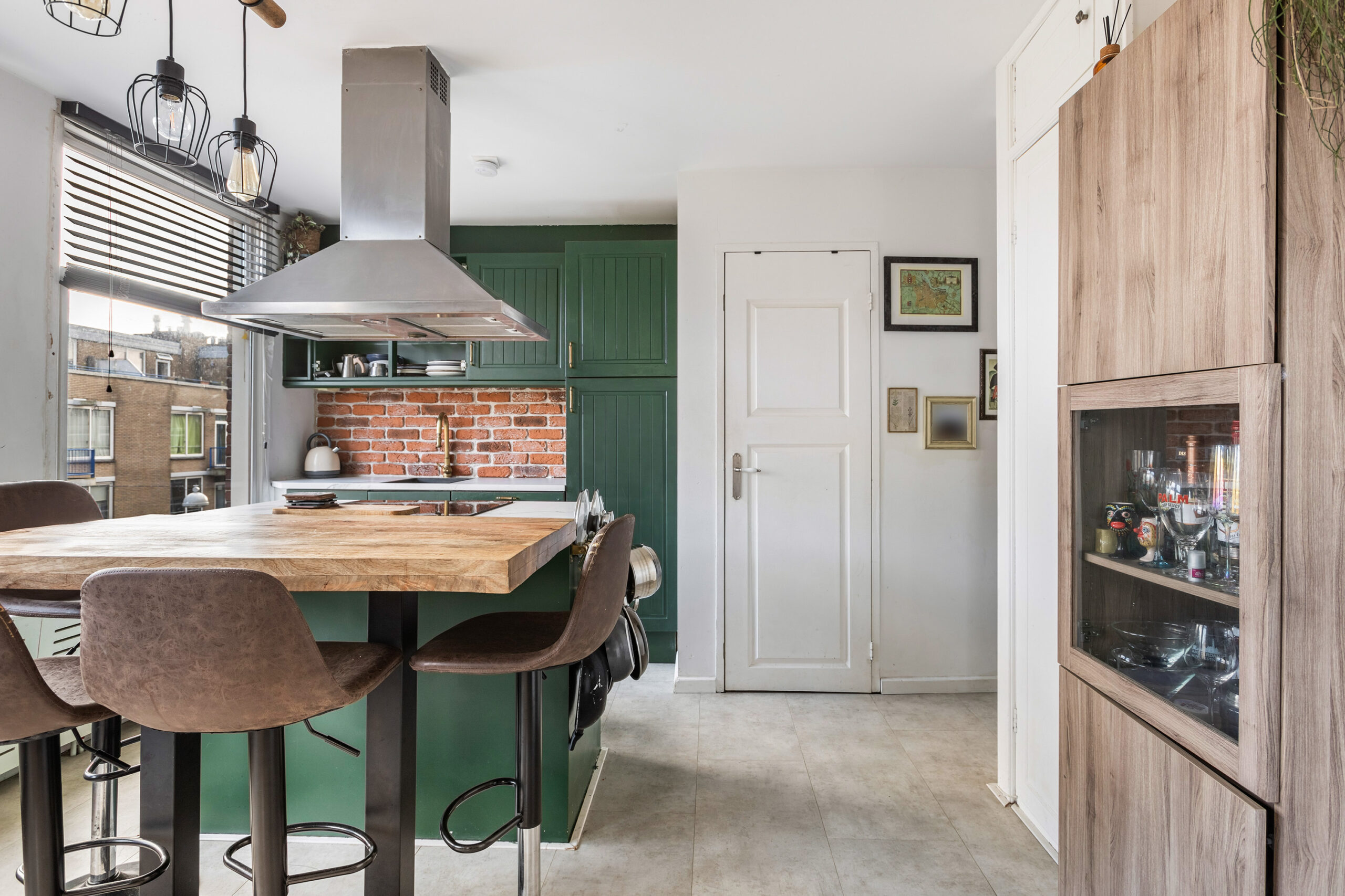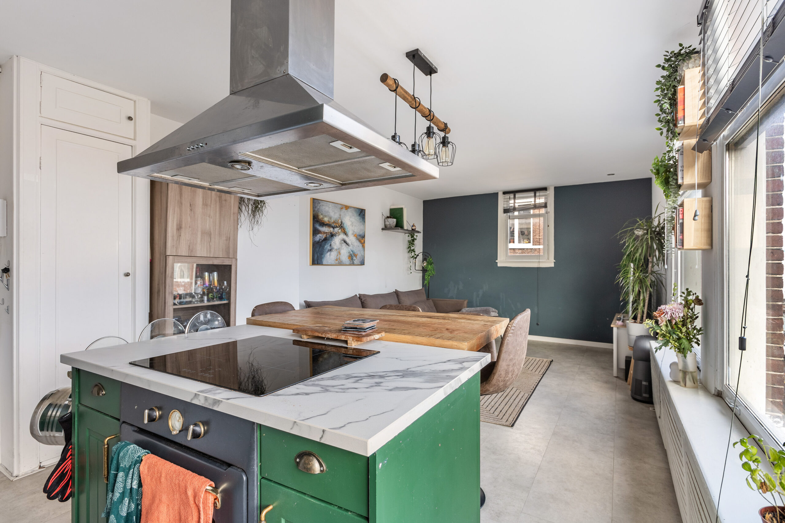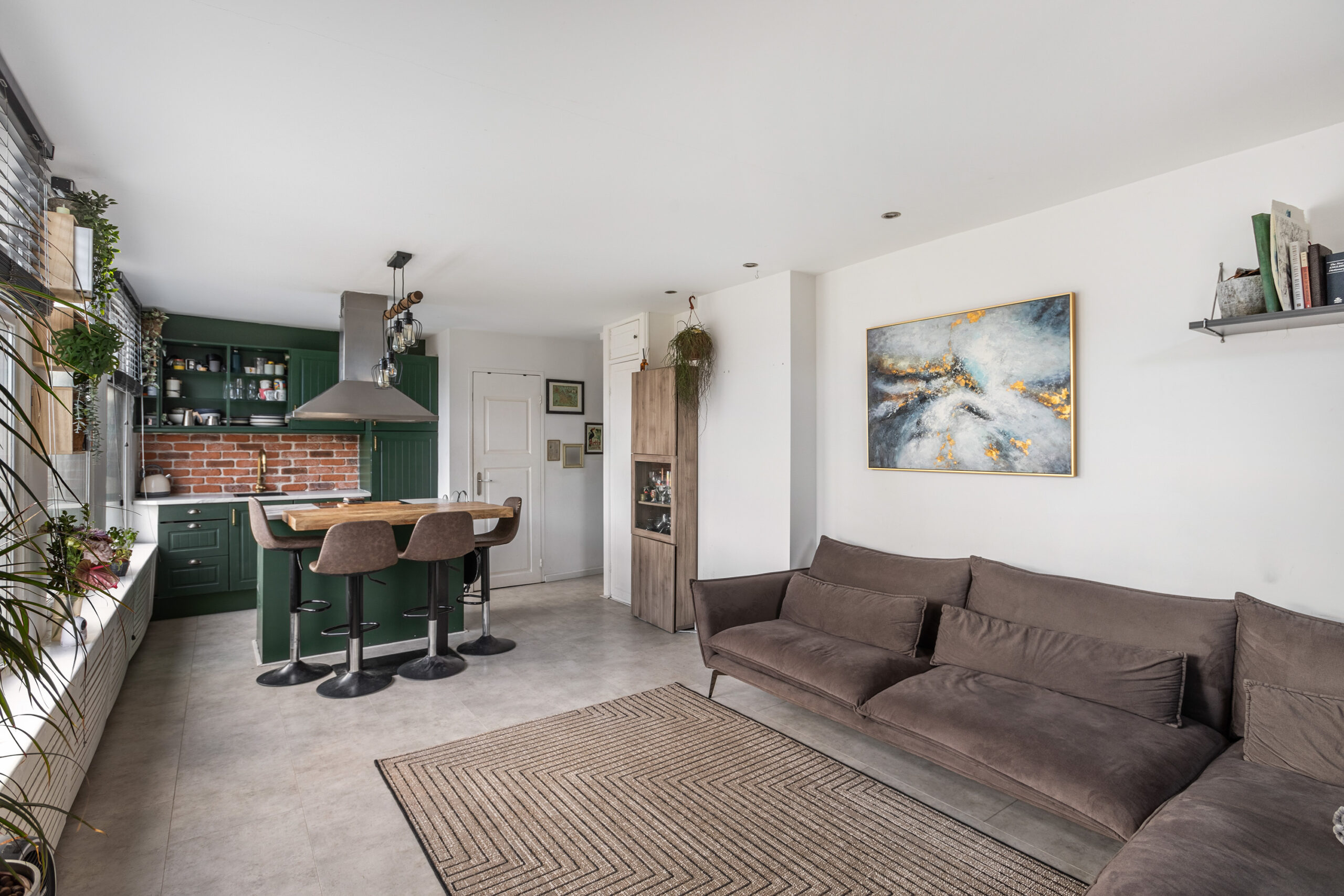 Bij binnenkomst stap je in een compacte hal met een apart toilet. Vanuit hier loop je direct door naar de moderne keuken, compleet met kookeiland en bar – een fijne plek om samen te genieten van een borrel. De woonkamer valt op door de grote ramen, die veel daglicht binnenlaten en voor een open sfeer zorgen.