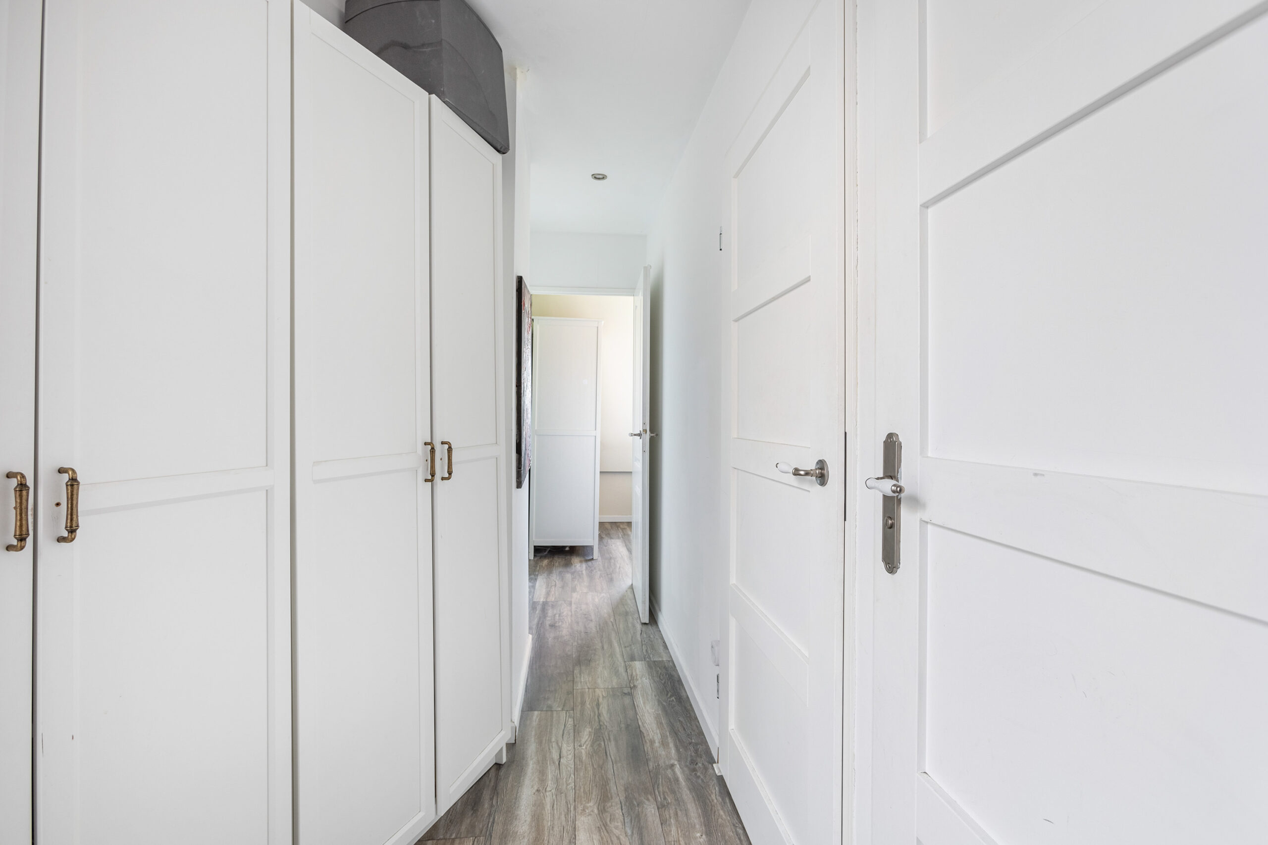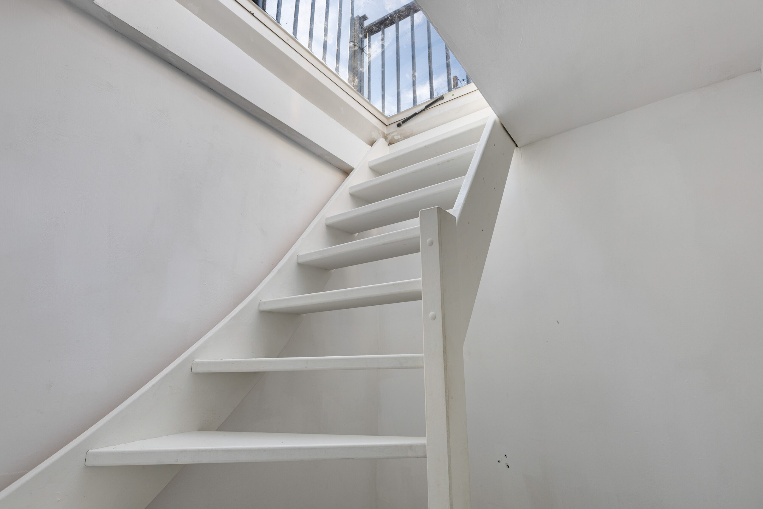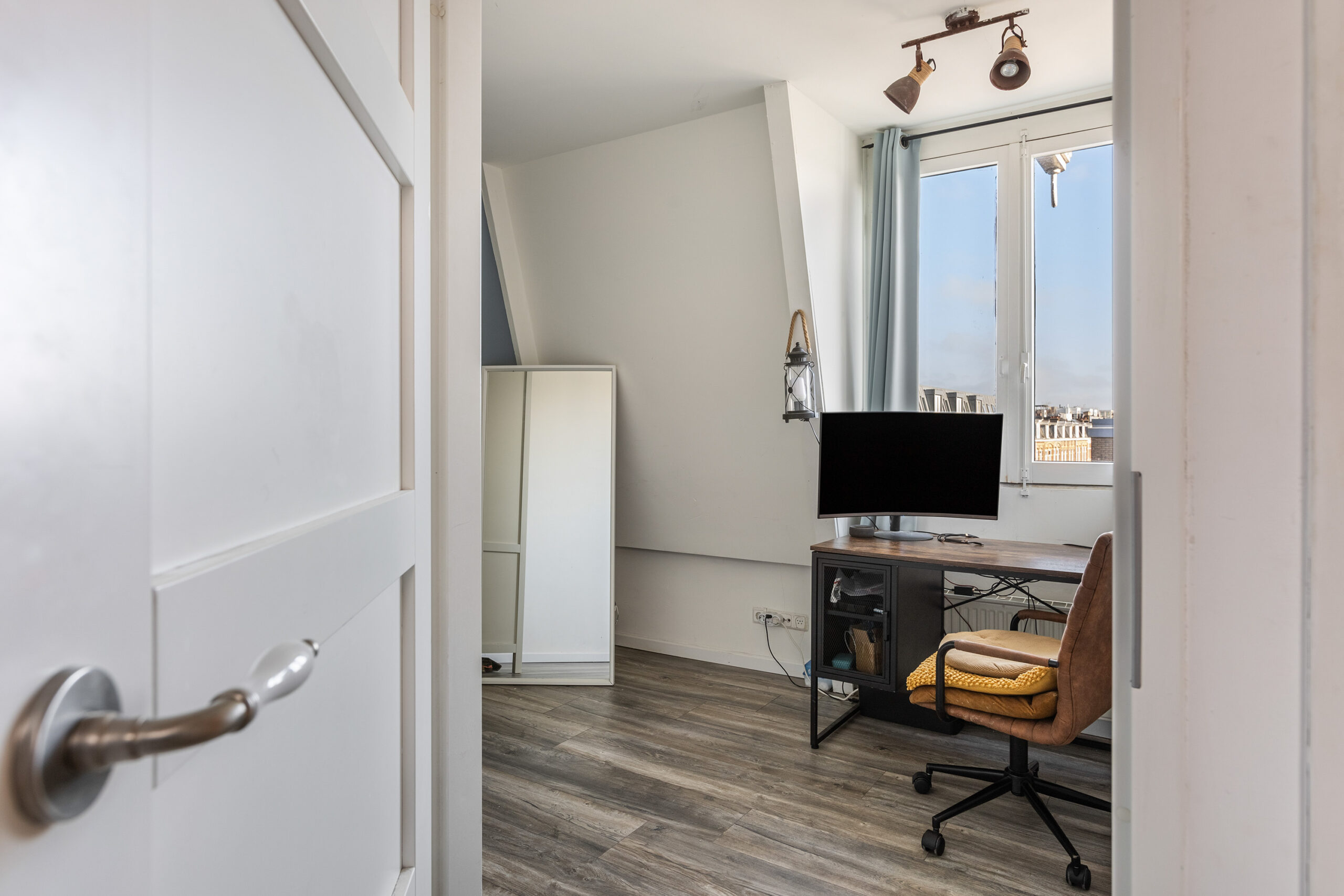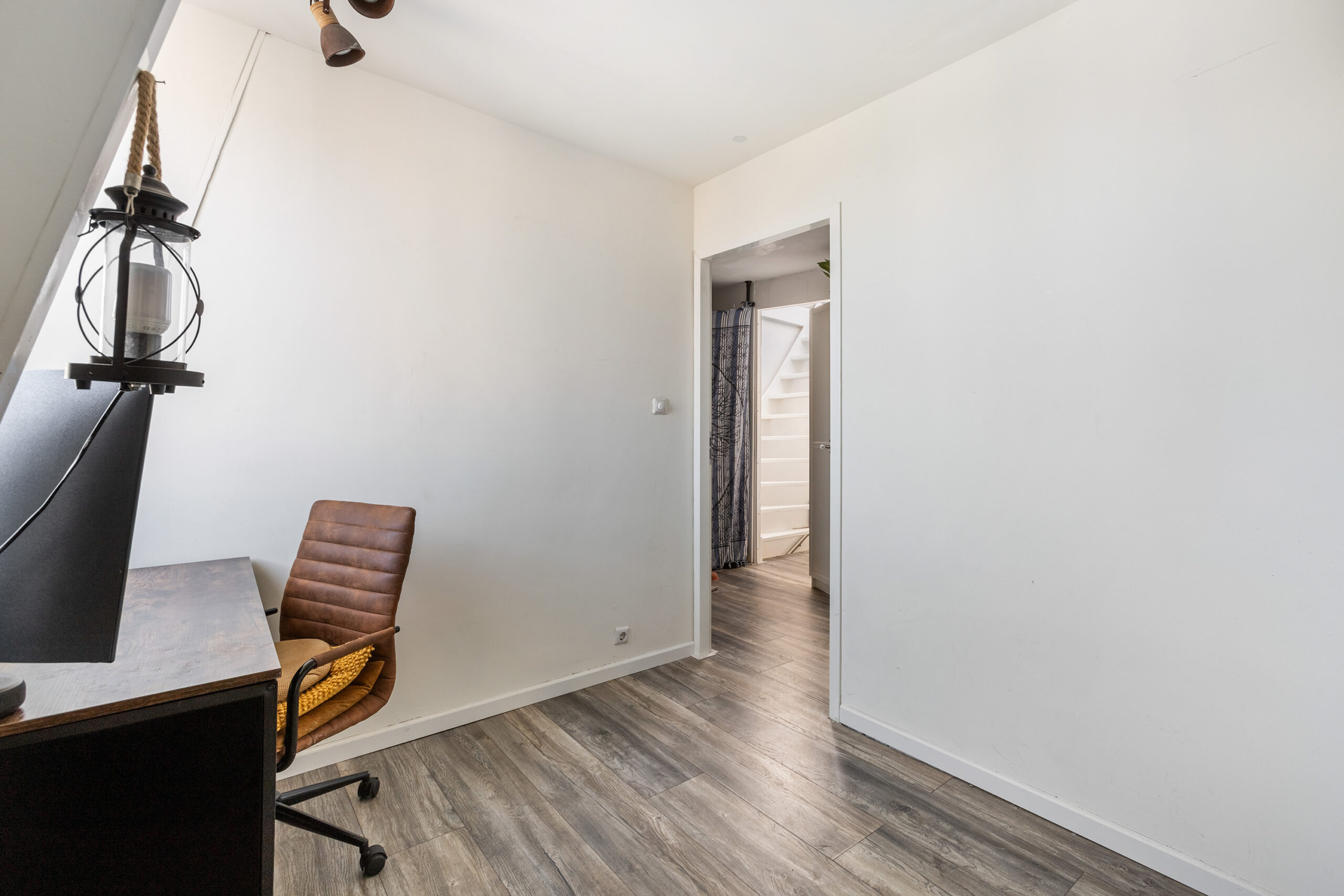 Via the stairs in the private hall, you reach the fourth floor. Here you’ll find the first bedroom, featuring a large window with a beautiful view. The second room can be used as either a bedroom or a workspace. Centrally located on this floor is the characteristic bathroom, equipped with a toilet, sink, and spacious bathtub.
