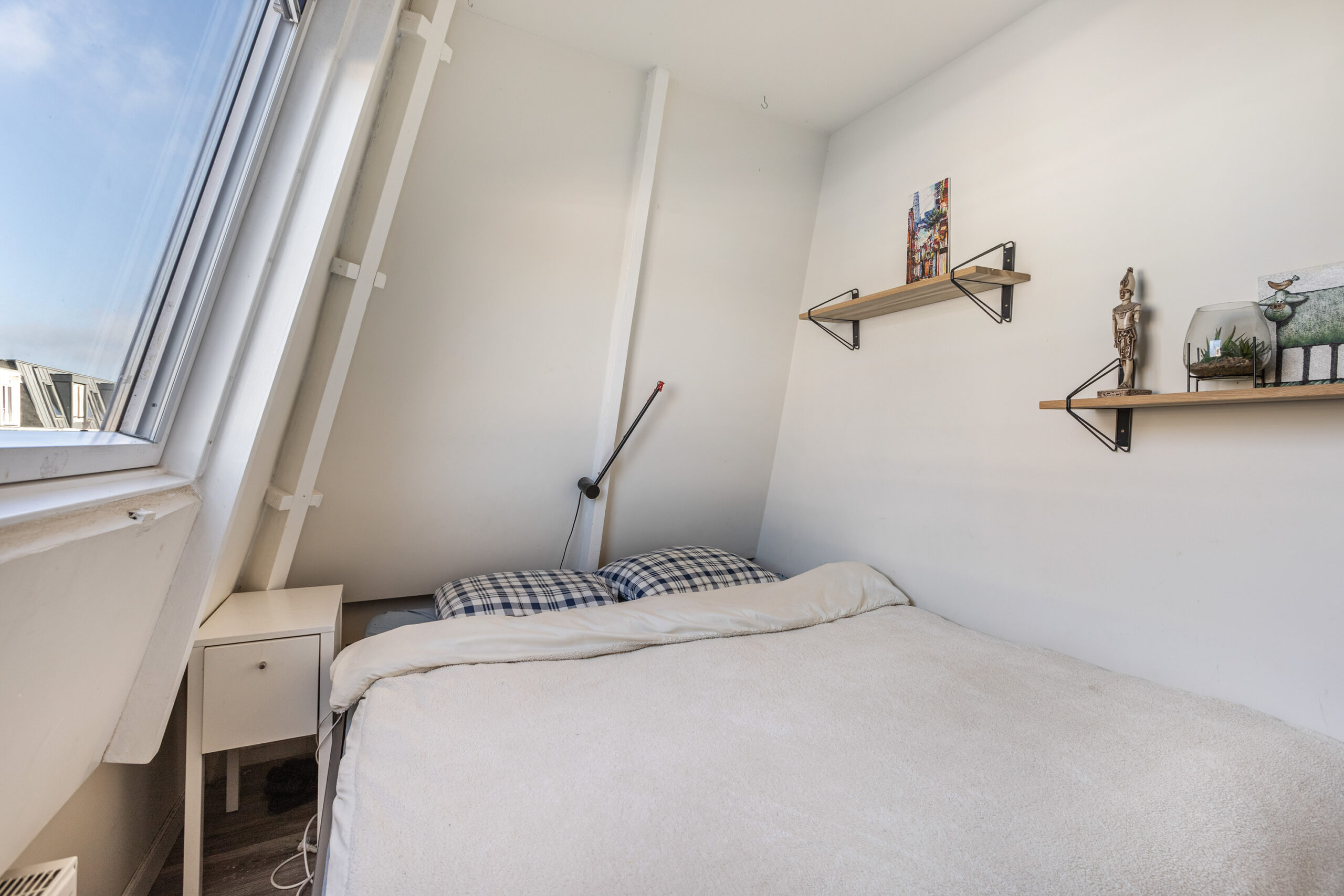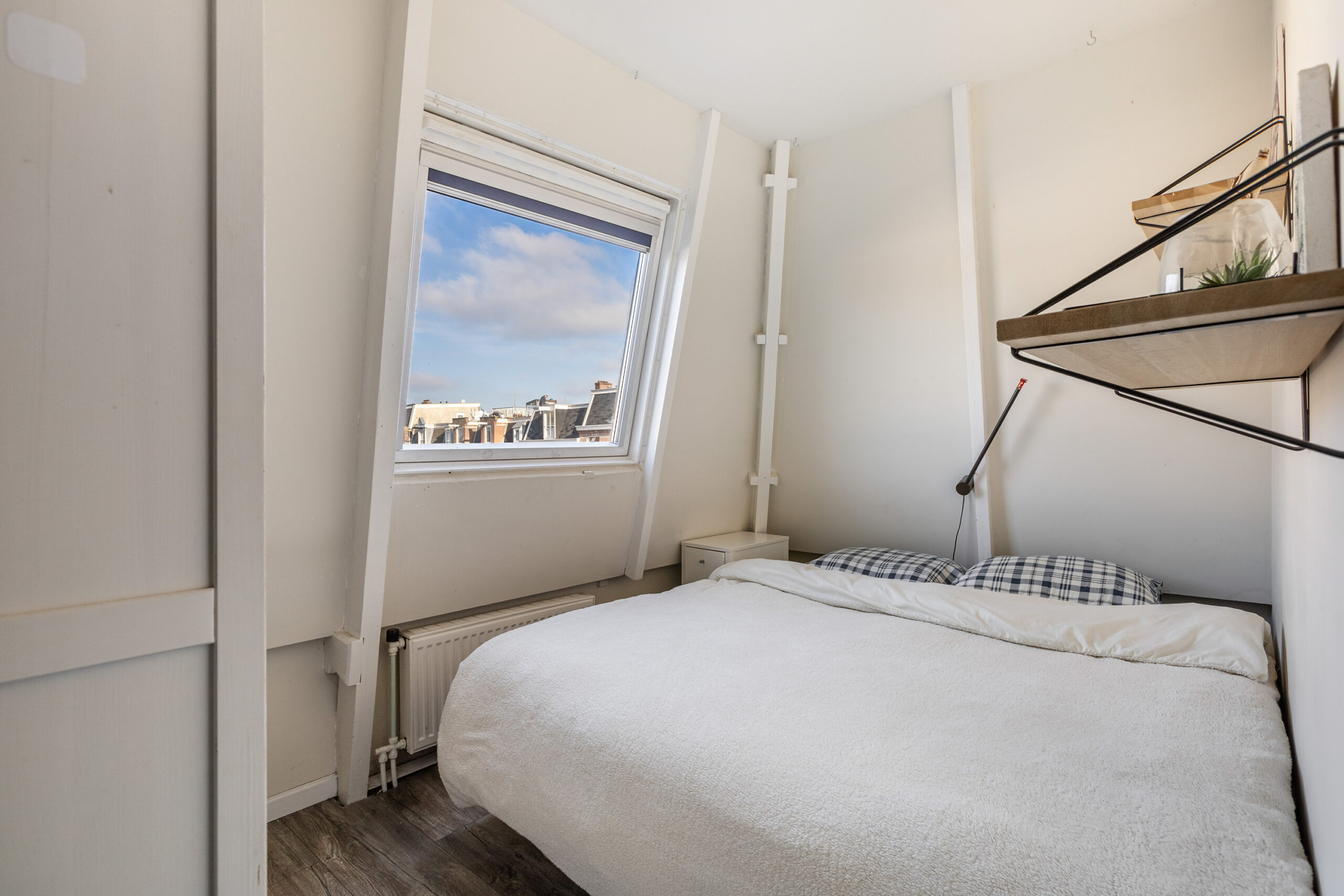 Via de trap in de privéhal bereik je de vierde etage. Daar bevindt zich de eerste slaapkamer, voorzien van een royaal raam dat een prachtig uitzicht biedt. De tweede kamer kan zowel als slaapkamer als werkruimte worden ingericht. Centraal gelegen op deze verdieping ligt de karakteristieke badkamer, uitgerust met een toilet, wastafel en ruim ligbad.