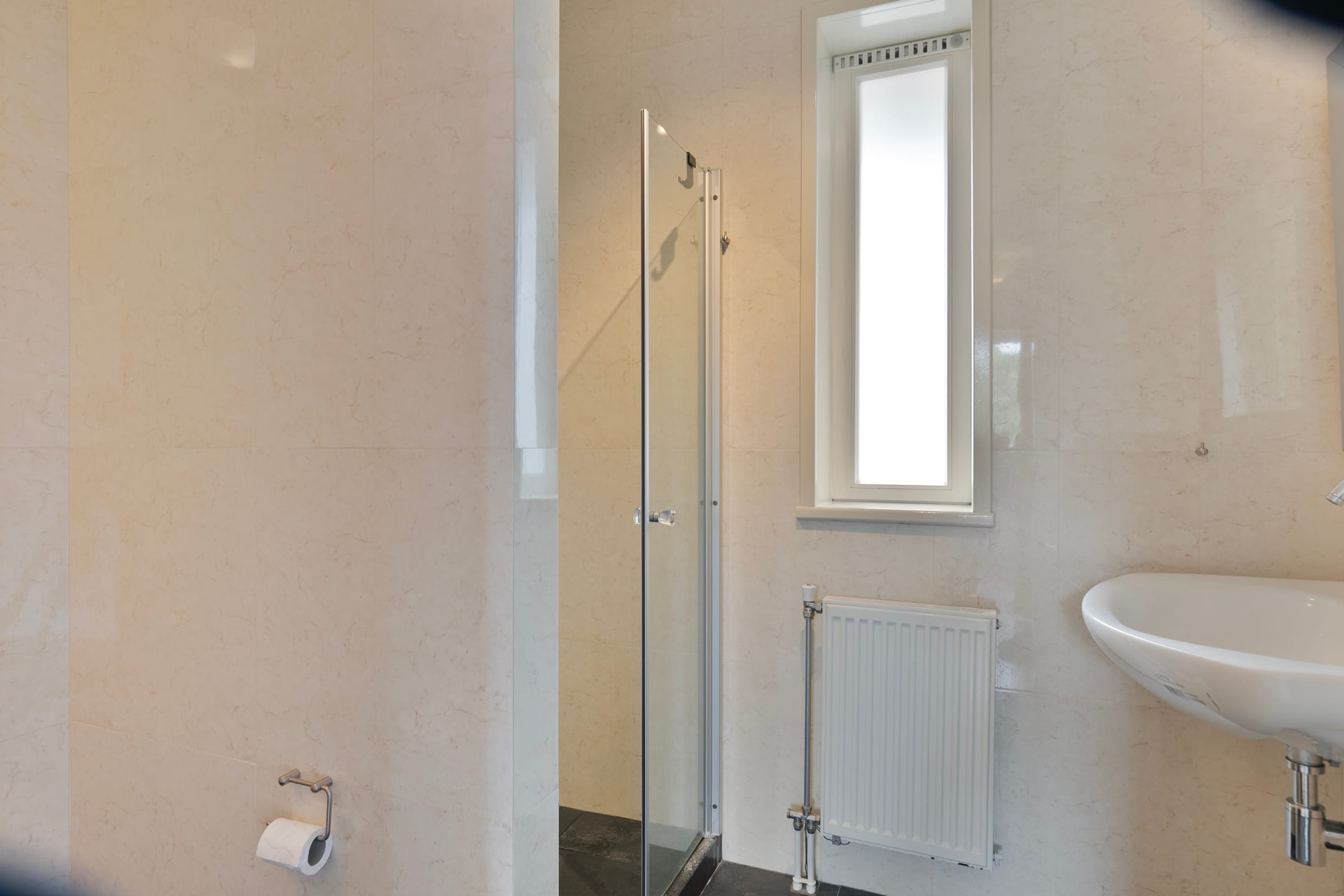 De badkamer op de 1e verdieping is volledig betegeld, heeft een fraaie natuurstenen tegelvloer met elektrische vloerverwarming en beschikt over een ruime inloopdouche, een wastafel met spiegel, een modern opbergmeubel en een zwevend toilet. Deze badkamer is van alle gemakken voorzien, en het strakke design maakt het een