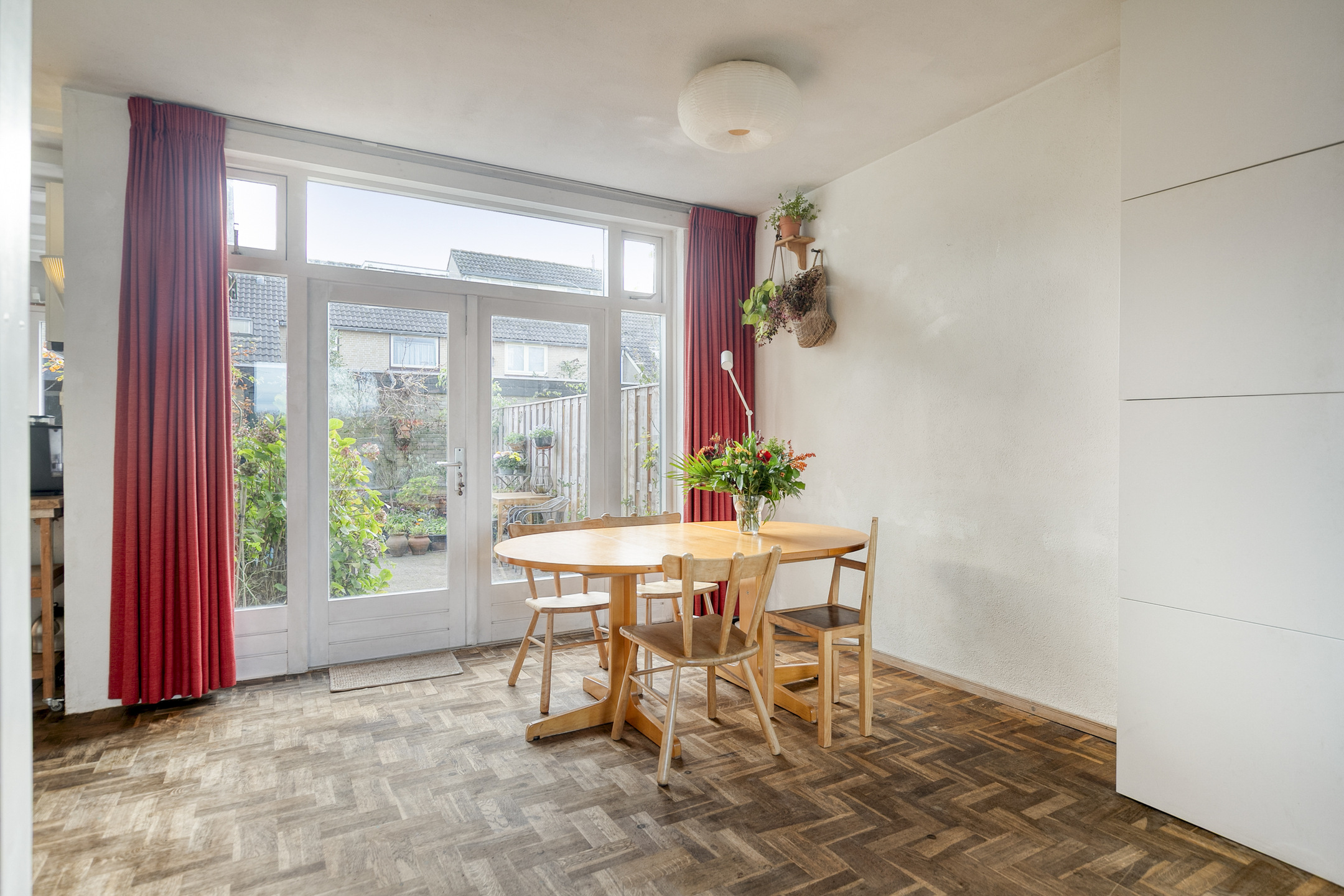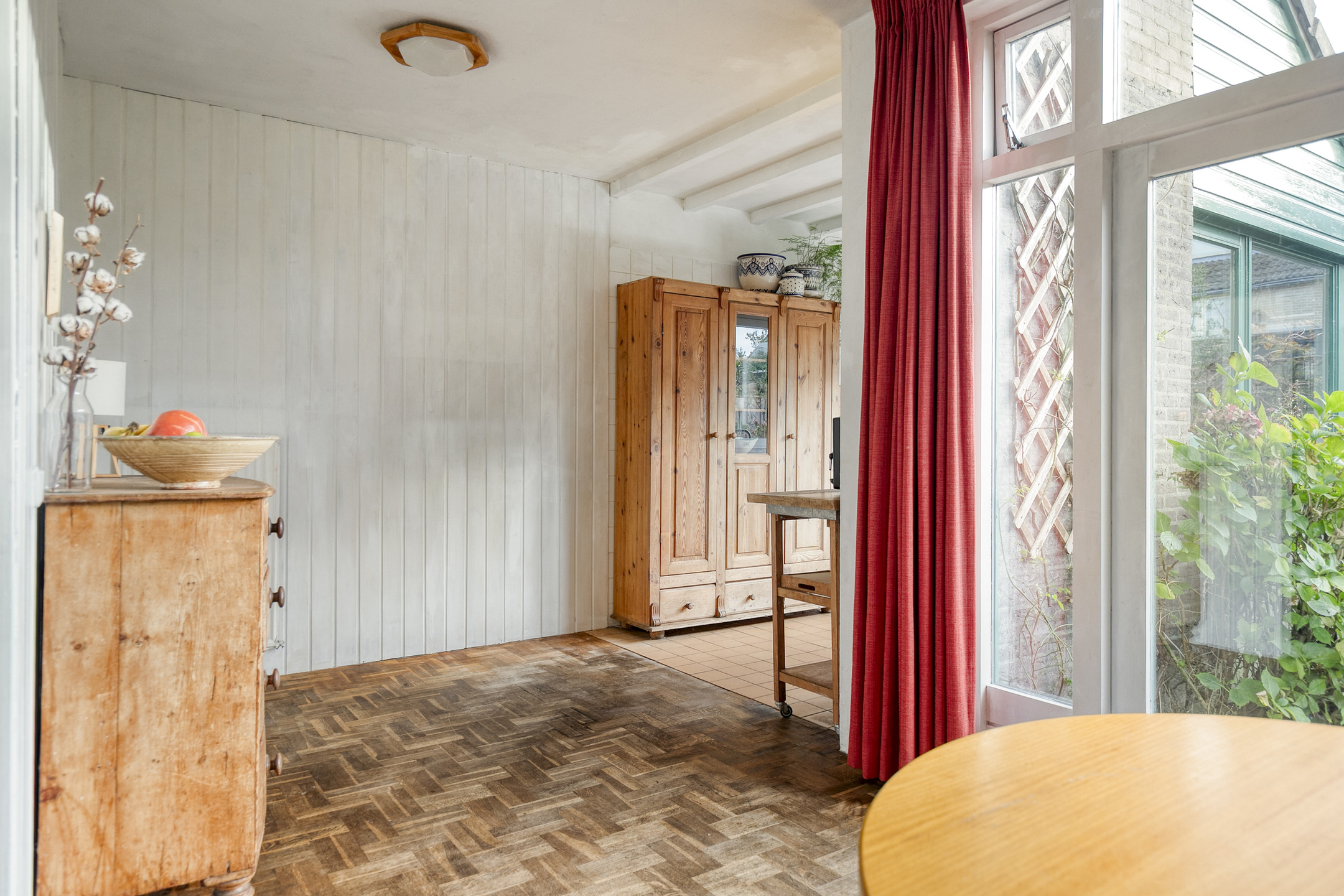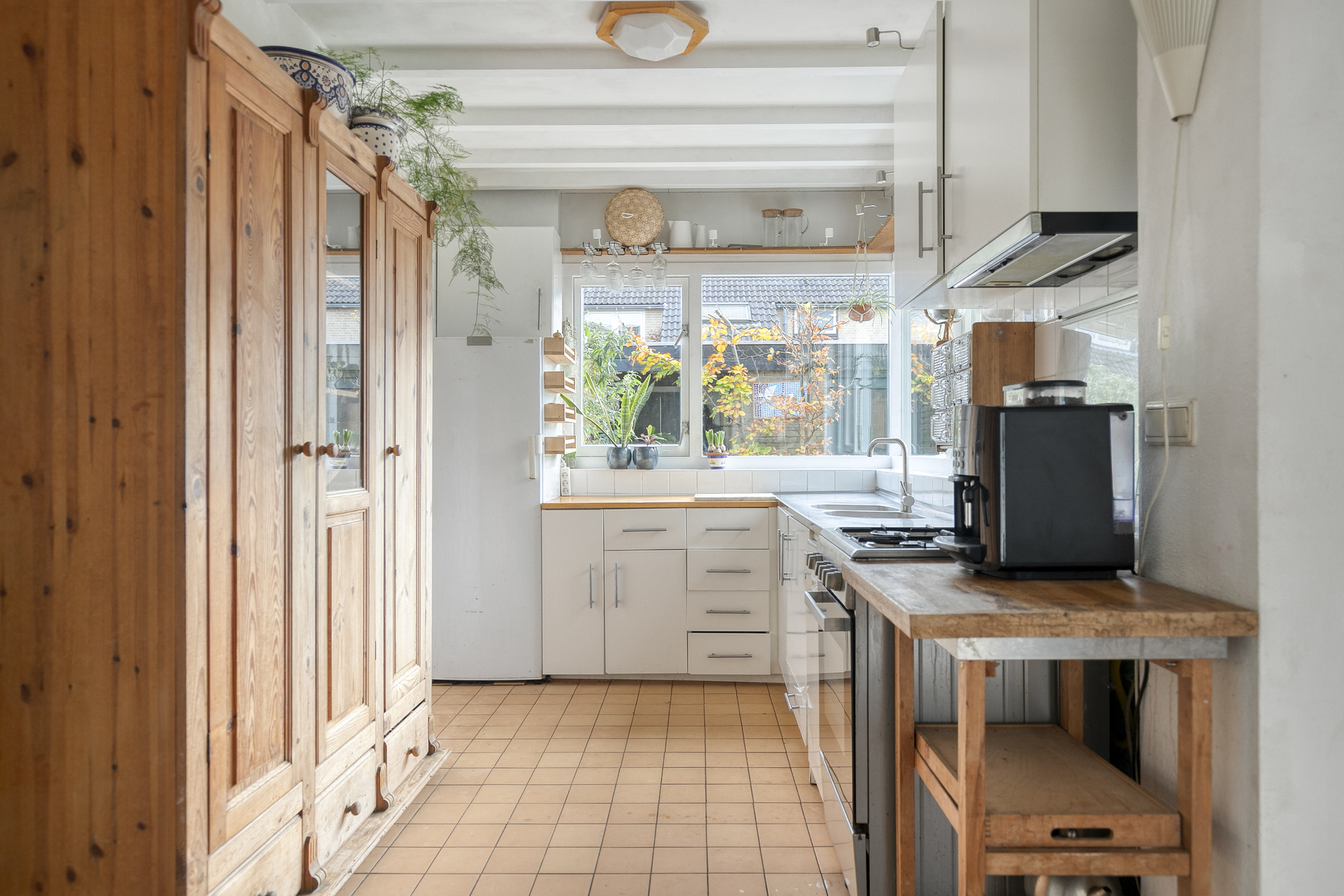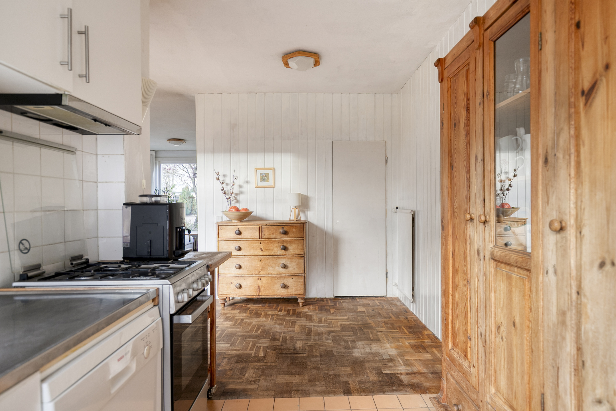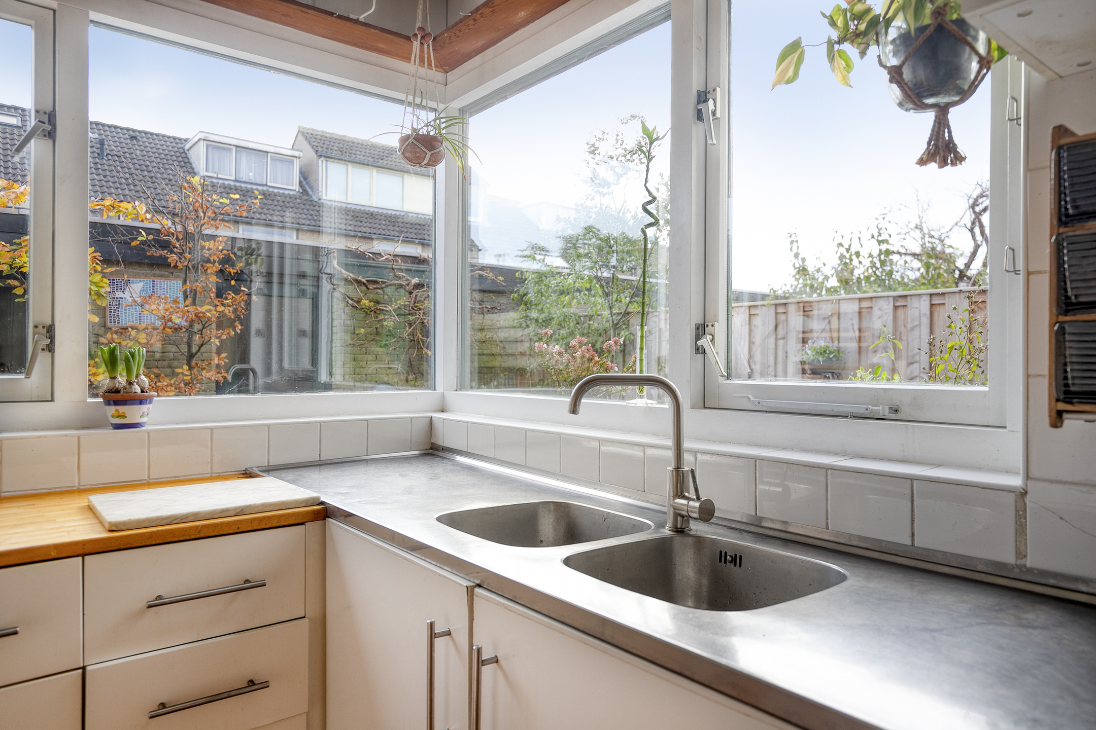 Via dubbele openslaande deuren stap je de zonnige achtertuin in. De keuken, gesitueerd in de aanbouw, kan desgewenst geheel naar eigen stijl worden gemoderniseerd. De ramen aan beide zijden maken de ruimte licht en bieden uitzicht op de tuin.