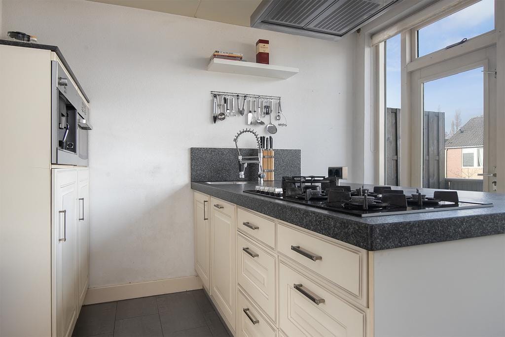 This spacious drive-in single-family home is located in the green and quiet neighborhood ‘Huiswaard’, near the pleasant center of Alkmaar. Primary schools, childcare and the supermarket are within walking distance. Due to its convenient location, the train station and the N242 and A9 highways are easily accessible. This will take you to the adjacent coastal towns, Amsterdam, Haarlem and Schiphol in no time. You can reach the historic center of Alkmaar within 7 minutes by bike. Here you will find an abundance of various restaurants, shops and entertainment venues! At the front of the house is a garage of almost 7 meters deep. Spacious enough for parking your car and storing belongings or creating your own workshop.The house has a large sunny garden with a rear entrance. There is also a spacious canopy at the back. Here you can enjoy yourself until the late hours after a day of shopping or sunbathing.