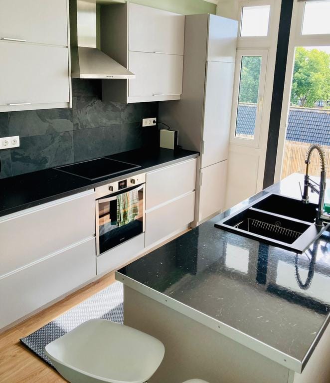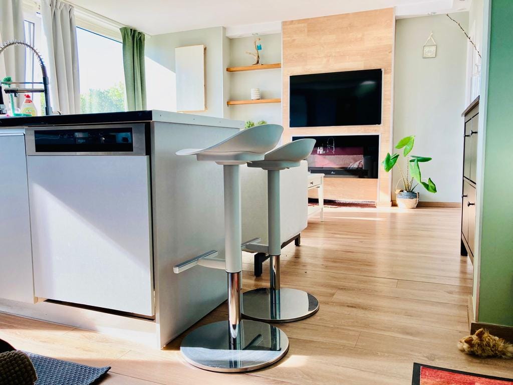 Upon entering, it is immediately visible that this apartment has a beautiful finish, with sleek walls and a beautiful laminate floor. With open and sleek kitchen, separate toilet and access to the living room. You enter the living room, which has a lot of natural light and lots of space. From the dining room there is access to the balcony, this apartment has no less than 2! You can cook that delicious meal in the modern kitchen. The kitchen consists of an appliance wall and a straight cooking area, the whole is equipped with an induction hob, design extractor hood, dishwasher, combi microwave, fridge freezer.