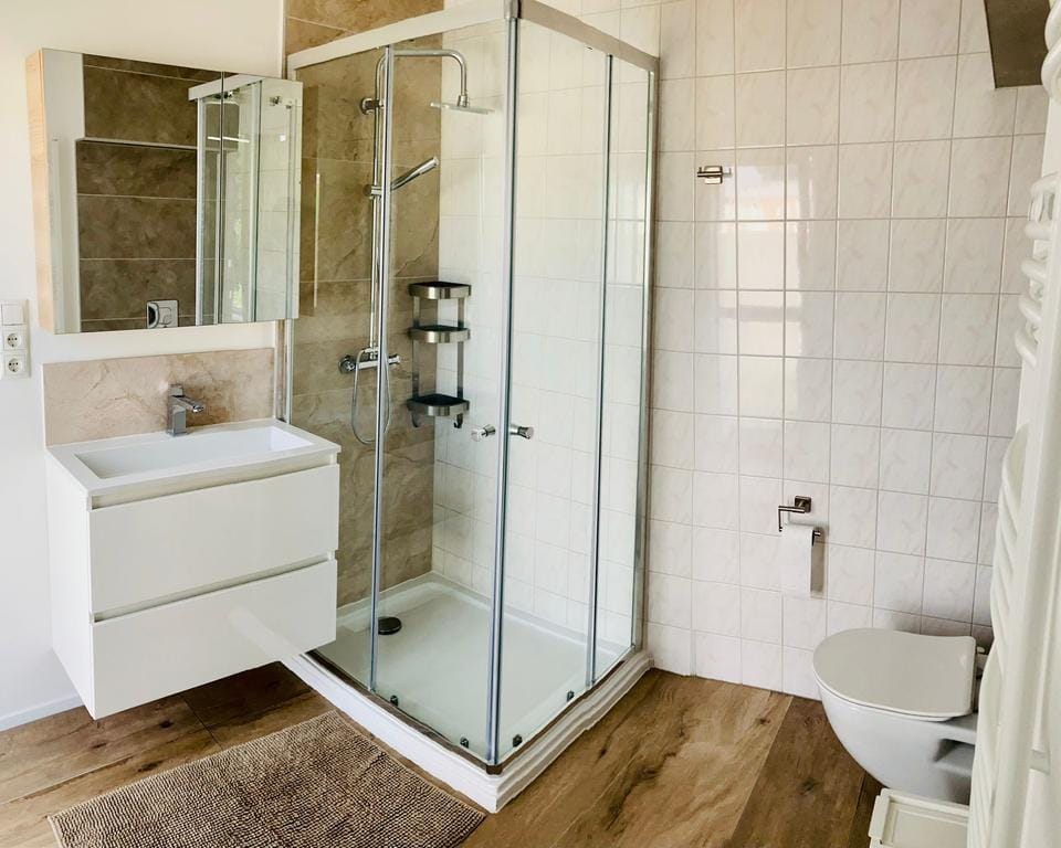 A really lovely place to cook and enjoy a snack and a drink with the sun here on the 2nd balcony. The bathroom is accessible from the kitchen, which is equipped with a walk-in shower, modern toilet, design radiator, washbasin and space for the washing machine and dryer. The kitchen and bathroom are located between the spacious bedroom. The bedroom has large windows, through which sufficient daylight enters the room. But wait there’s more! From the bedroom you can enjoy your own Wellens, because there is a steam cabin. Great for relaxing after a long working day.