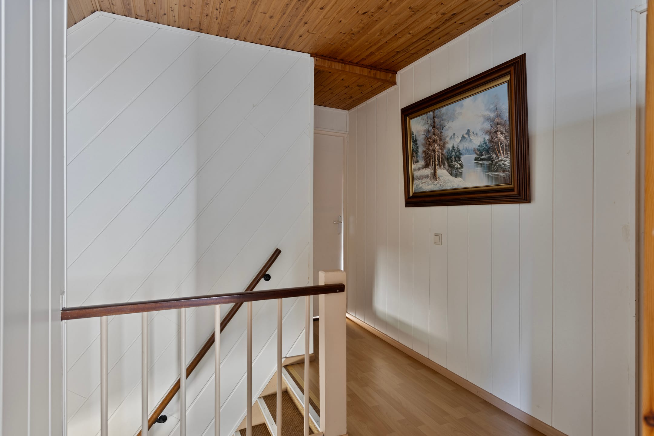 The landing leads to three bedrooms and two spacious storage rooms. The master bedroom runs the entire length of the house, and all rooms are neutrally finished with a high ceiling, laminate flooring, and plenty of daylight.