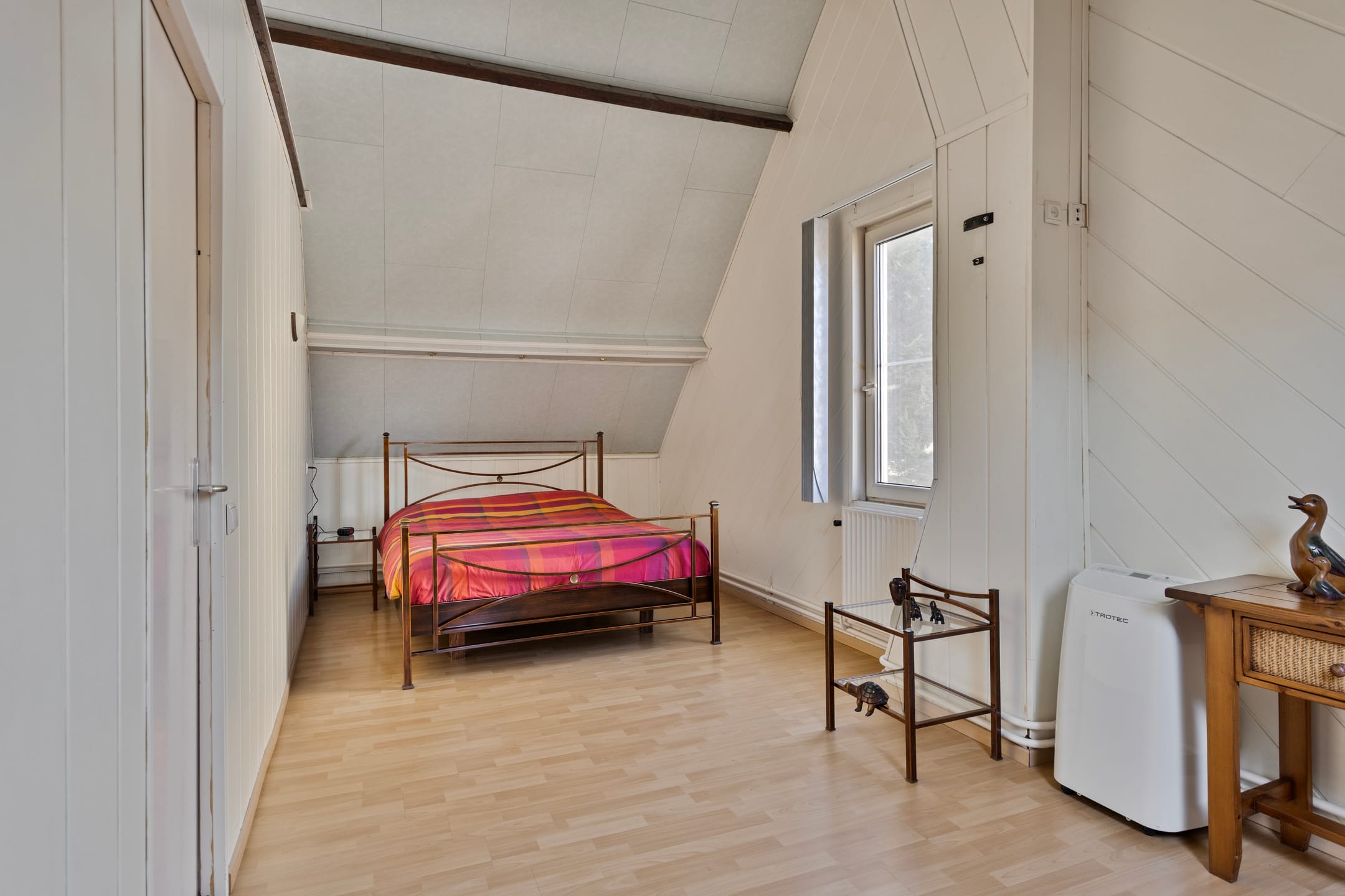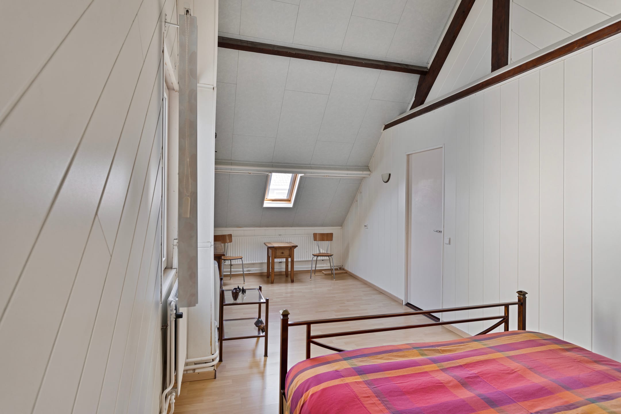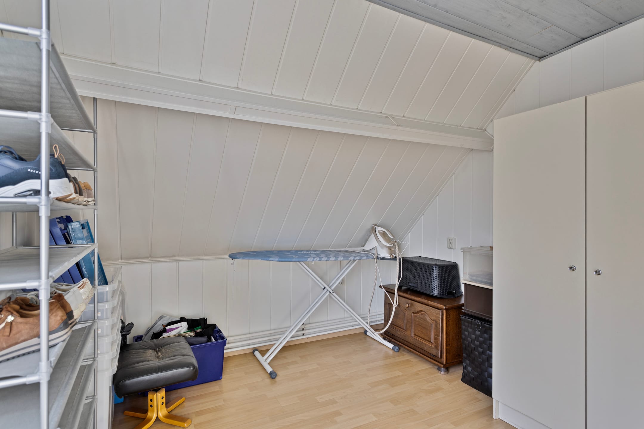 Een verplaatsbare trap leidt tot de bergzolder, ideaal voor het opslaan van seizoensspullen.