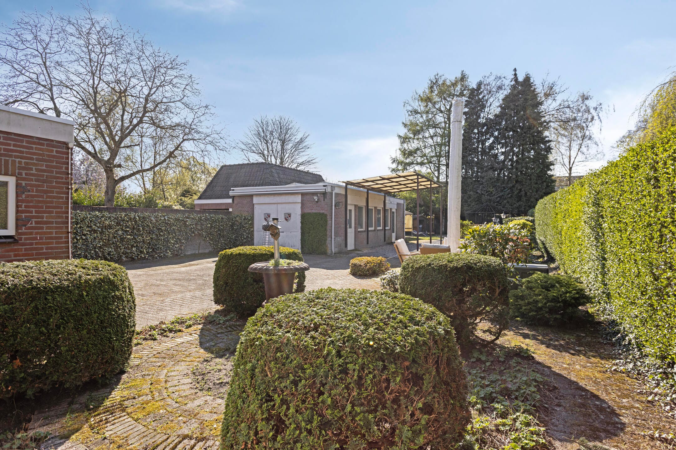 The outdoor space is an absolute highlight of this property. Through the spacious driveway with a double gate, you reach the backyard, which is fully set up with various facilities. There is a large paved area, multiple flowerbeds, lawn, and several terraces with seating areas. The garden is bordered with mature greenery and offers a lot of privacy. There are several storage sheds, a garage with a carport, a large shed, and various coverings.