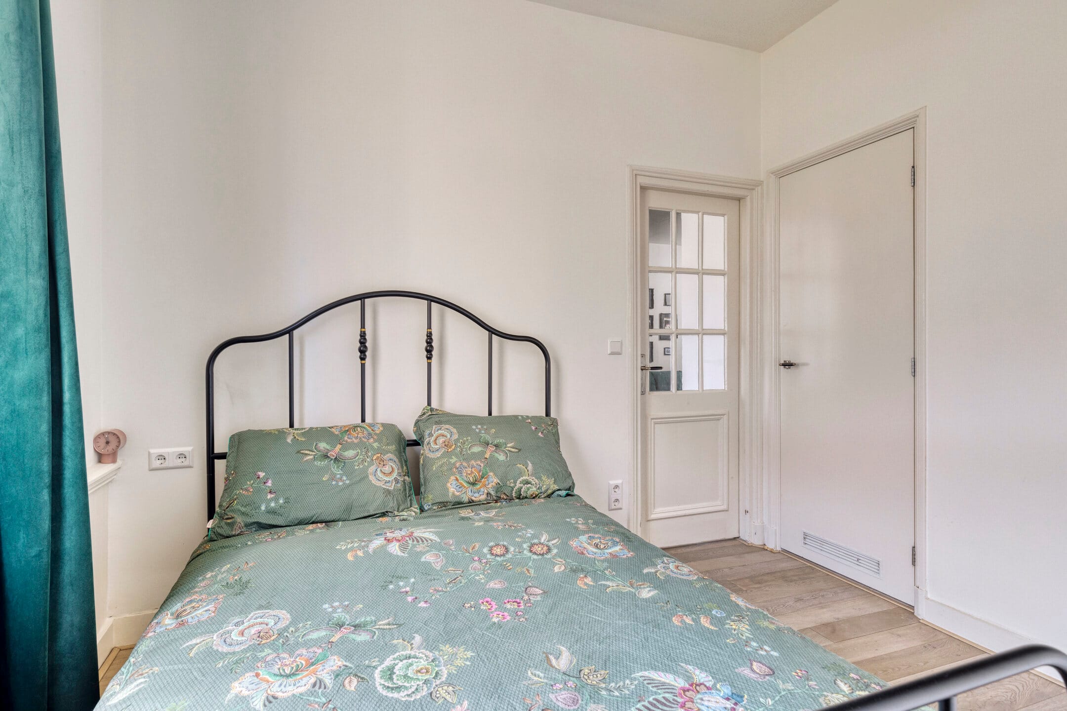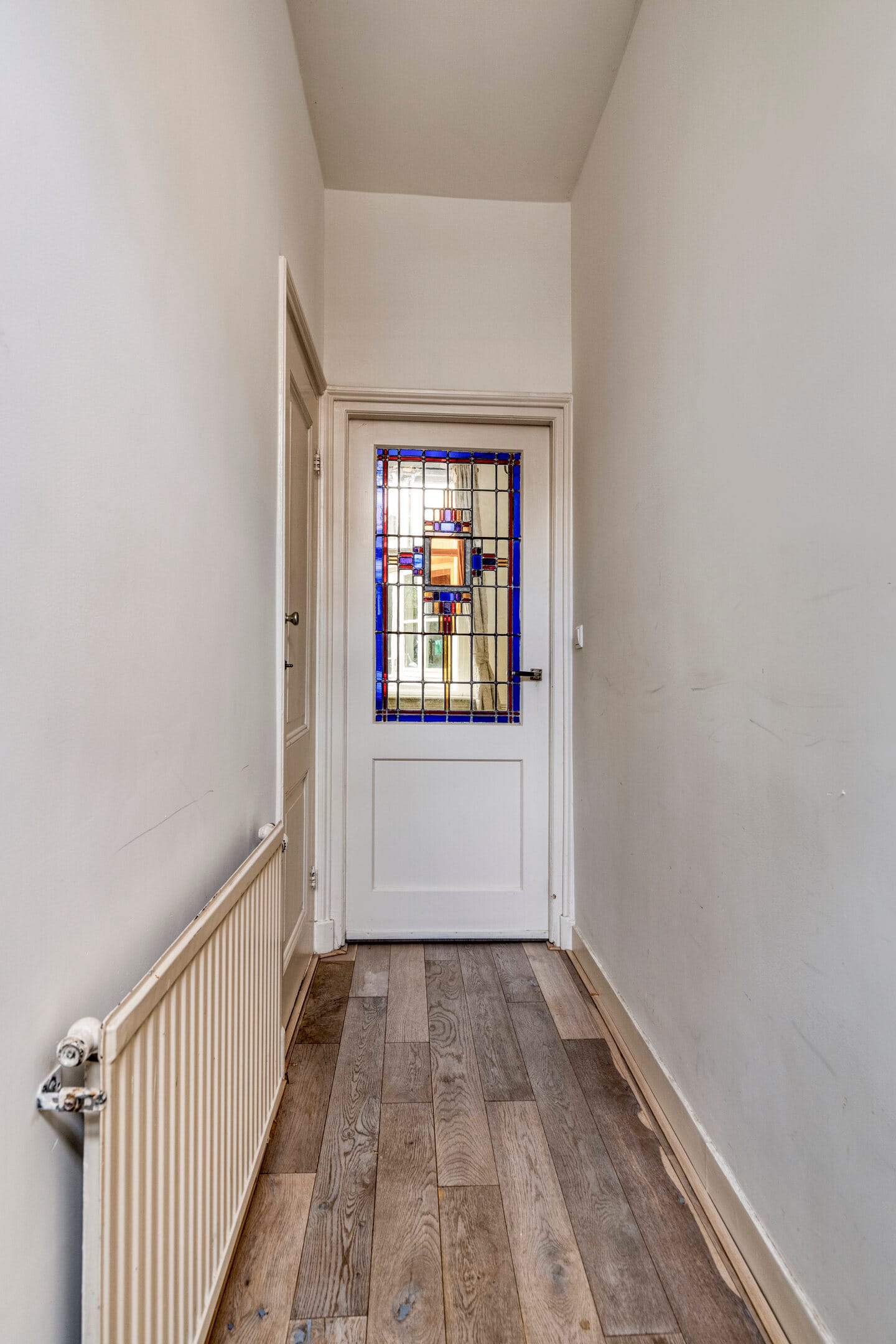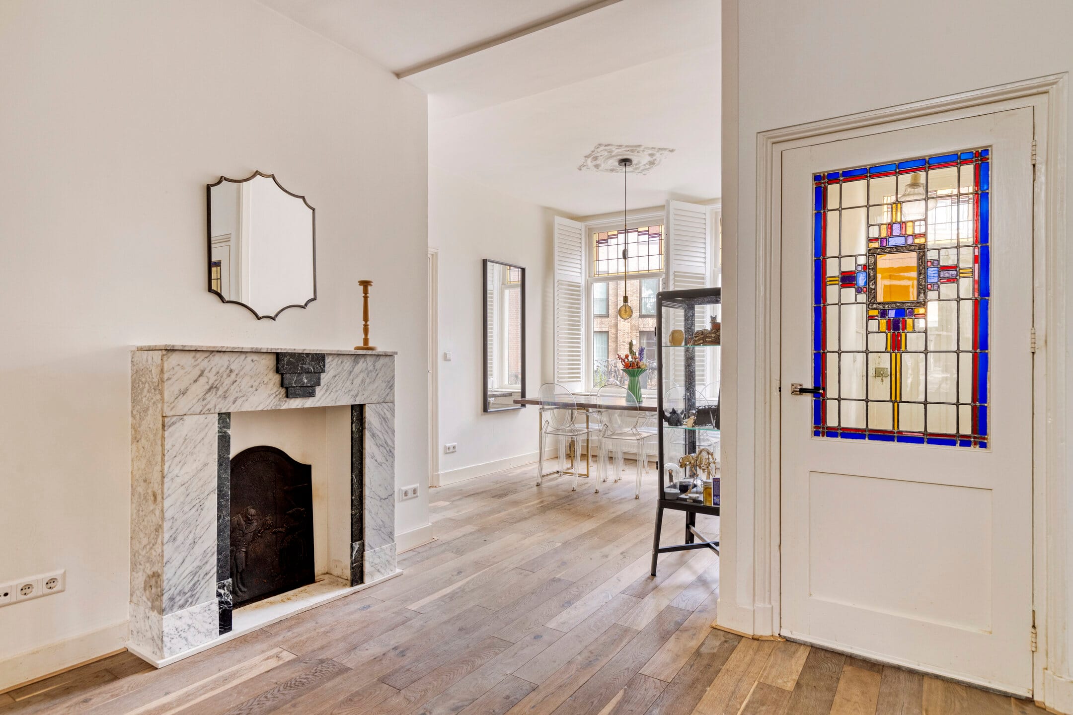 The apartment itself is also worth a visit. You enter through a long hallway with a built-in closet. A beautiful door with original stained-glass window leads to the spacious living room. Here, the high ceilings and abundance of natural light immediately stand out, thanks to the large windows at both the front and rear. The fireplace, ceiling ornament, and wooden shutters add extra charm. A place you’ll never want to leave.