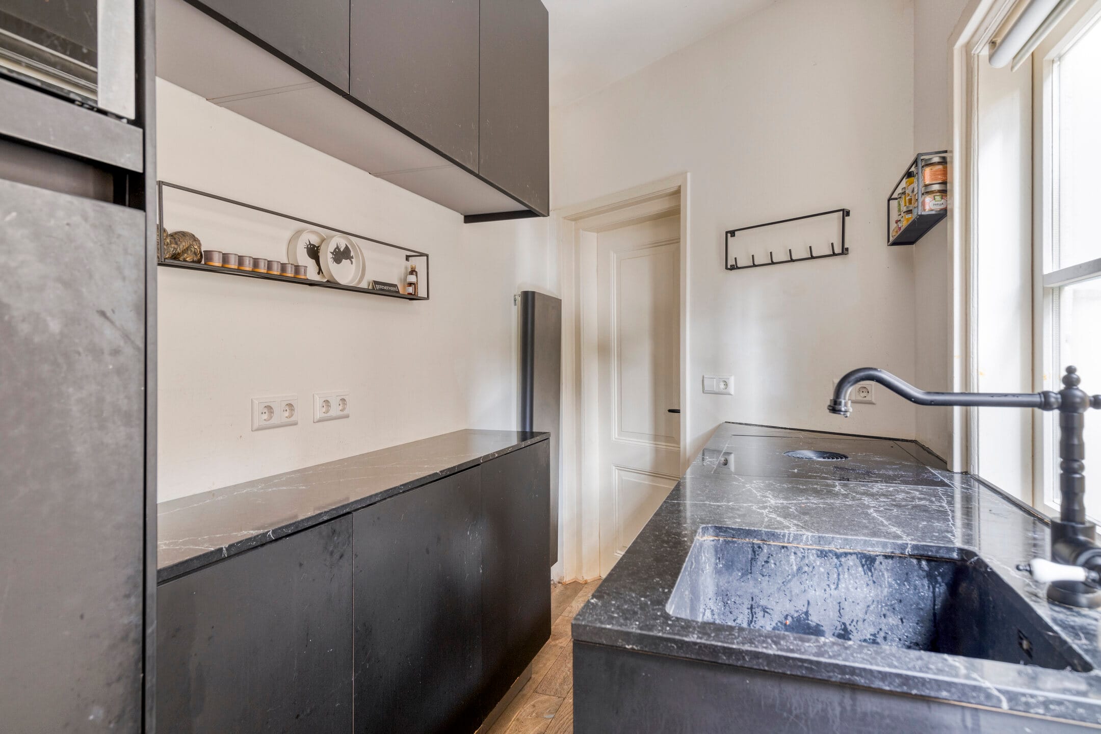Authentieke details gaan moeiteloos samen met hedendaags comfort. Zo is er de strakke, greeploze matzwarte keuken, volledig uitgerust met inbouwapparatuur: een Bora-kookplaat met geïntegreerde afzuiging, een combimagnetron, vaatwasser en een koelkast met vriesvak. Aansluitend vind je een bijkeuken met de cv-ketel en wasmachineaansluiting. De slaapkamer bevindt zich aan de voorzijde en biedt ruimte voor een tweepersoonsbed en bijvoorbeeld een kaptafel of kledingkast. Aangrenzend ligt de ruime badkamer, voorzien van mechanische ventilatie, een regendouche, wastafelmeubel en een zwevend toilet