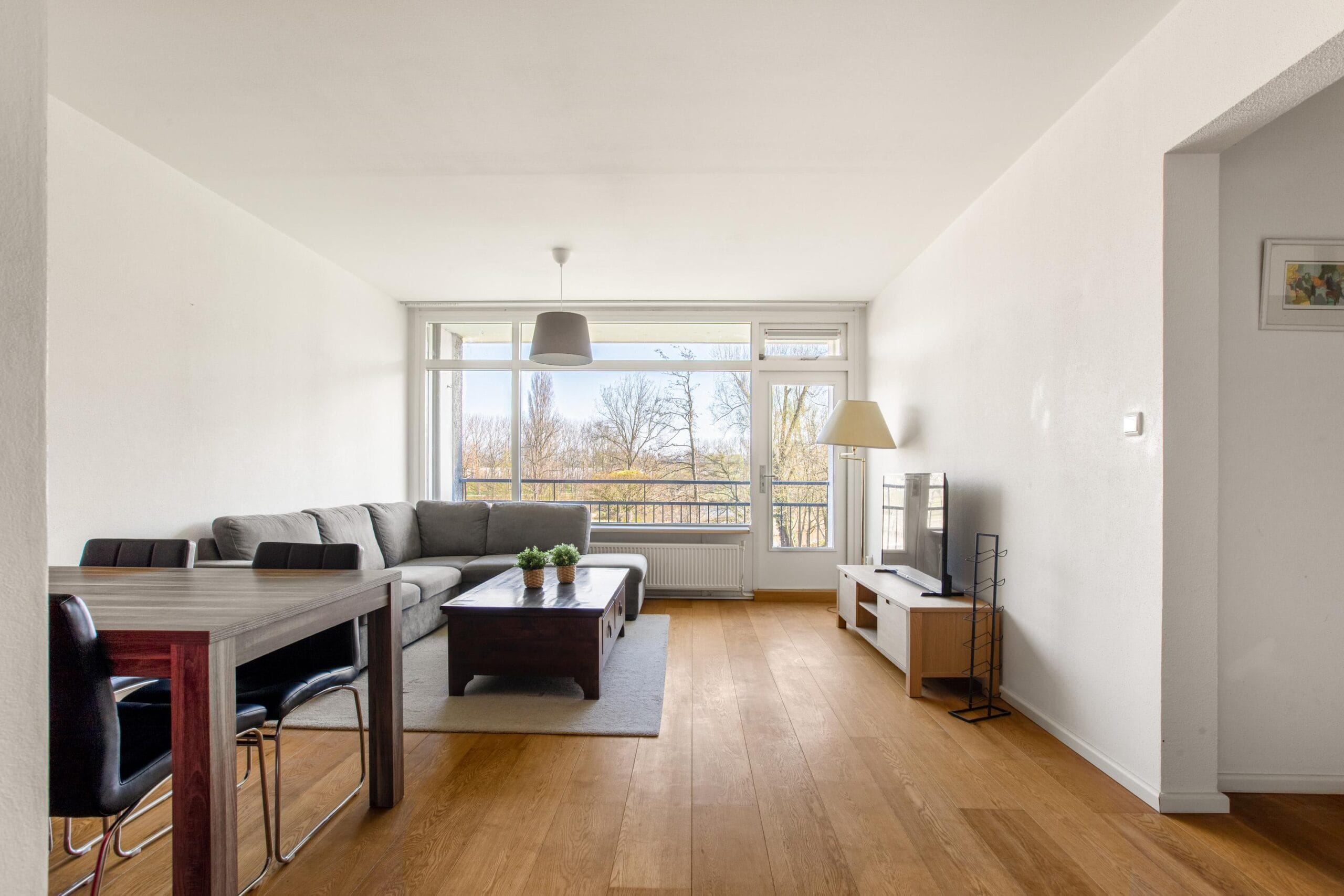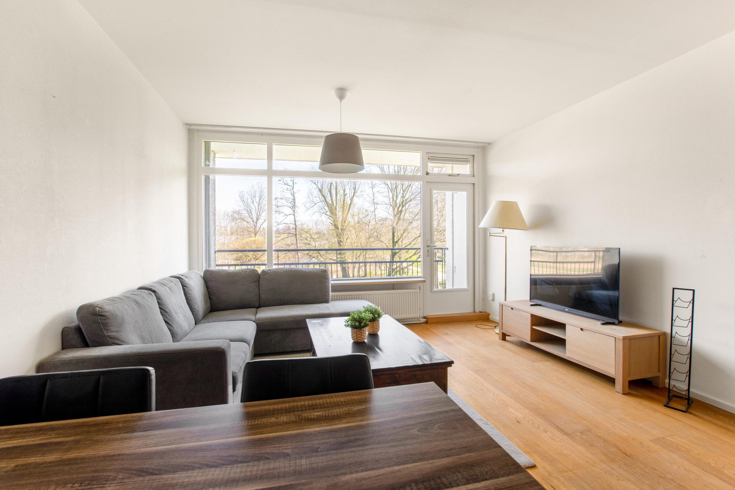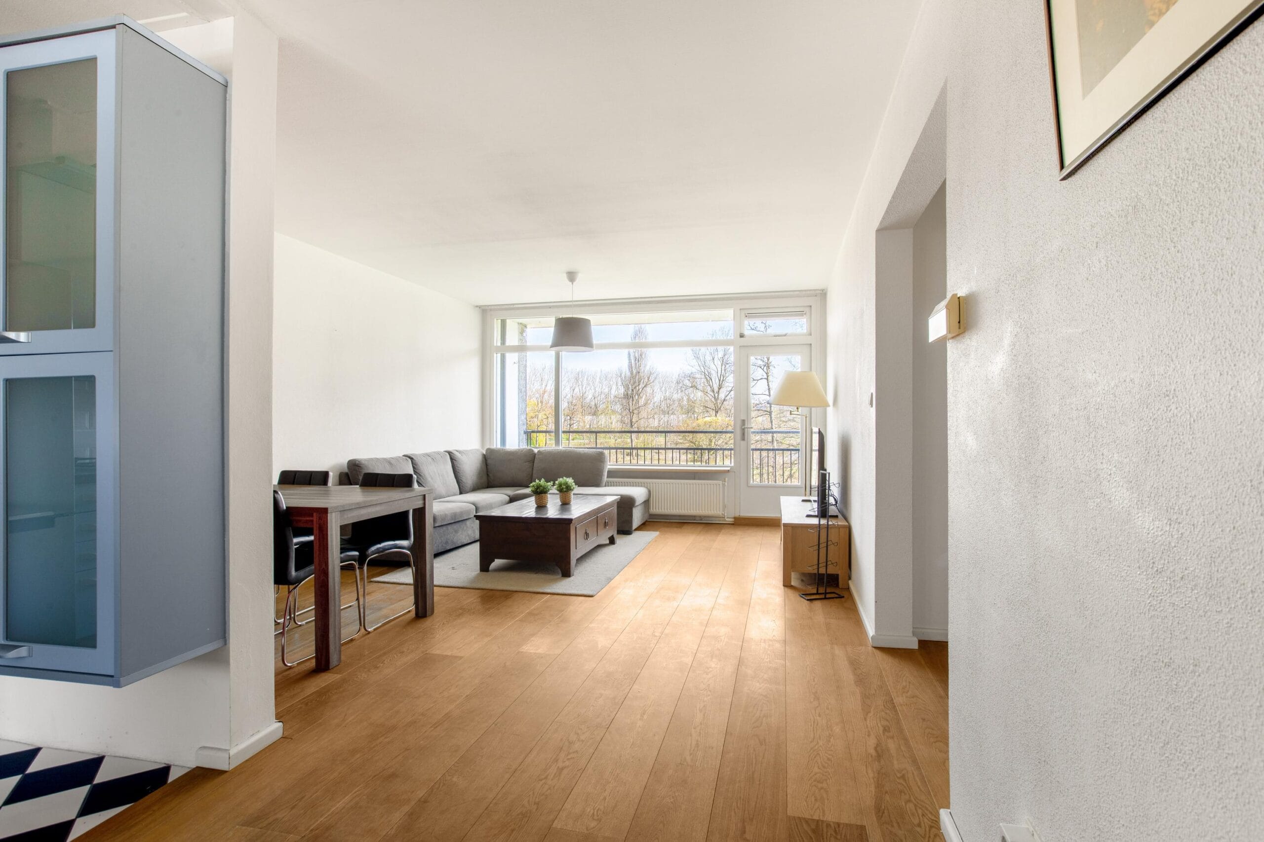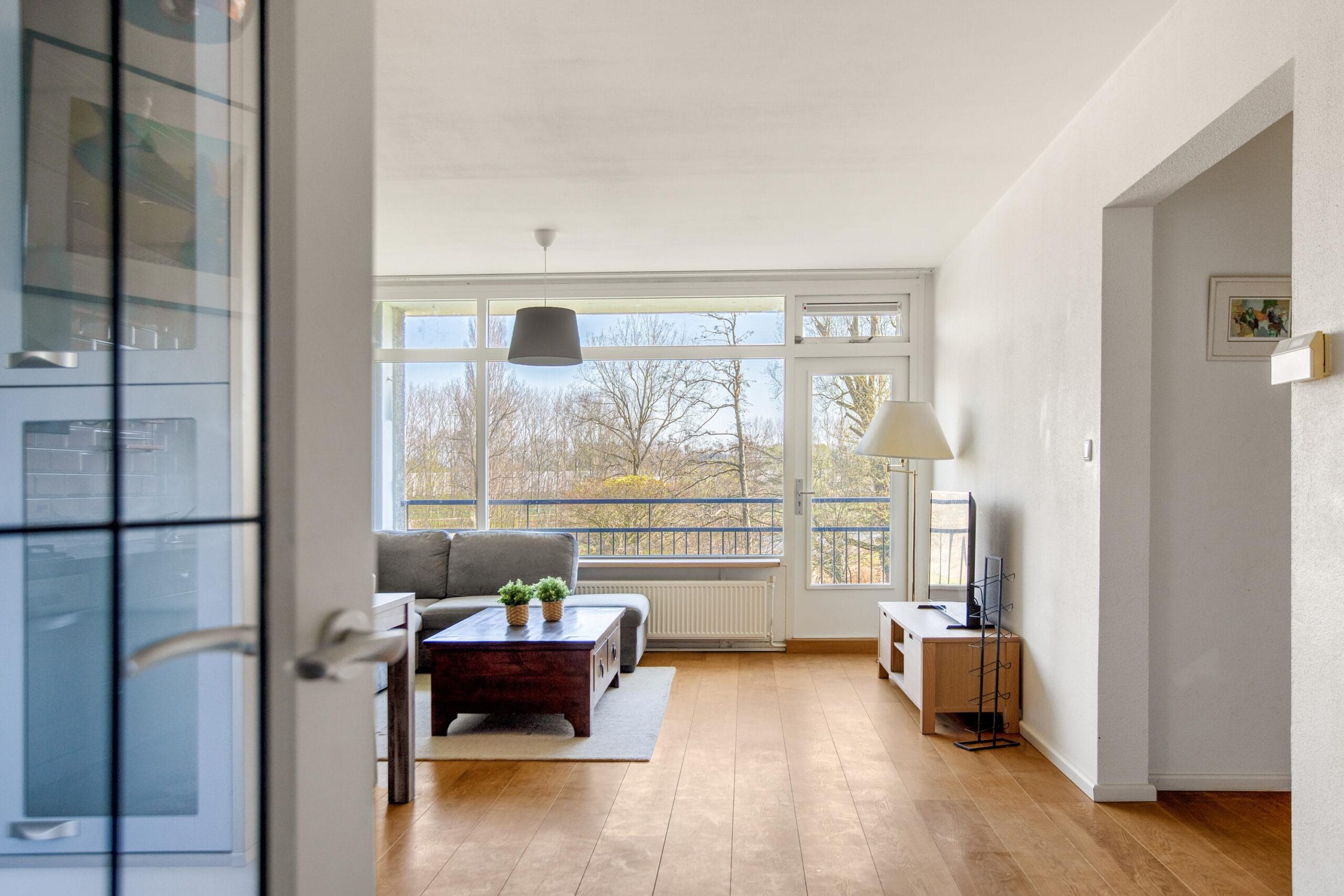 The apartment is located in Building B and is part of a well-kept apartment complex with an active and professionally managed owners’ association (VvE). You enter the building via the communal entrance with an intercom and mailboxes. Thanks to the elevator and wide corridors, the complex is easily accessible for people with reduced mobility. The apartment is on the second floor. Upon entering the hallway, the first thing you notice is how bright the apartment is, thanks to the large windows offering an open view. The central hallway provides access to a separate toilet with a small sink, and to the semi-open kitchen and living room. The door to the living room features tall stained-glass windows, creating a bright and open feel on both sides. From the living room, you have access to the balcony with unobstructed views of the landscaped park garden behind.