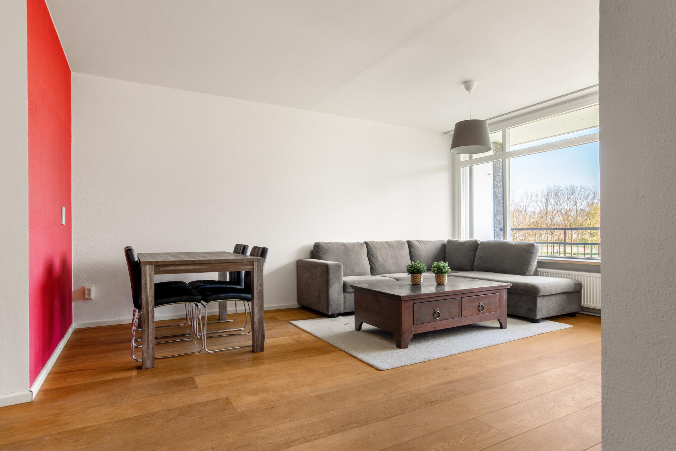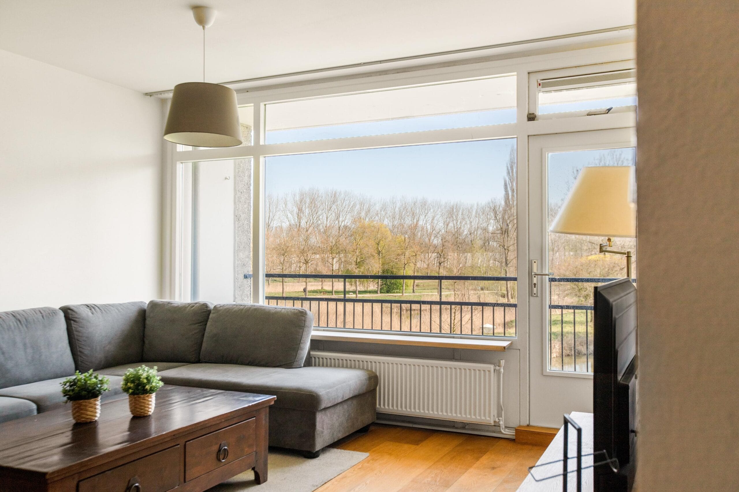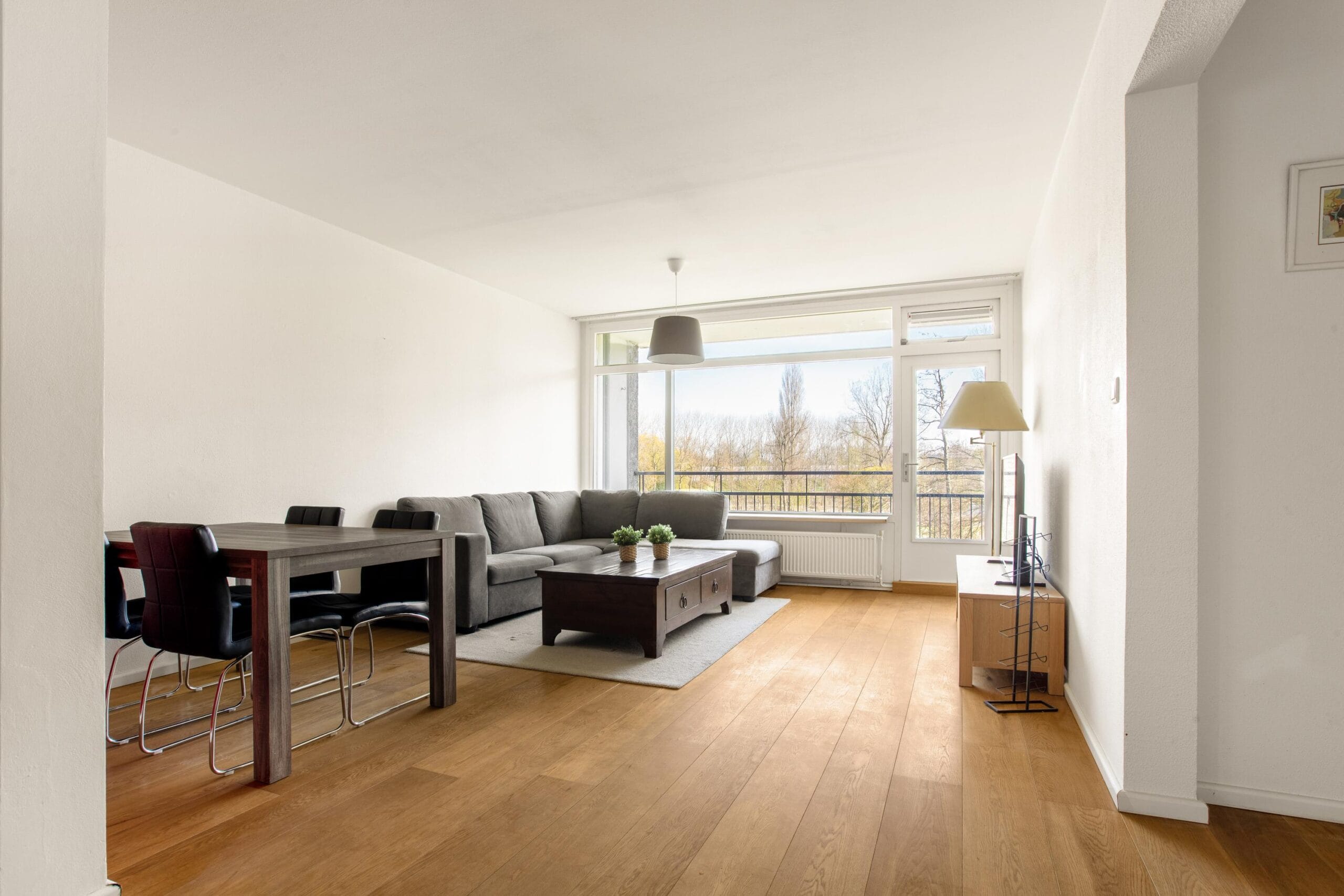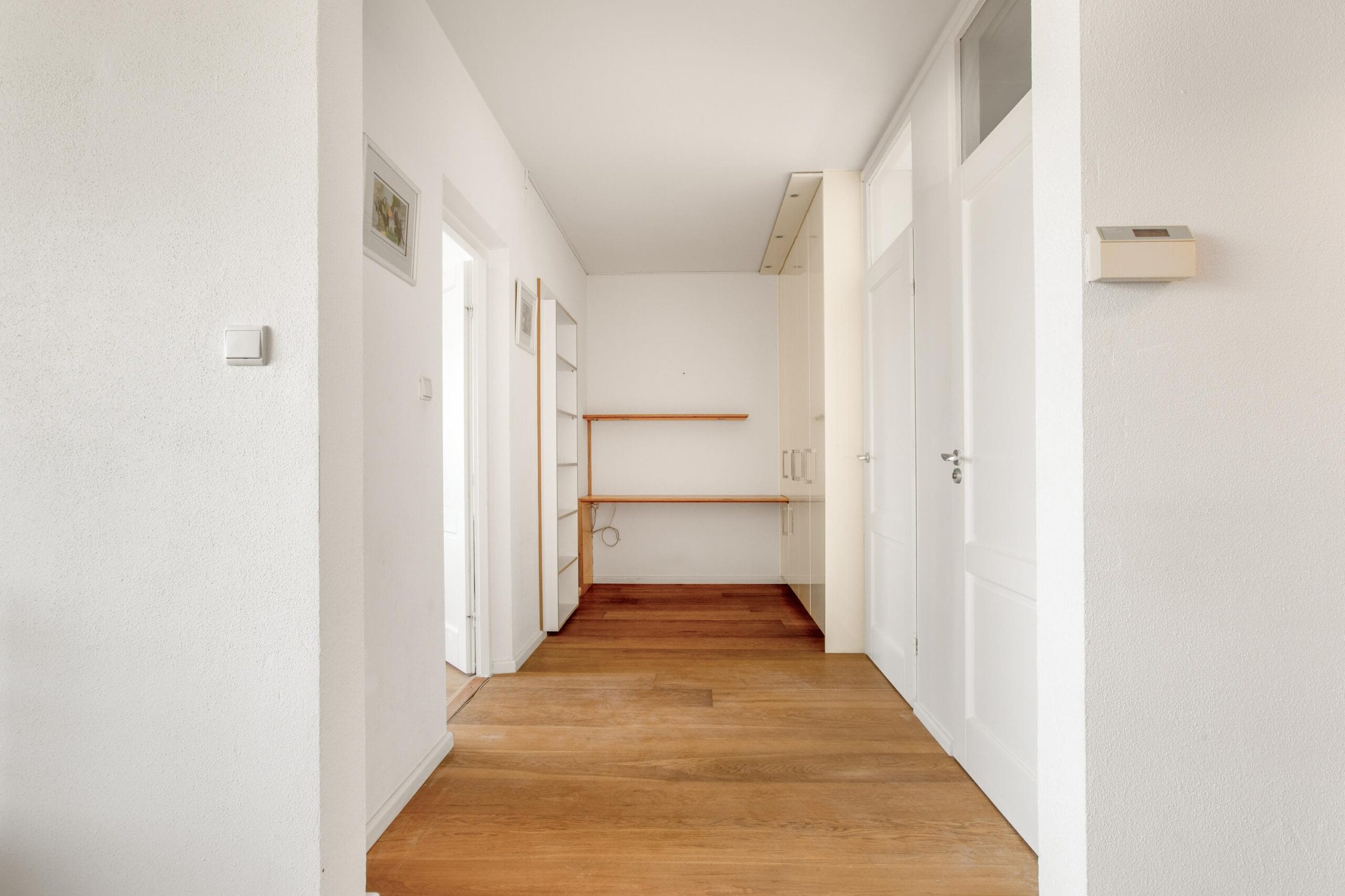 The apartment is located in Building B and is part of a well-kept apartment complex with an active and professionally managed owners’ association (VvE). You enter the building via the communal entrance with an intercom and mailboxes. Thanks to the elevator and wide corridors, the complex is easily accessible for people with reduced mobility. The apartment is on the second floor. Upon entering the hallway, the first thing you notice is how bright the apartment is, thanks to the large windows offering an open view. The central hallway provides access to a separate toilet with a small sink, and to the semi-open kitchen and living room. The door to the living room features tall stained-glass windows, creating a bright and open feel on both sides. From the living room, you have access to the balcony with unobstructed views of the landscaped park garden behind.