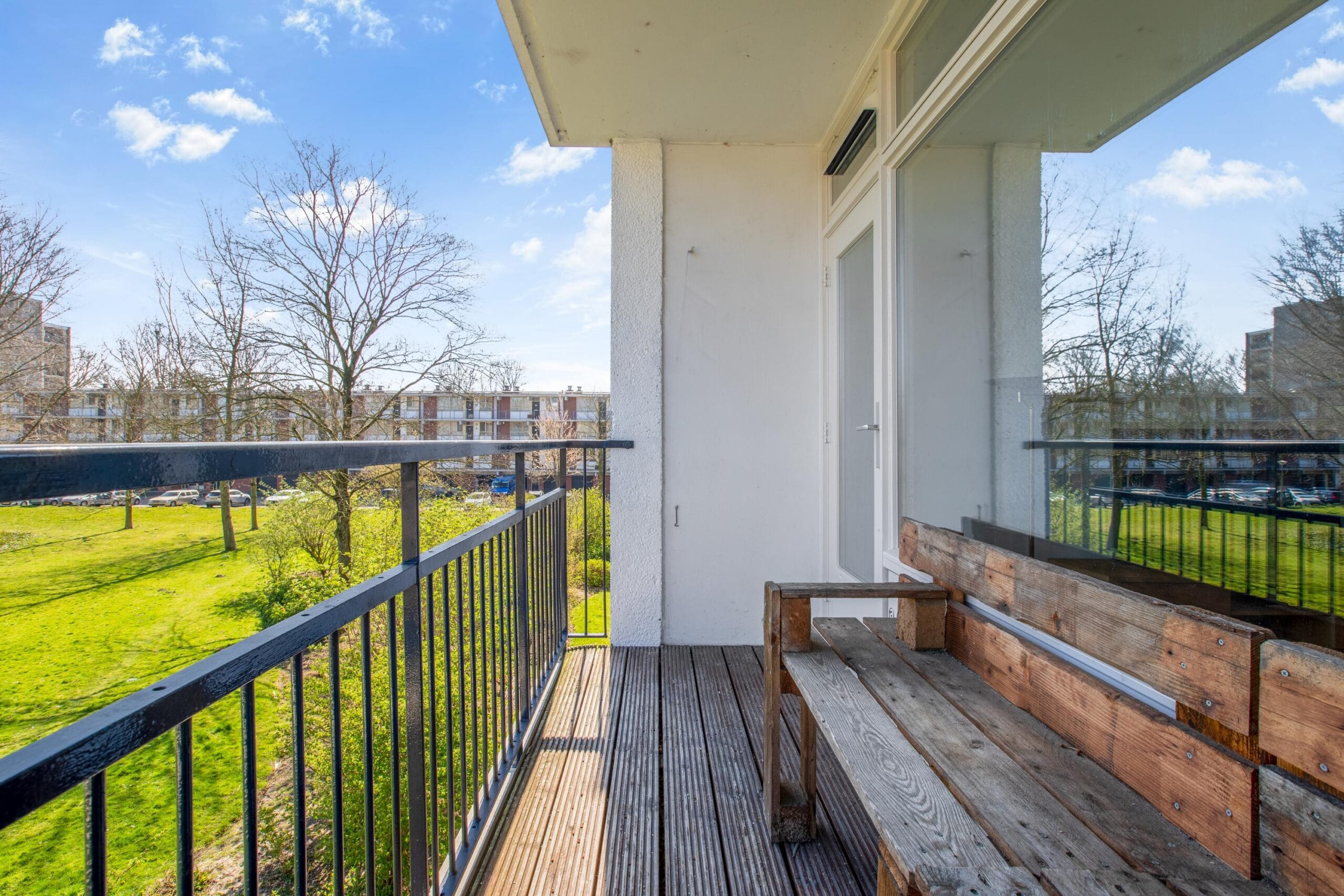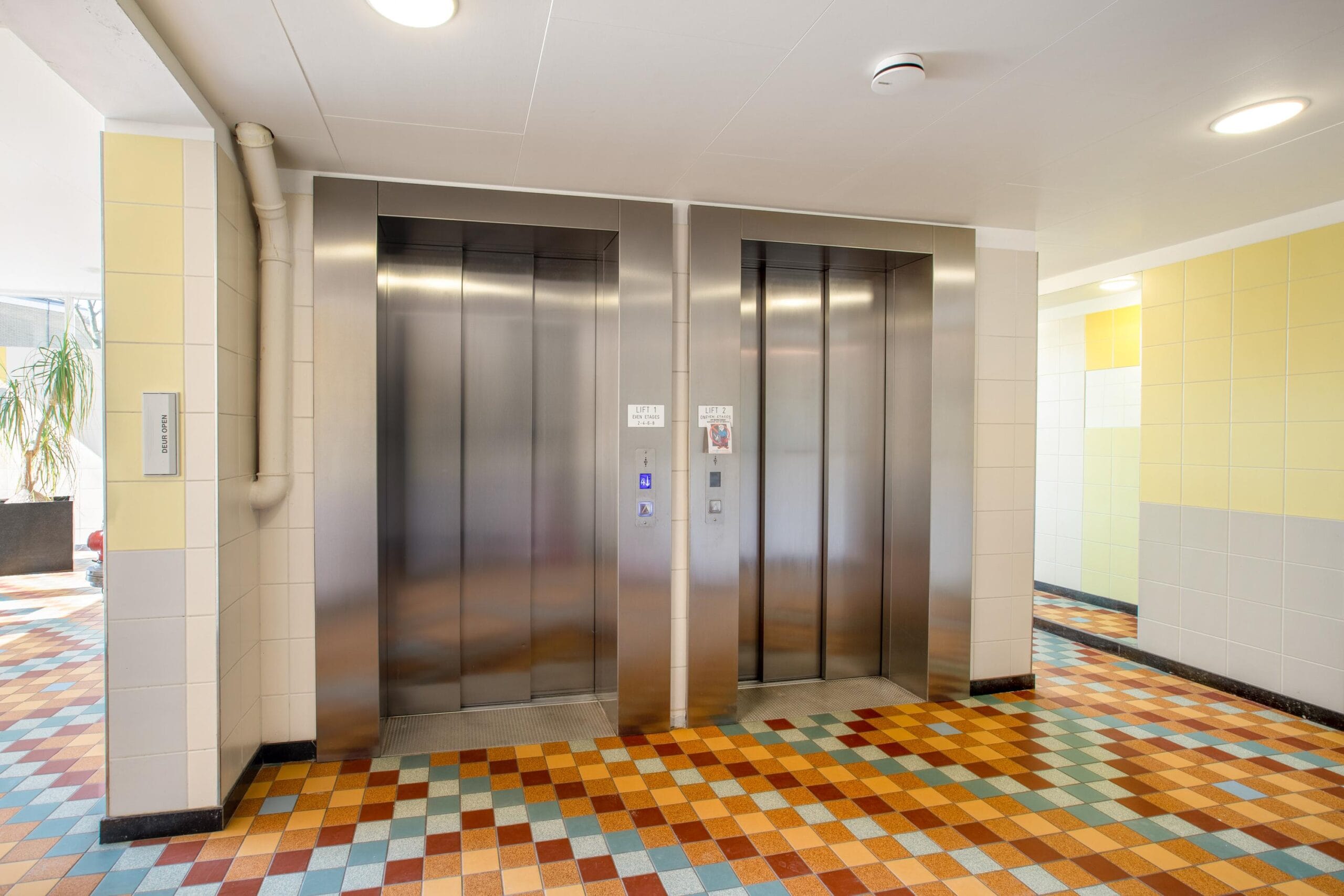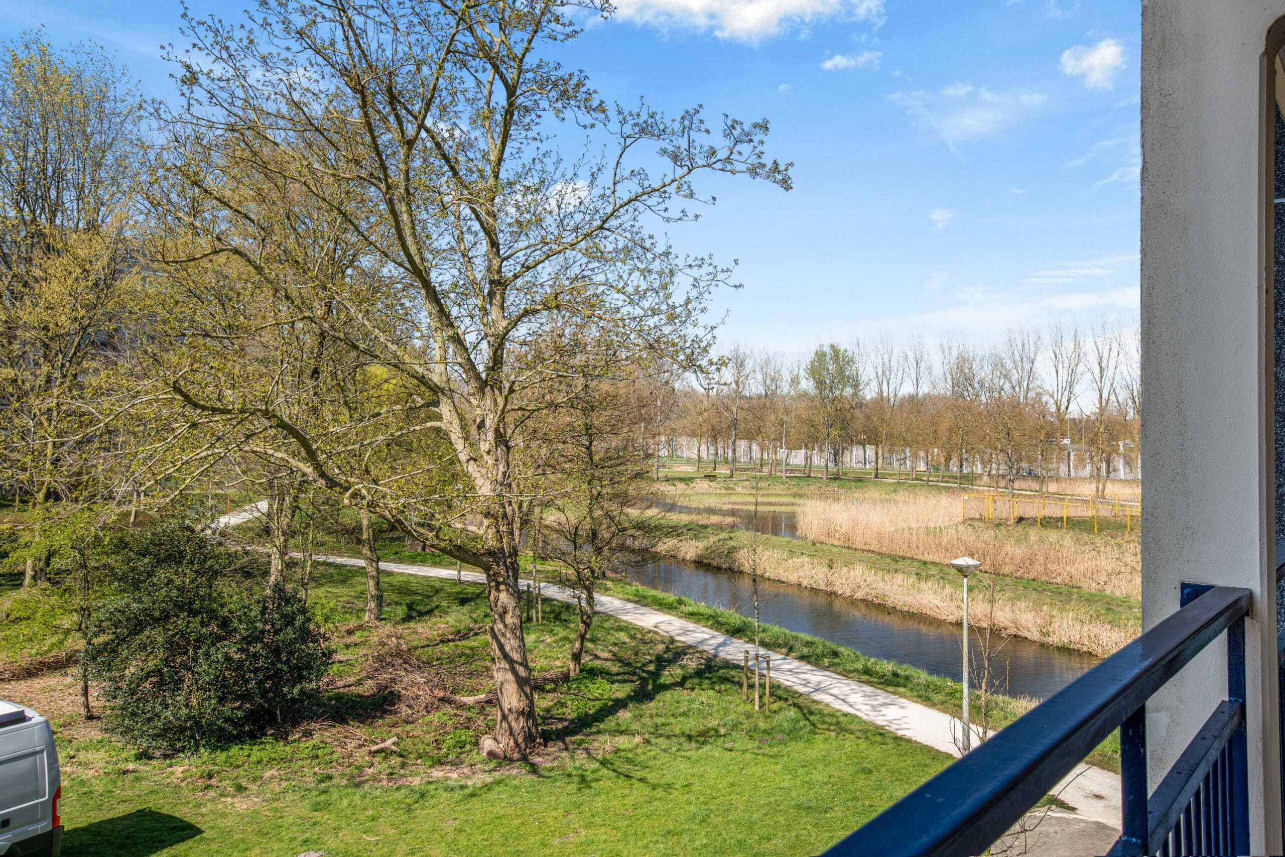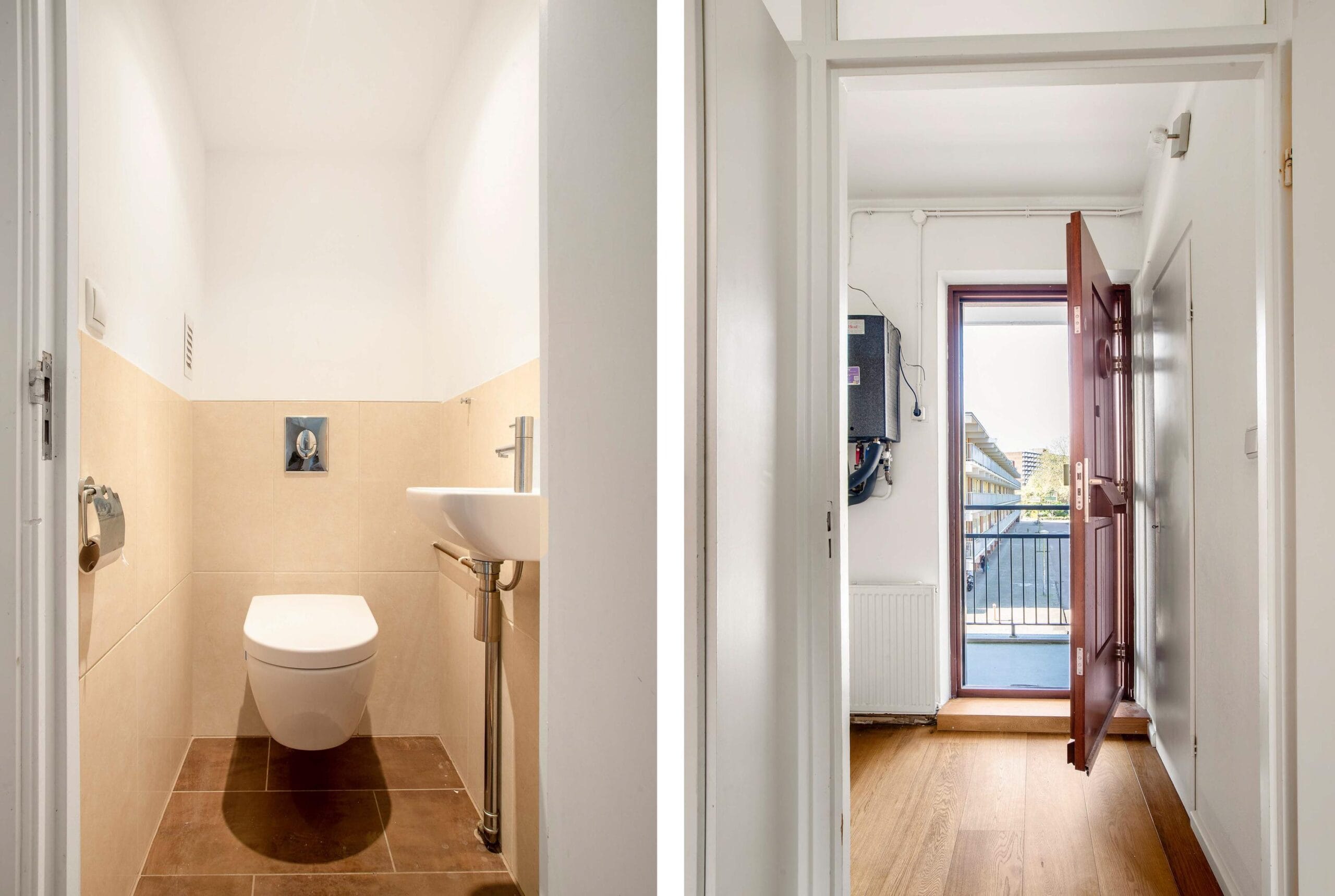 The apartment is located in Building B and is part of a well-kept apartment complex with an active and professionally managed owners’ association (VvE). You enter the building via the communal entrance with an intercom and mailboxes. Thanks to the elevator and wide corridors, the complex is easily accessible for people with reduced mobility. The apartment is on the second floor. Upon entering the hallway, the first thing you notice is how bright the apartment is, thanks to the large windows offering an open view. The central hallway provides access to a separate toilet with a small sink, and to the semi-open kitchen and living room. The door to the living room features tall stained-glass windows, creating a bright and open feel on both sides. From the living room, you have access to the balcony with unobstructed views of the landscaped park garden behind.