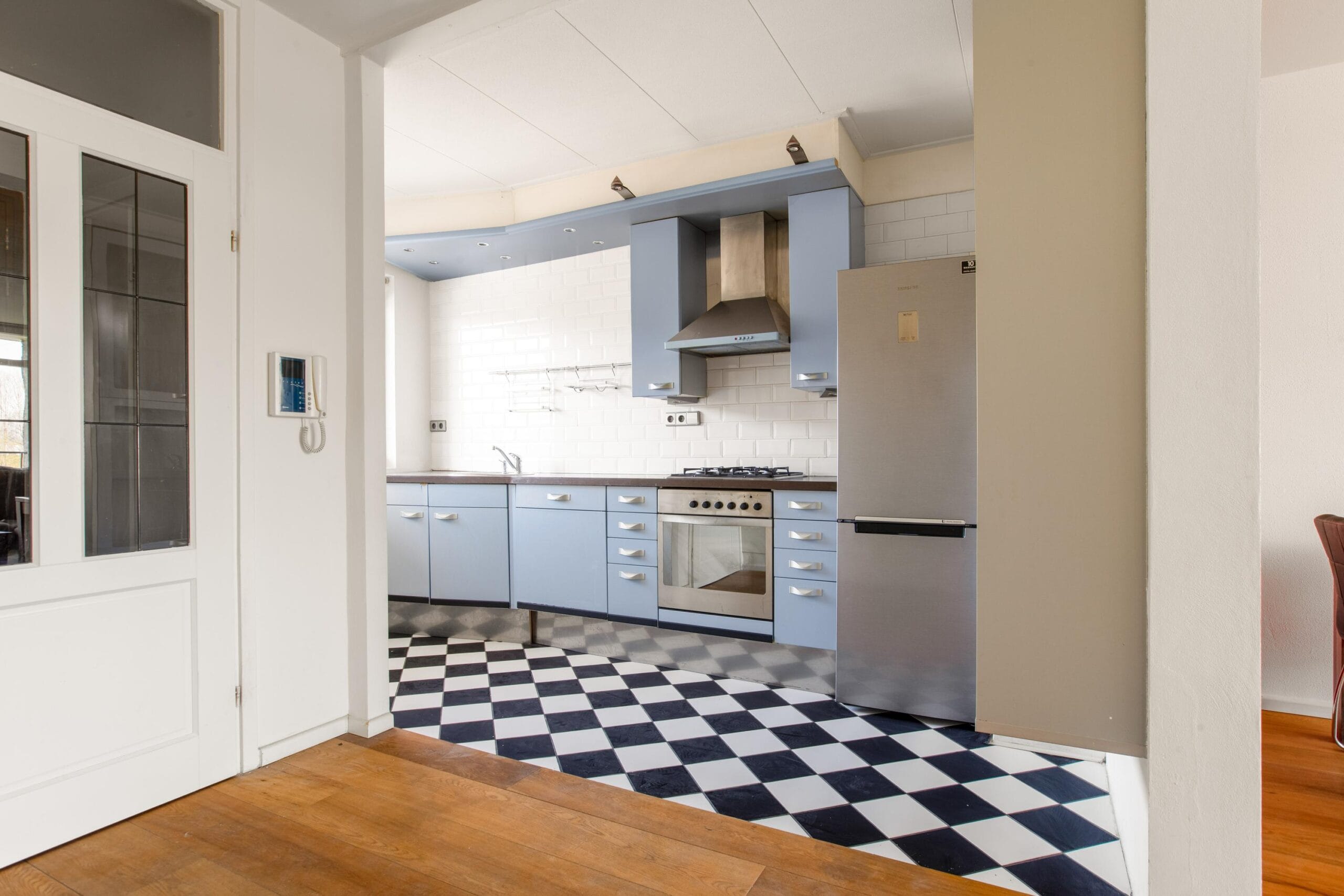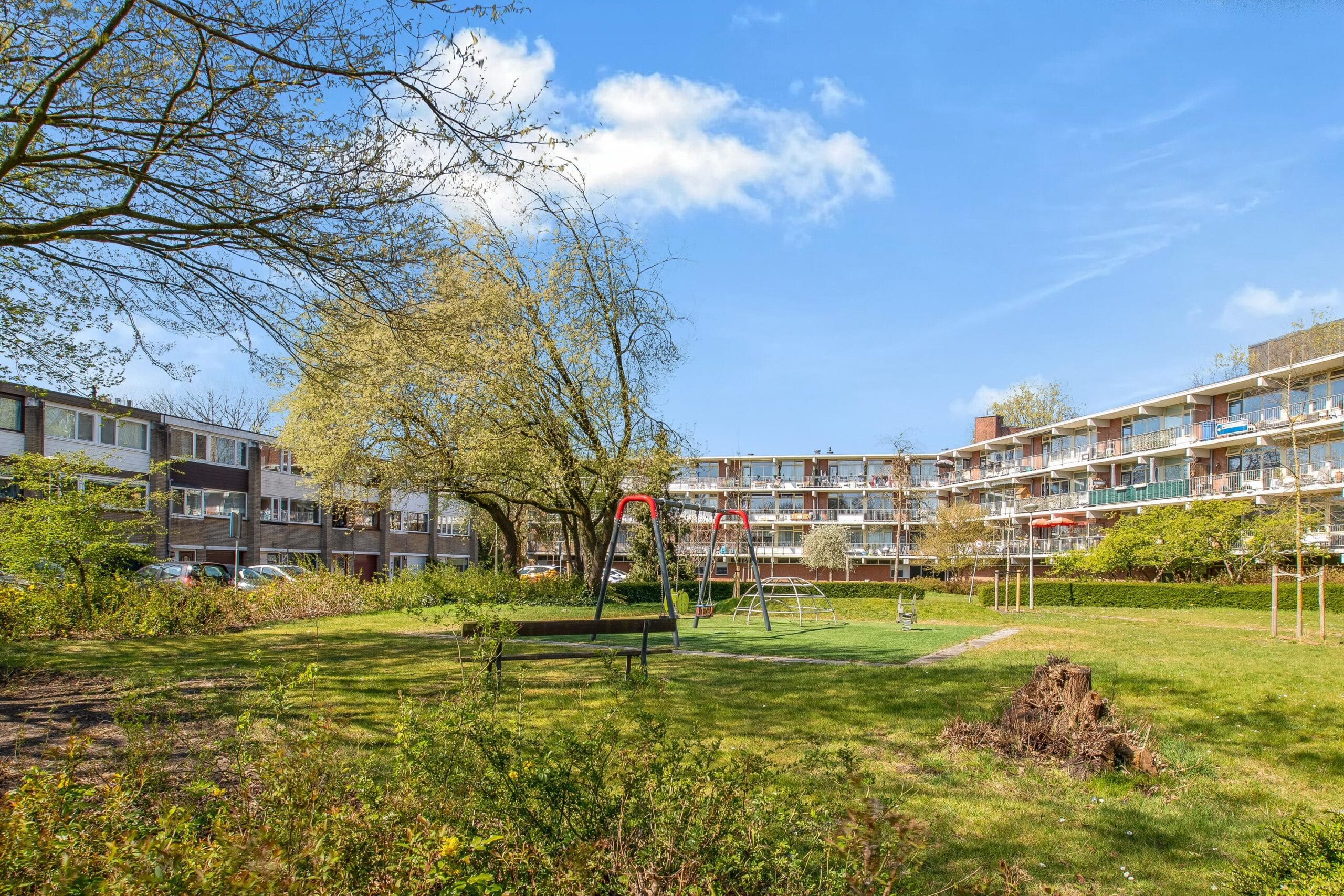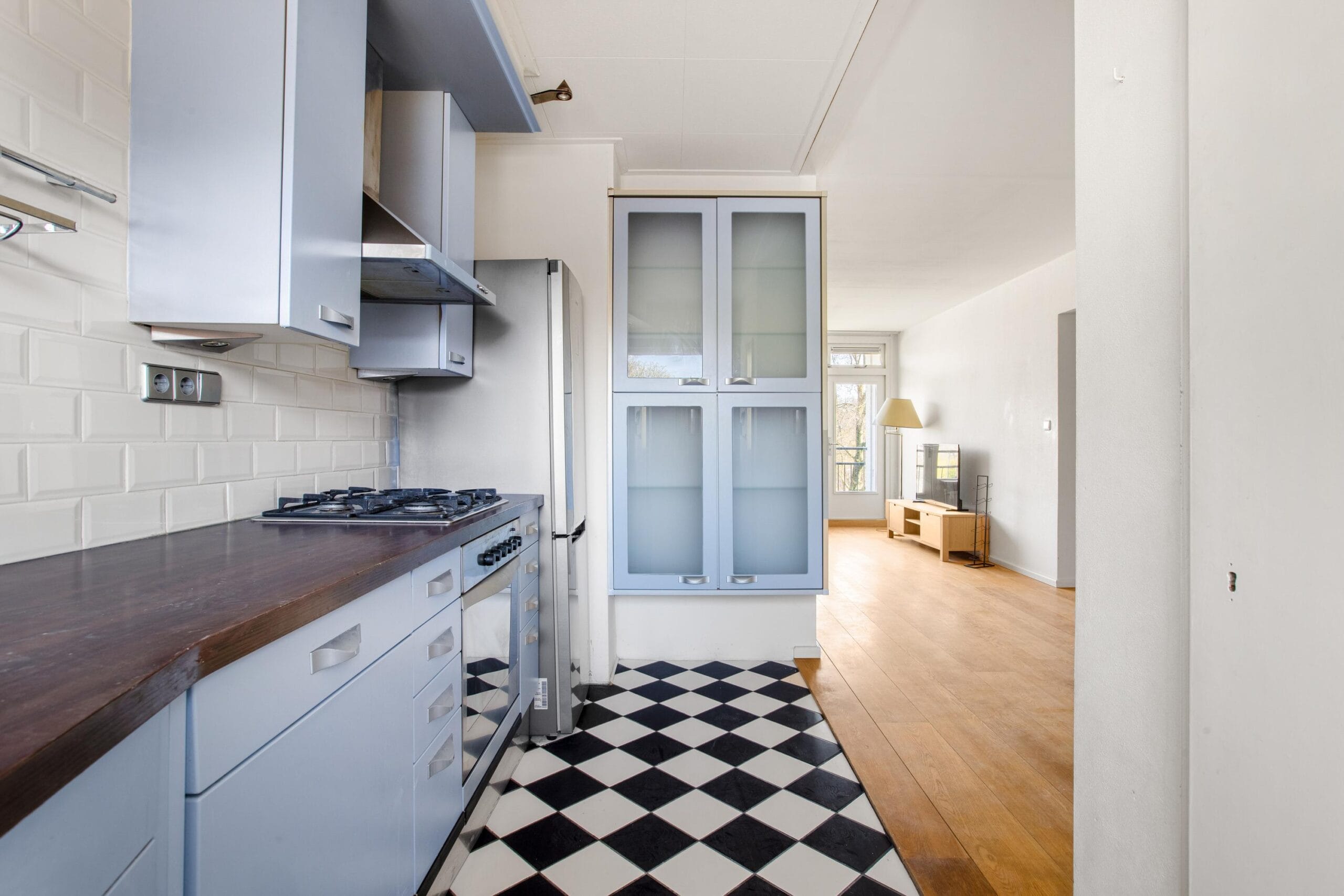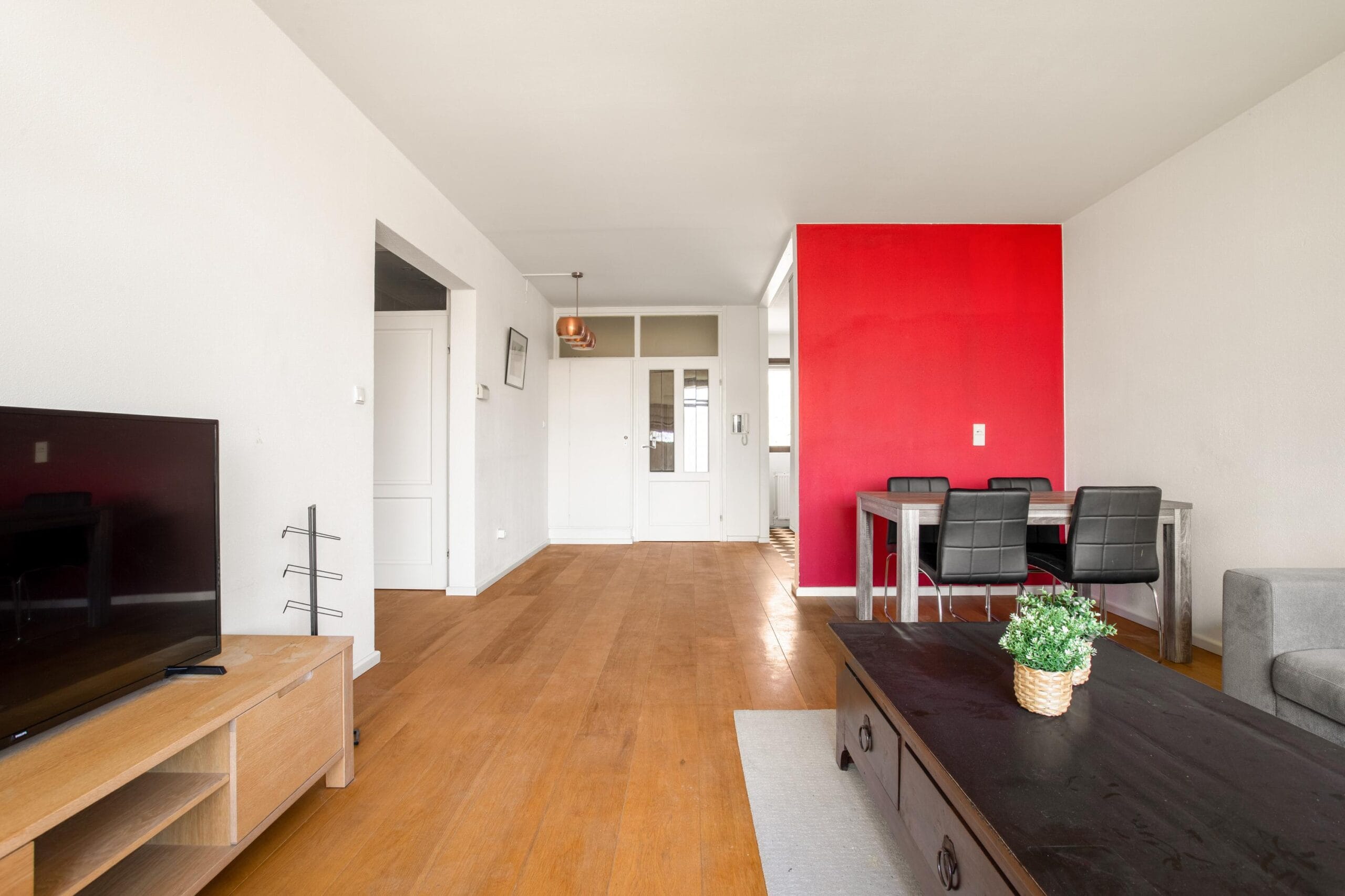 The apartment is located in Building B and is part of a well-kept apartment complex with an active and professionally managed owners’ association (VvE). You enter the building via the communal entrance with an intercom and mailboxes. Thanks to the elevator and wide corridors, the complex is easily accessible for people with reduced mobility. The apartment is on the second floor. Upon entering the hallway, the first thing you notice is how bright the apartment is, thanks to the large windows offering an open view. The central hallway provides access to a separate toilet with a small sink, and to the semi-open kitchen and living room. The door to the living room features tall stained-glass windows, creating a bright and open feel on both sides. From the living room, you have access to the balcony with unobstructed views of the landscaped park garden behind.
