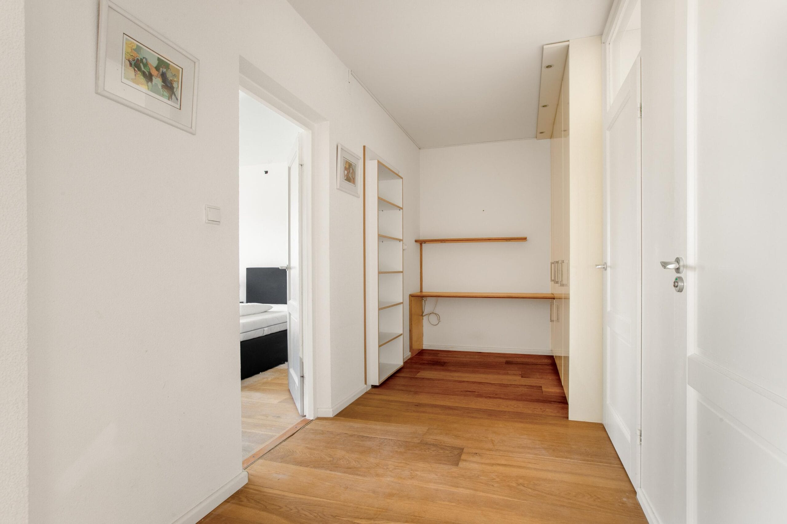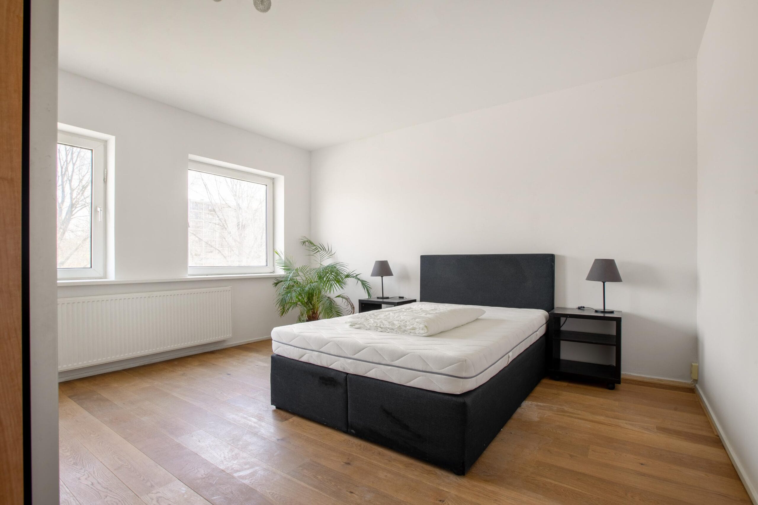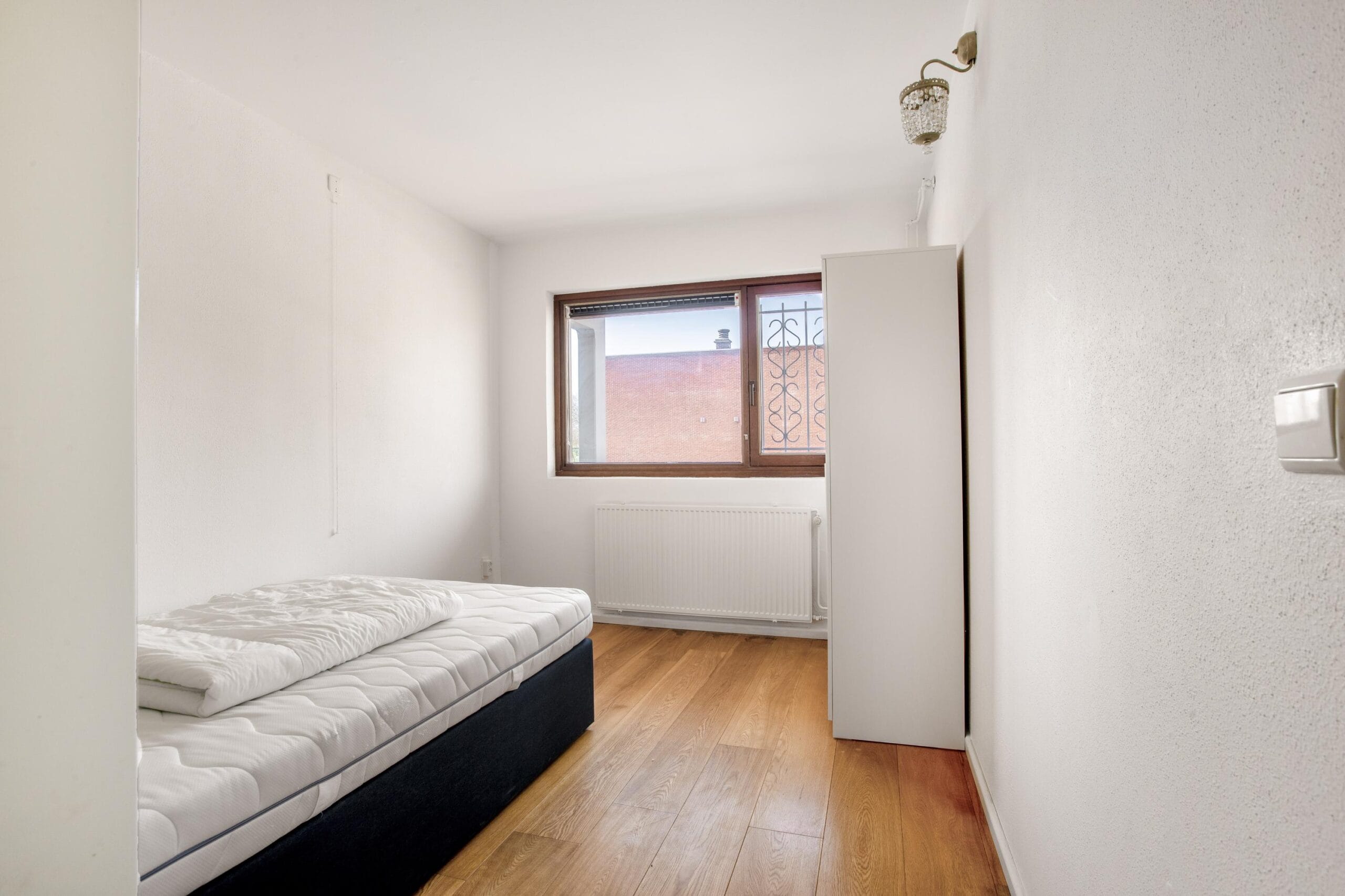 The large windows allow for plenty of natural light and give the home a spacious and comfortable atmosphere. The kitchen is practically laid out and equipped with built-in appliances. With plenty of cupboard space, it’s perfect for cooking and dining enthusiasts. The floor features playful patterned tiles. The bright hallway, flanked by two generously sized bedrooms, includes extra storage space in the form of two built-in closets. The bedrooms are bright and airy due to their large windows. The master bedroom is spacious enough for a double bed and a large wardrobe. The second bedroom is ideal as an office, children’s room, or hobby space—the possibilities are endless.
