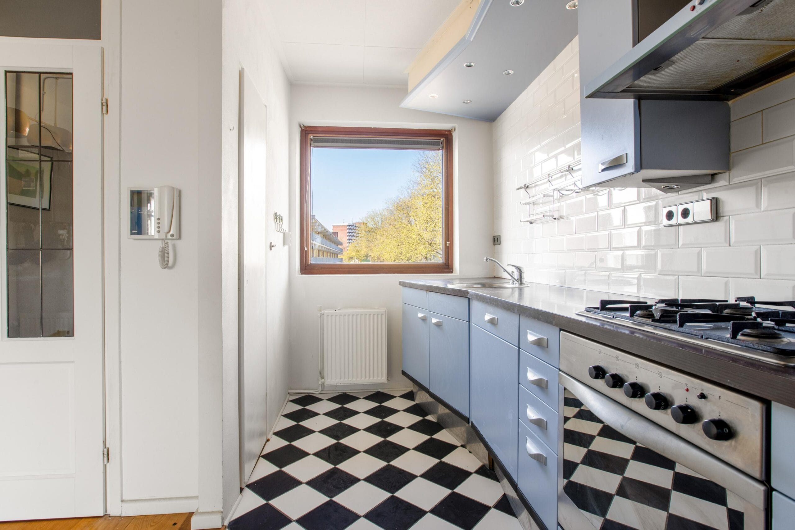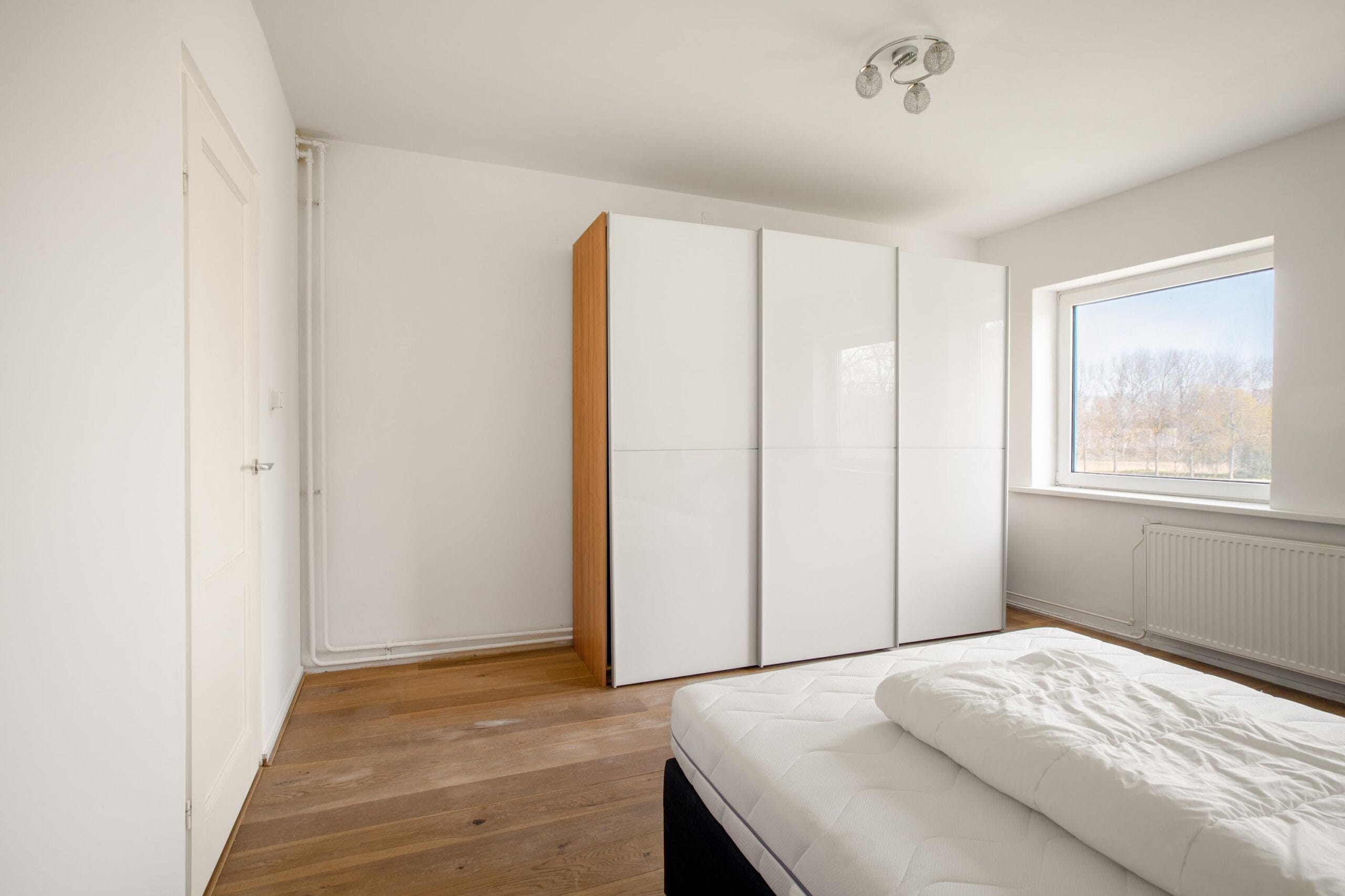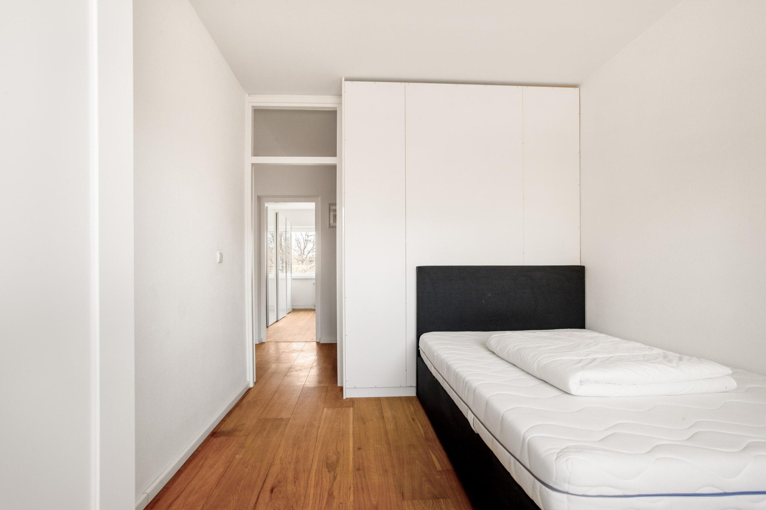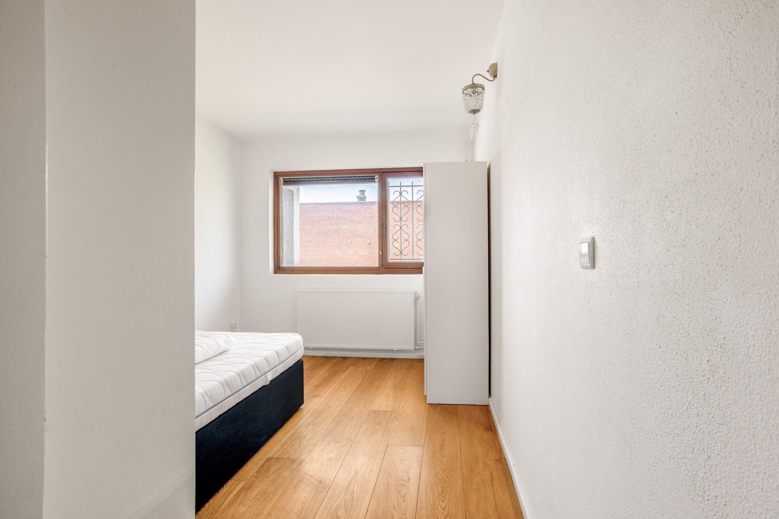 The large windows allow for plenty of natural light and give the home a spacious and comfortable atmosphere. The kitchen is practically laid out and equipped with built-in appliances. With plenty of cupboard space, it’s perfect for cooking and dining enthusiasts. The floor features playful patterned tiles. The bright hallway, flanked by two generously sized bedrooms, includes extra storage space in the form of two built-in closets. The bedrooms are bright and airy due to their large windows. The master bedroom is spacious enough for a double bed and a large wardrobe. The second bedroom is ideal as an office, children’s room, or hobby space—the possibilities are endless.