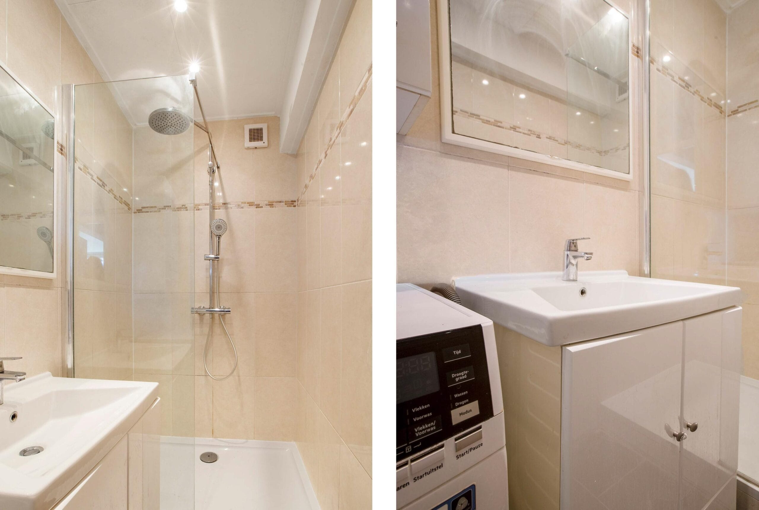 In de centrale hal geeft toegang tot de badkamer, de badkamer is voorzien van een nette tegels die doorlopen tot aan het plafond. De badkamer beschikt over moderne inloopdouche en wastafelmeubel. Tevens is hier de aansluiting voor de wasmachine.