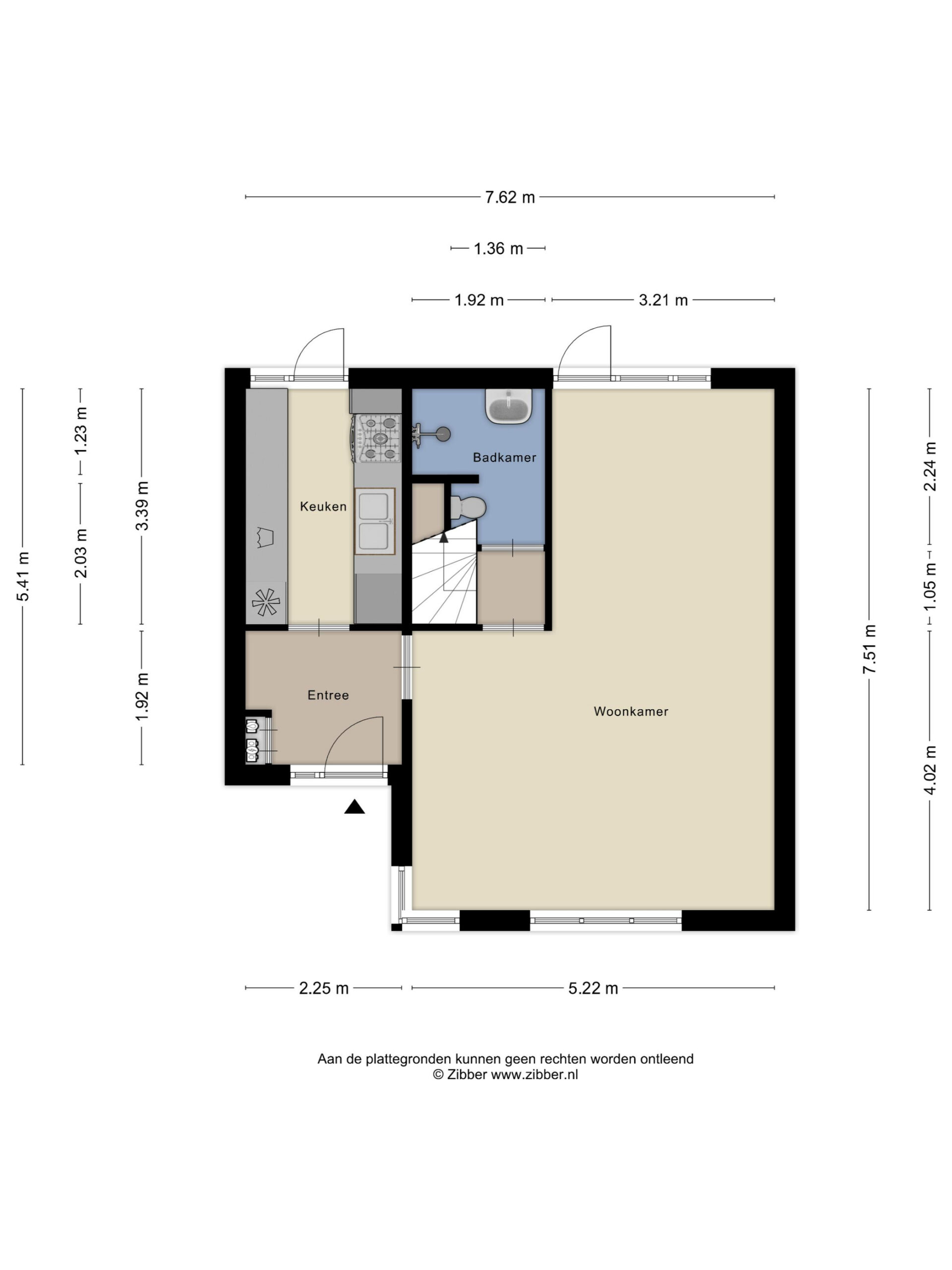 Bij binnenkomst via de voordeur stap je in de hal, met de meterkast aan de linkerzijde en de deur naar de woonkamer rechts. De L-vormige woonkamer is licht door de grote ramen aan beide zijden en is goed in te delen met een zit- en eetgedeelte. In de woonkamer is links de deur naar de badkamer, welke is ingedeeld met een inloopdouche, toilet en wastafel. Rechts bevindt zich de trap naar boven. De keuken heeft een parallelle indeling met een dubbele wasbak, 5 pits gasfornuis met oven en veel opberg kasten en planken. Hier is de aansluiting voor de wasmachine gesitueerd.