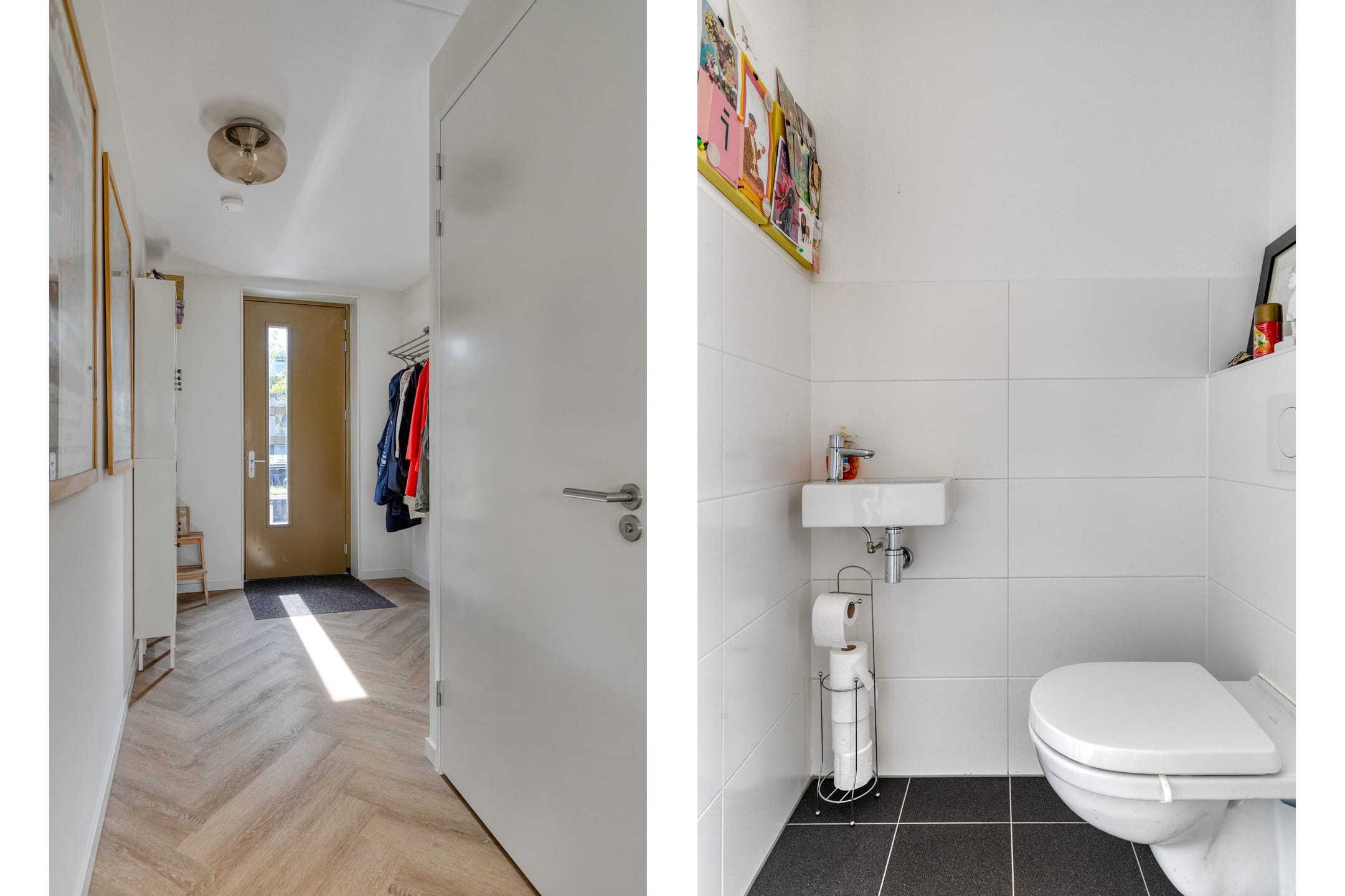 Binnenkomst in een ruime hal met separaat toilet. Vanuit hier stap je de moderne woonkeuken in – het hart van het huis – met een stijlvol kookeiland en hoogwaardige inbouwapparatuur. De pvc-visgraatvloer met vloerverwarming zorgt voor warmte en klasse. Aansluitend de eetkamer, waar plek is voor een royale eettafel. Dankzij de vide geniet je van prachtig licht en extra hoogte.
