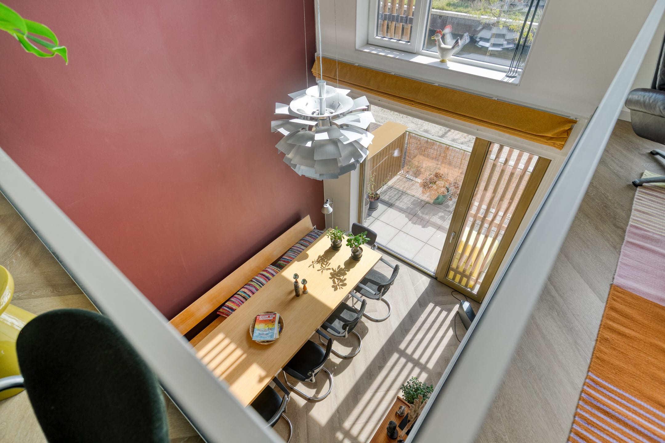 Via the open staircase you reach the playful living room. From here you overlook the dining area and mezzanine. A cozy sitting area has been created – perfect for movie nights or for winding down.