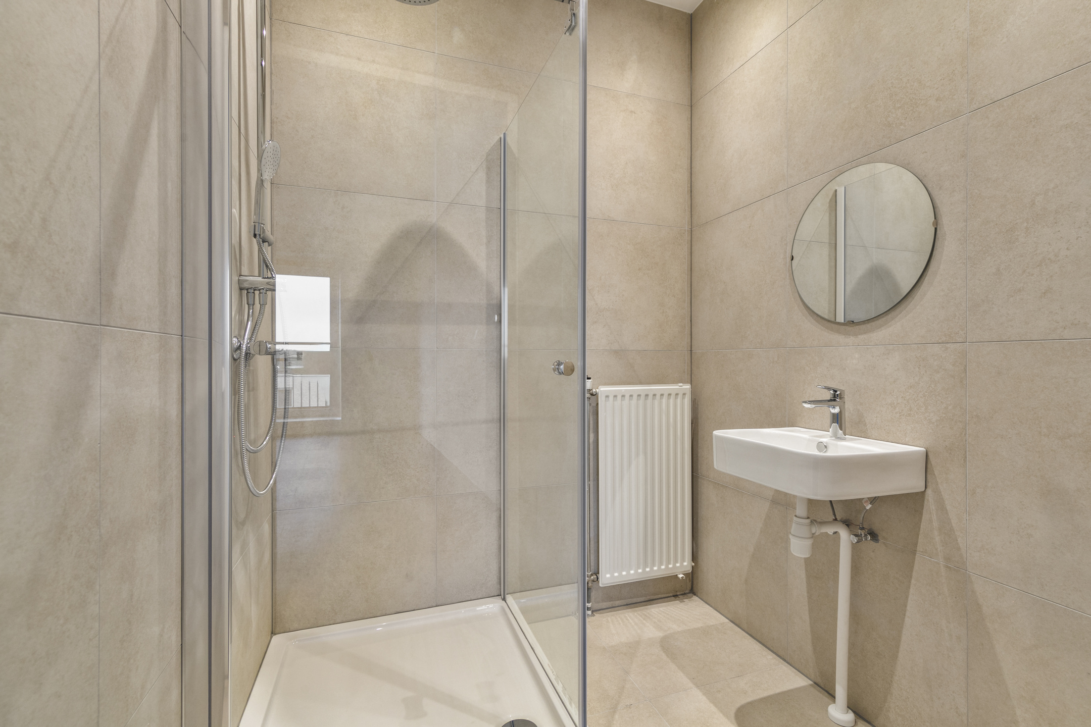 De ruime en goed onderhouden slaapkamer biedt een rustige plek om te ontspannen. Dankzij de royale afmetingen is er genoeg ruimte voor een comfortabel bed, een bureau of een extra opbergmeubel. De grote raampartijen zorgen voor een prettige hoeveelheid natuurlijk licht, wat bijdraagt aan de rustgevende sfeer in deze kamer. De woning beschikt over een in 2025 vernieuwde nette en volledig betegelde badkamer. Hier vindt u een ruime douche en wastafel en de witgoedaansluiting. De tevens vernieuwde wc in 2025 bevindt zich in een separate ruimte voor extra gemak en privacy.