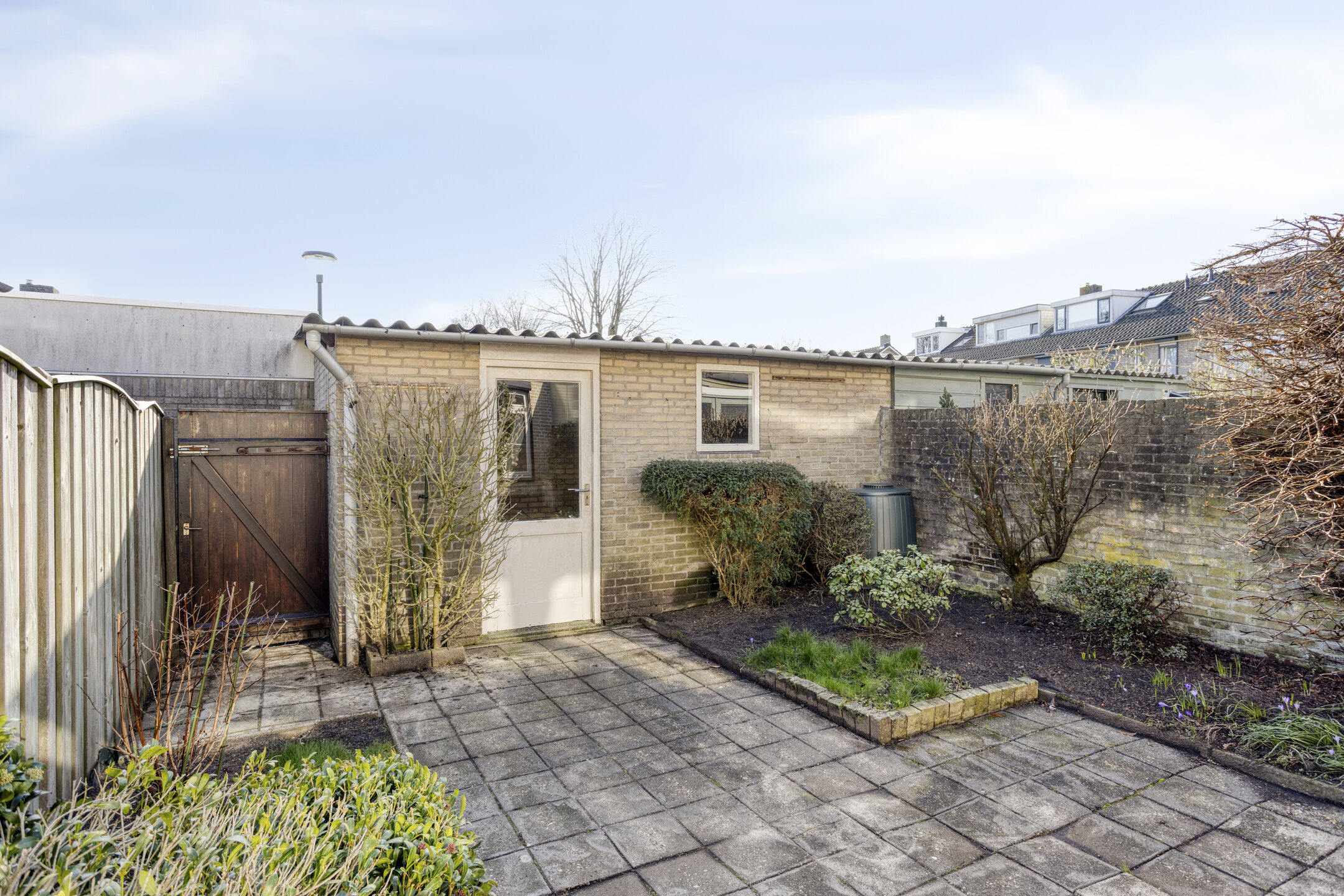 The sunny backyard offers privacy and enough space to comfortably enjoy outdoor living. It is a pleasant place to relax or to let children play safely. The stone storage shed is spacious and equipped with electricity. The garden also has a rear entrance.