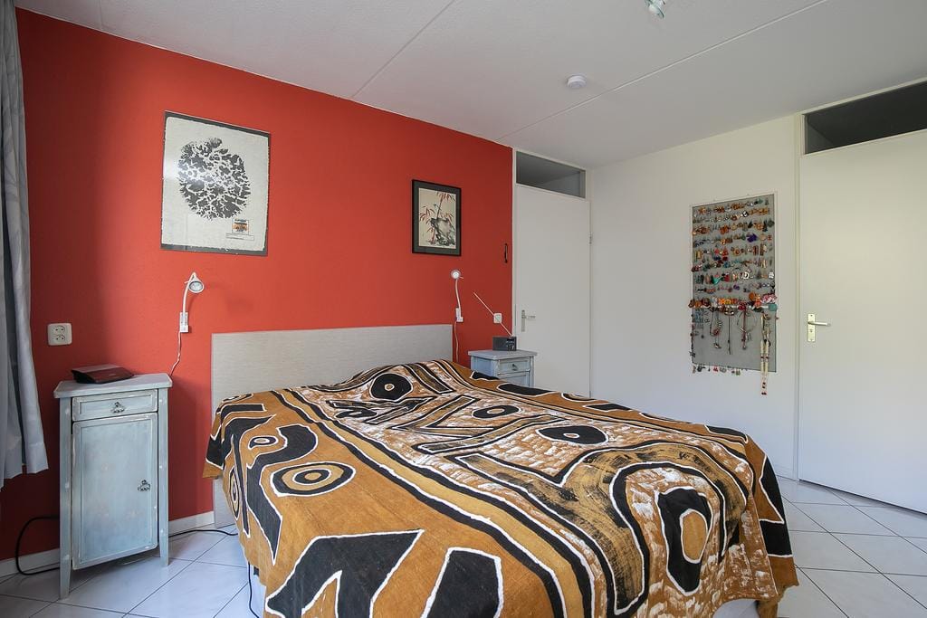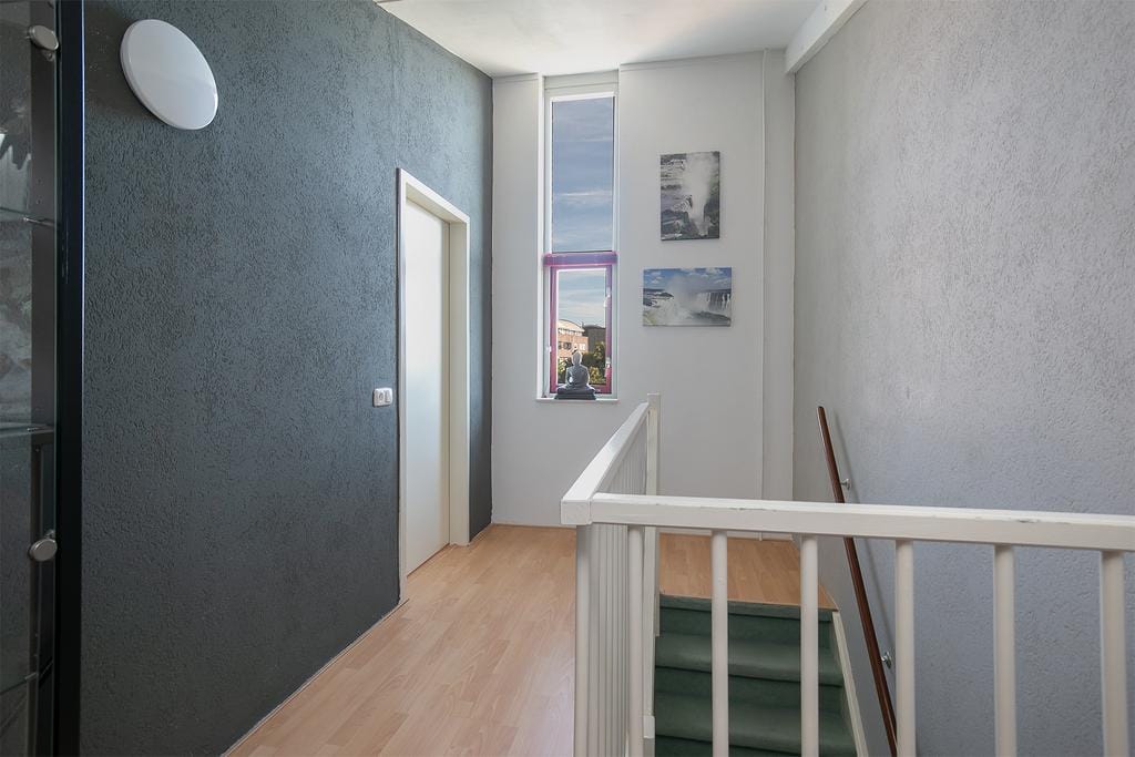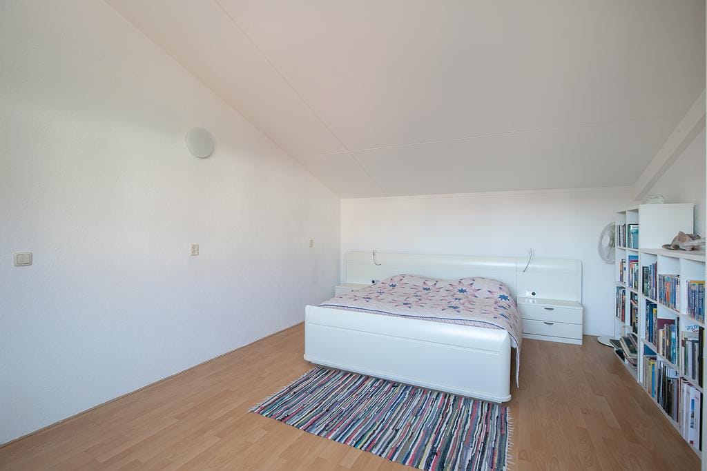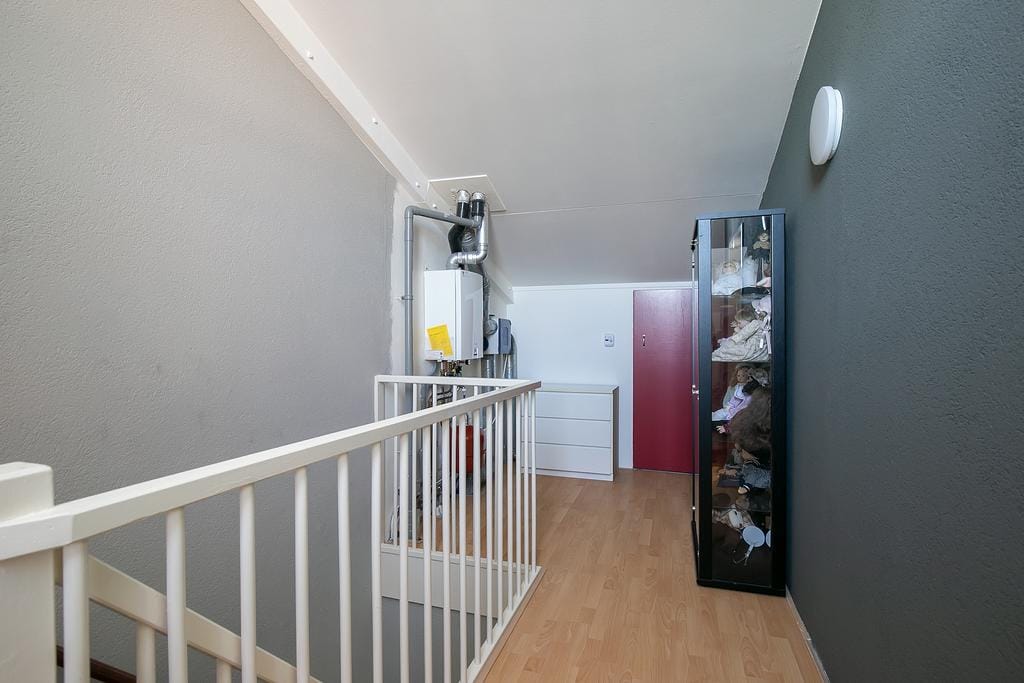 Vanuit de hal bevindt zich de trap die leidt naar de eerste verdieping. Op de overloop is de CV-ketel en de toegang tot de zeer grote bergzolder te vinden. Hier is de tweede grote slaapkamer gelegen. Ideaal als u gasten heeft die blijven overnachten. Door het grote raam, met uitzicht op het plantsoen, heeft deze kamer ook een mooie natuurlijke lichtinval.