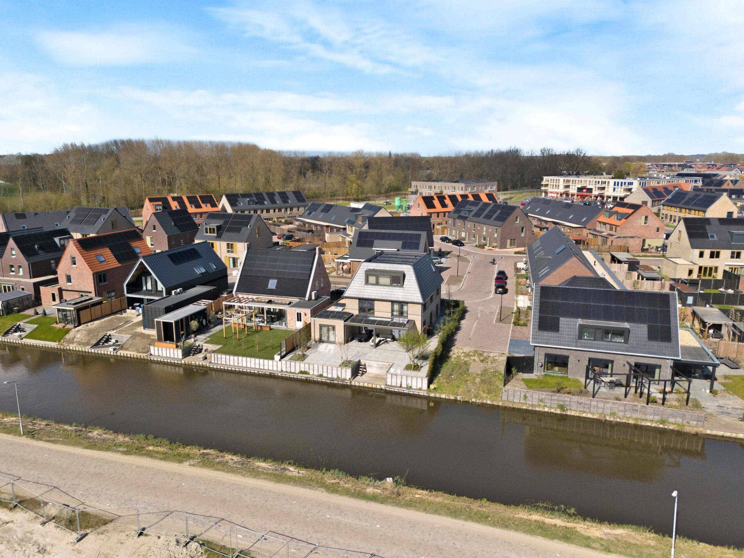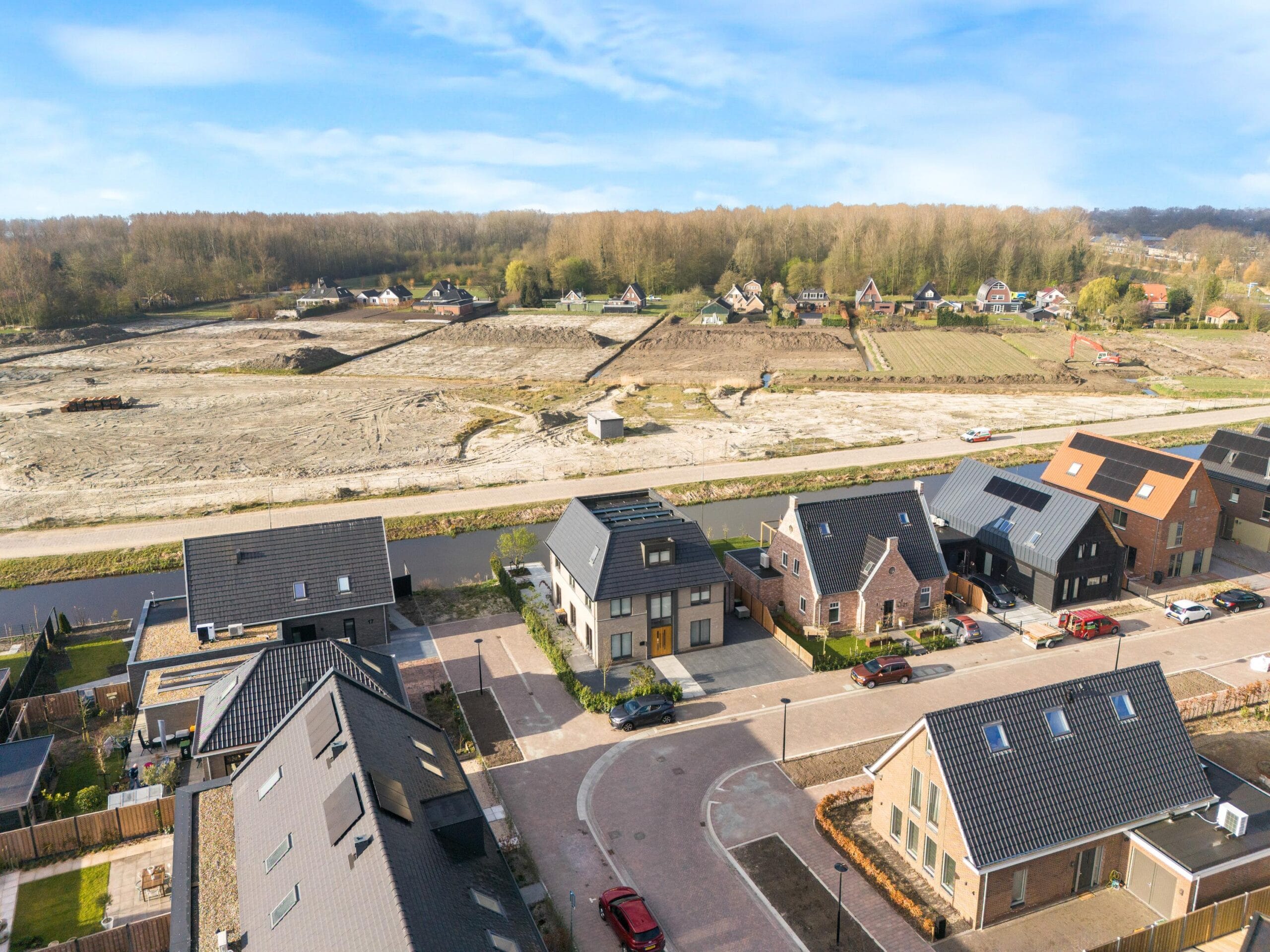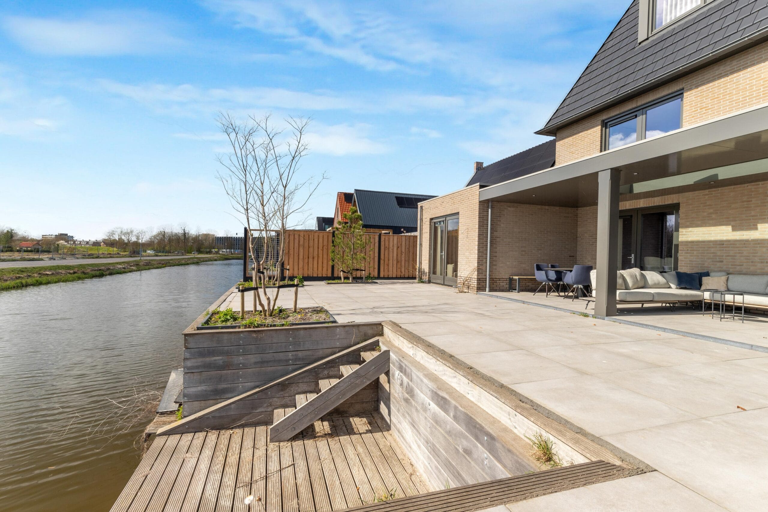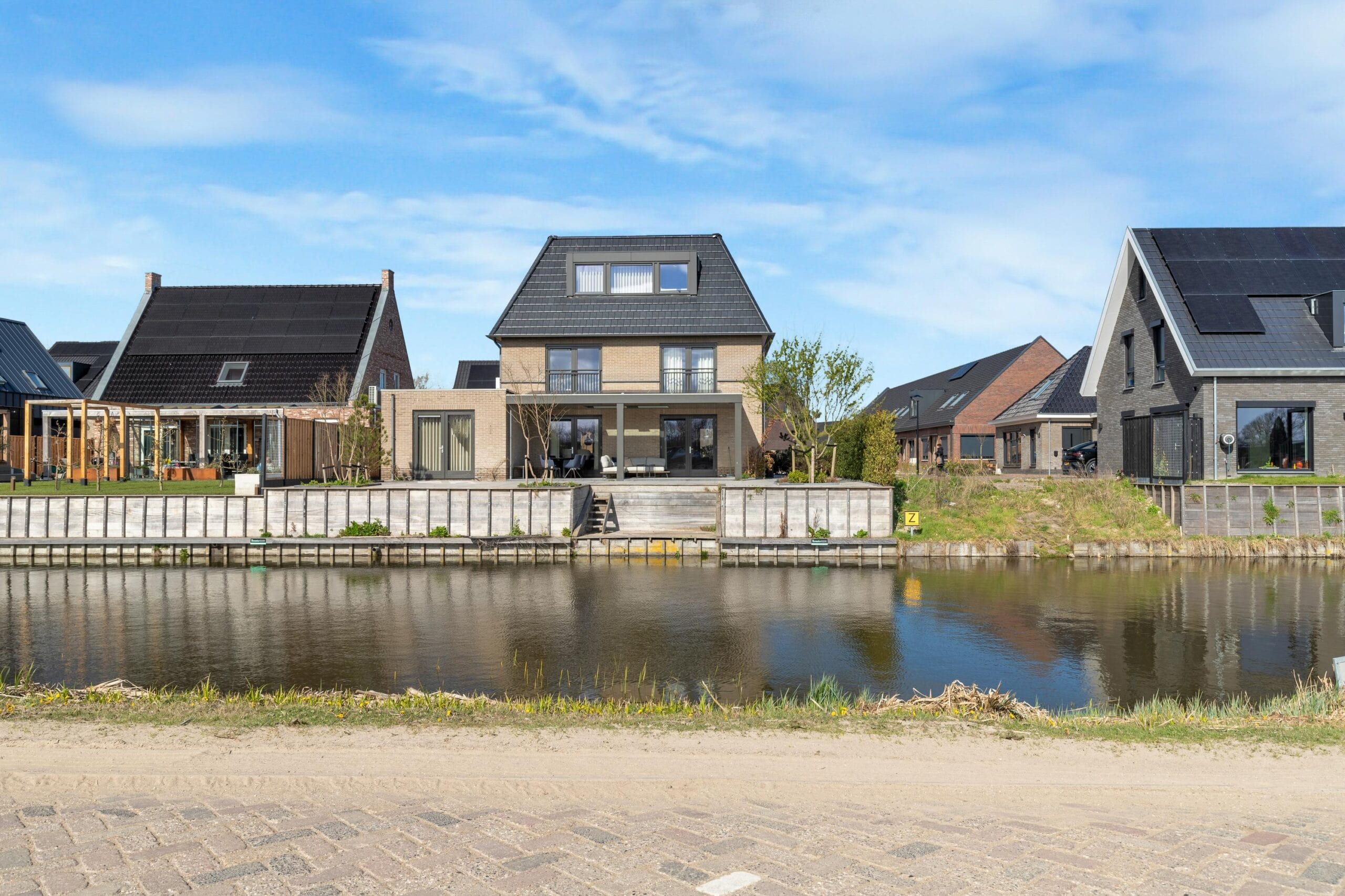 The house has a lovely garden around the house. So you have a nice sun at any time of the day. At the rear of the house is a very spacious veranda where you can enjoy yourself until the late hours. There is a jetty on the water where you can relax. At the front of the house you can easily park 3 cars on your own property. Of course there is a charging point for an electric car. With the 26 solar panels, electric driving is very attractive! At the front there is also access to the adjacent garage that is located to the right of the house. You can walk around the house on both the left and right.