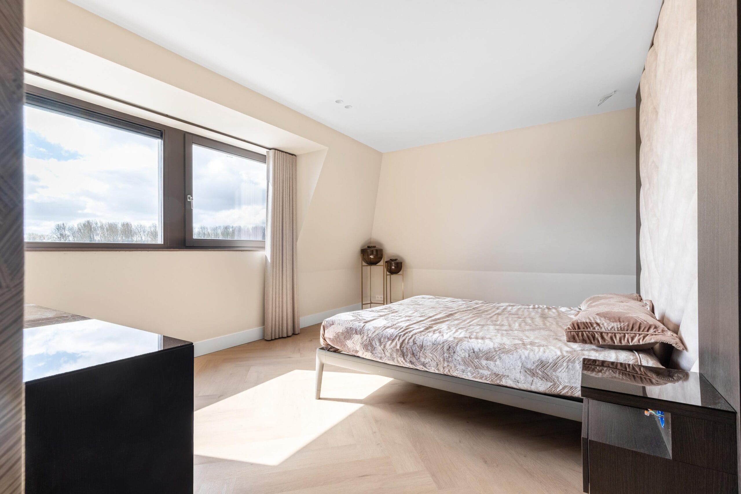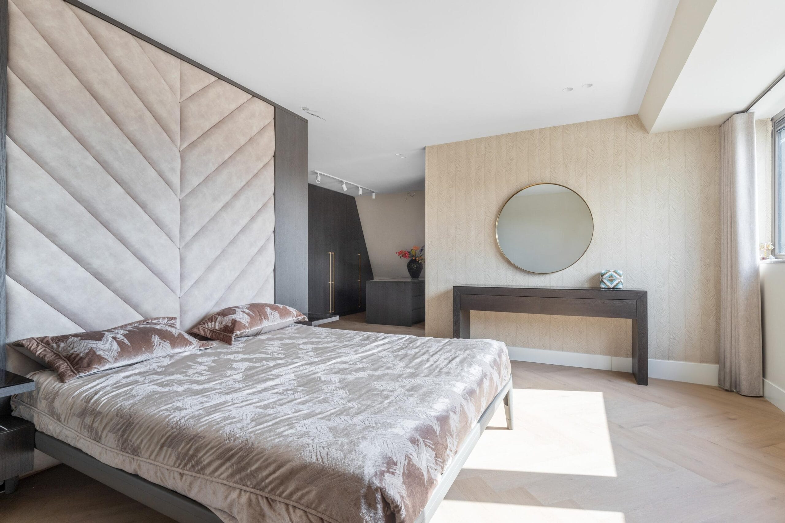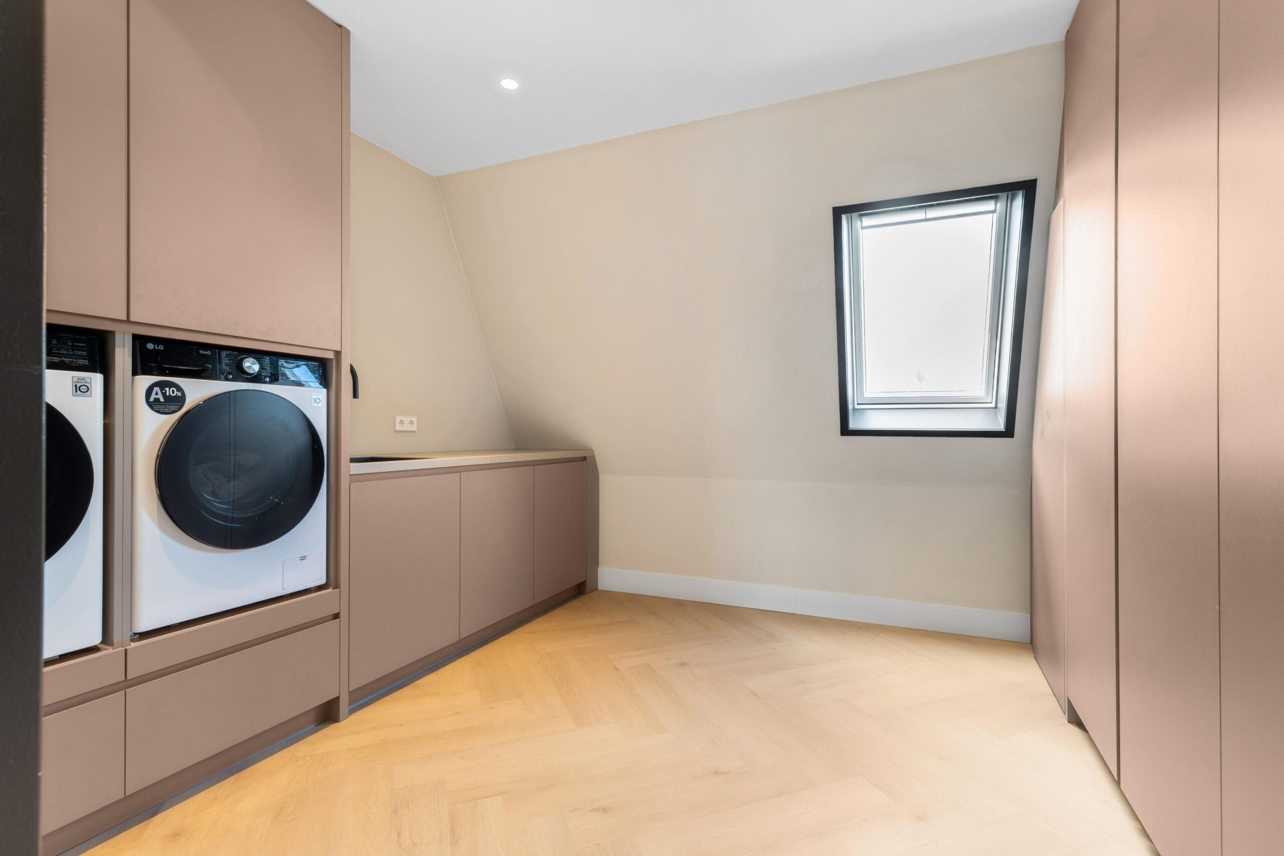 This floor can also be reached both by stairs and by elevator and can rightly be called an ‘owners floor’. On this floor there are 2 bedrooms, 1 of which functions as a laundry room. Furthermore, on this floor there is also a separate toilet and a spacious storage room. The Master bedroom is spectacularly large. This wonderfully light space has a spacious walk-in closet for him and for her. There is also a luxurious bathroom adjacent to this room with all facilities such as a large bath, rain shower and double sink.