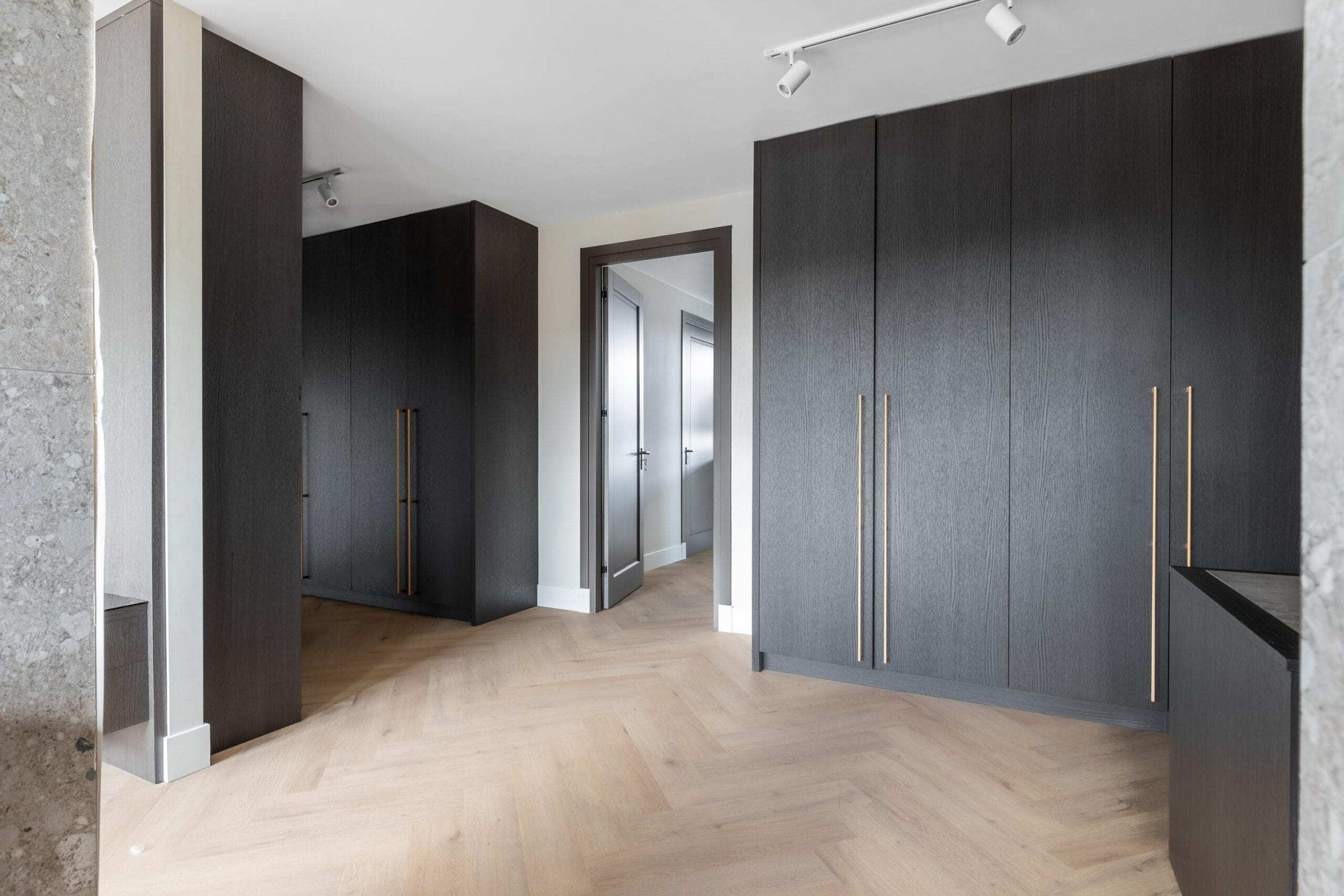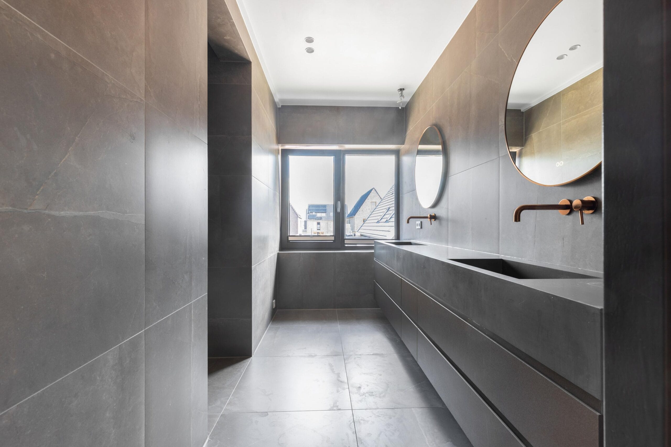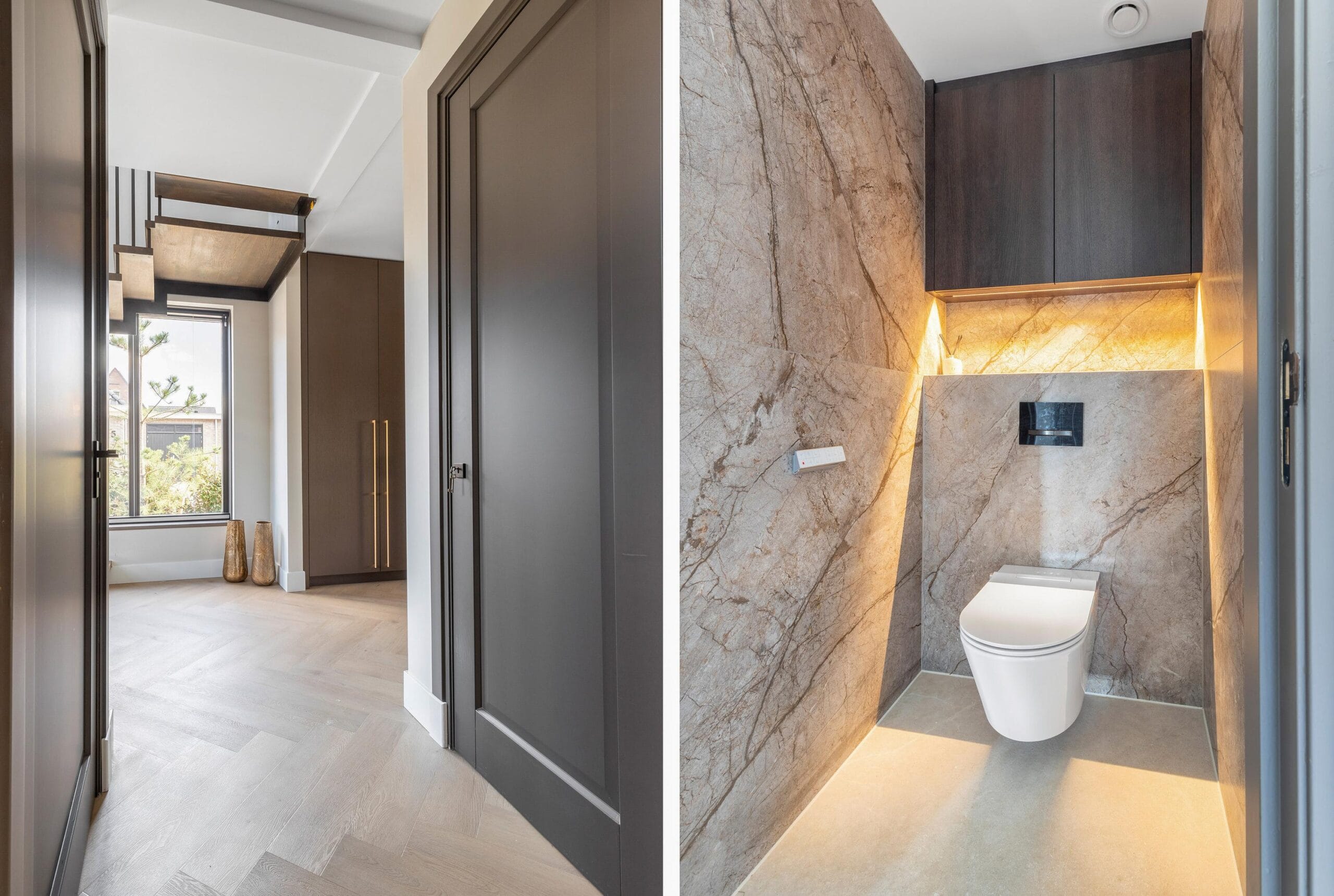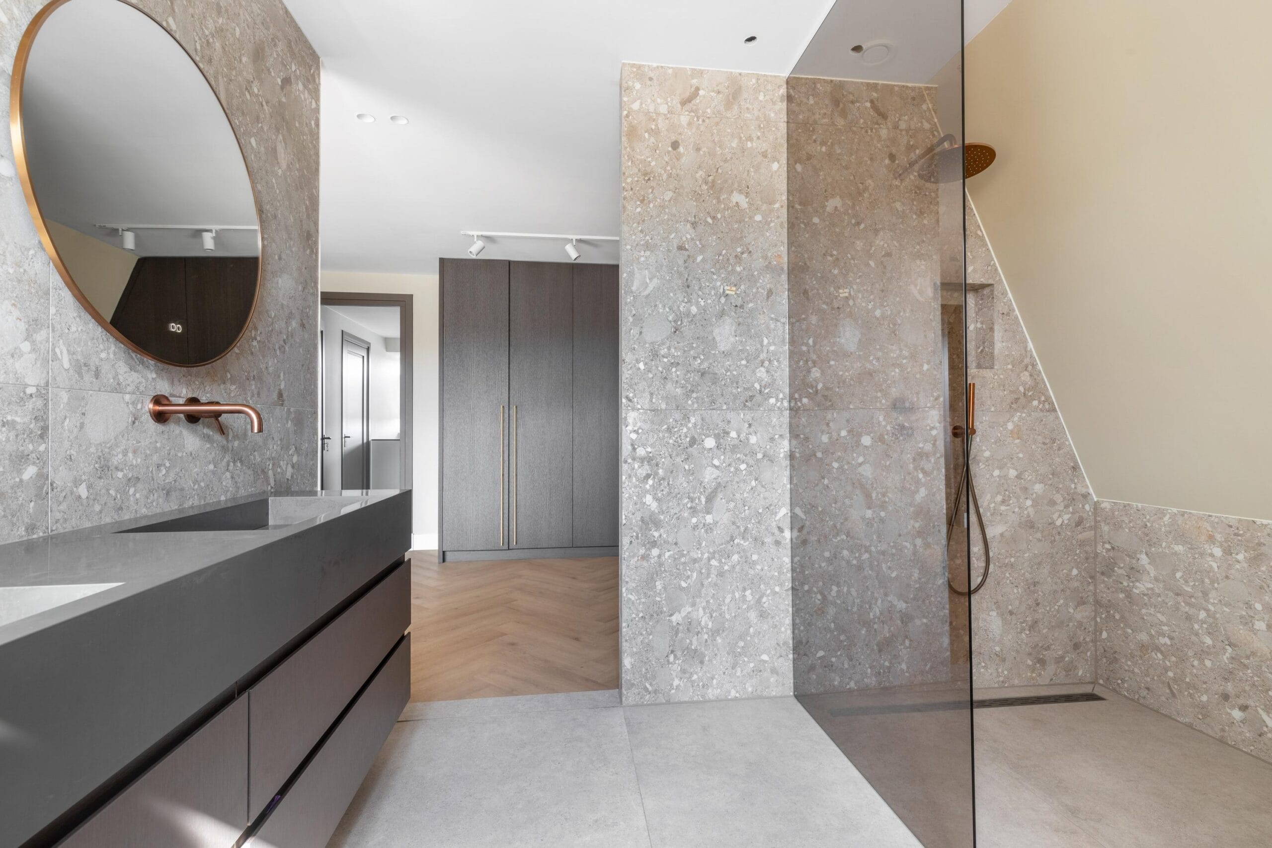 You reach the first floor via the stairs or the elevator. This is the floor with the most bedrooms, a separate toilet and a luxurious bathroom. Of the 4 bedrooms, 2 have their own walk-in closet. In short, plenty of space for a large family or multiple hobby rooms. The bathroom exudes a luxurious atmosphere due to the use of dark natural stone tiles, a double sink and a wonderfully spacious rain shower.