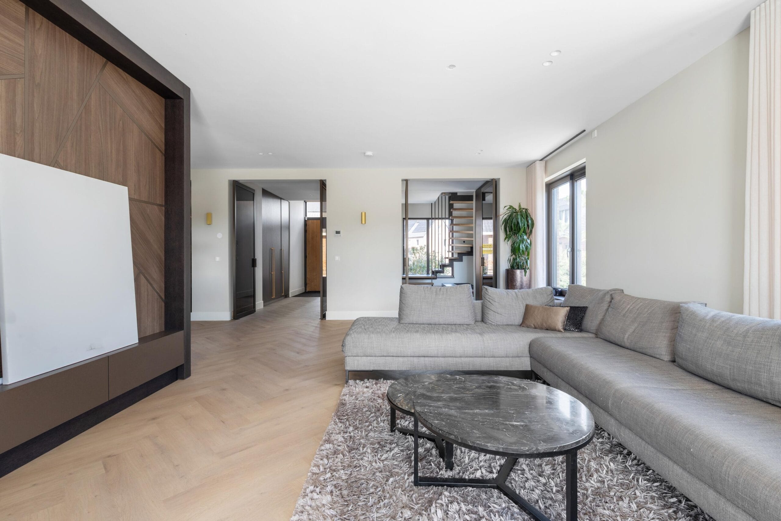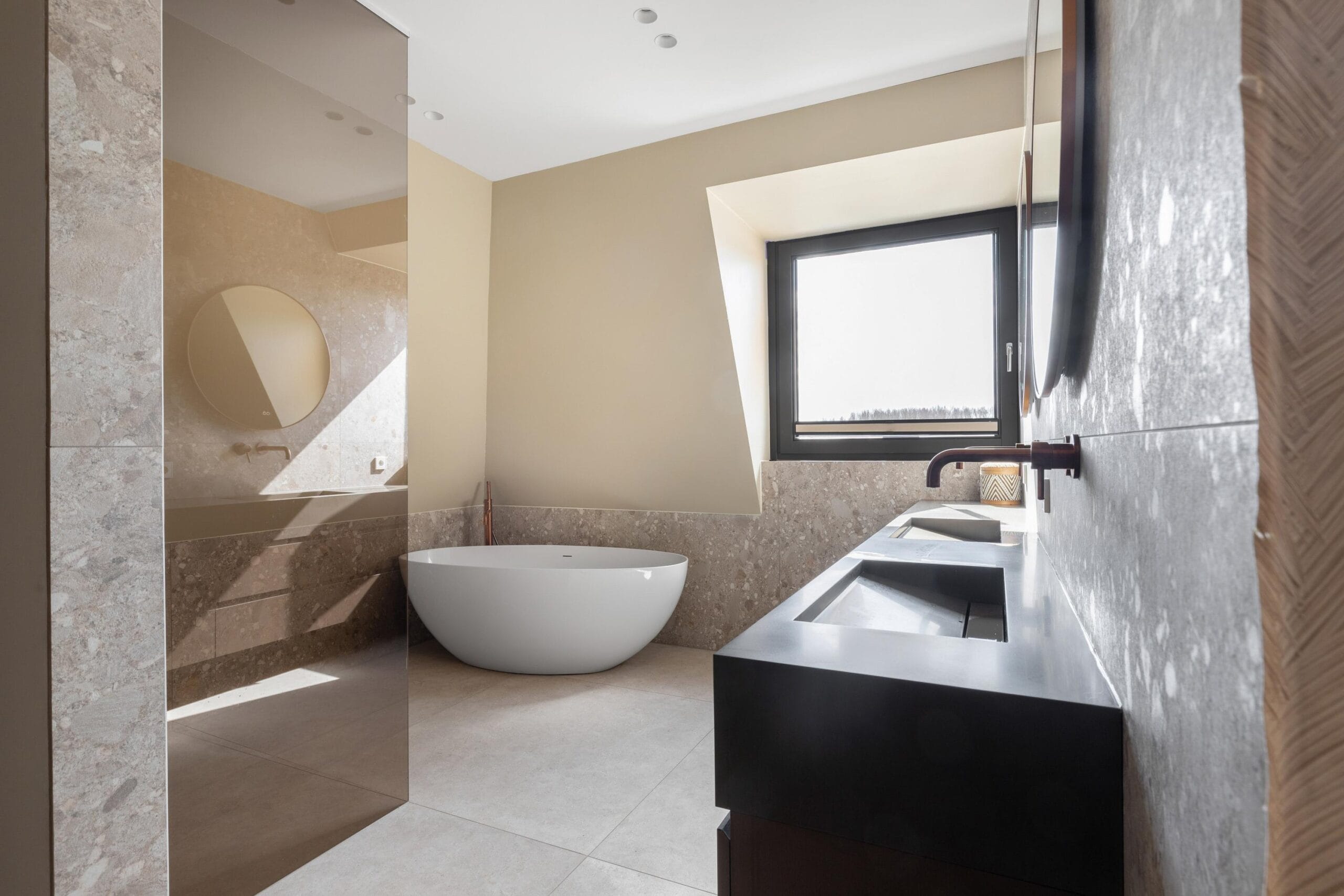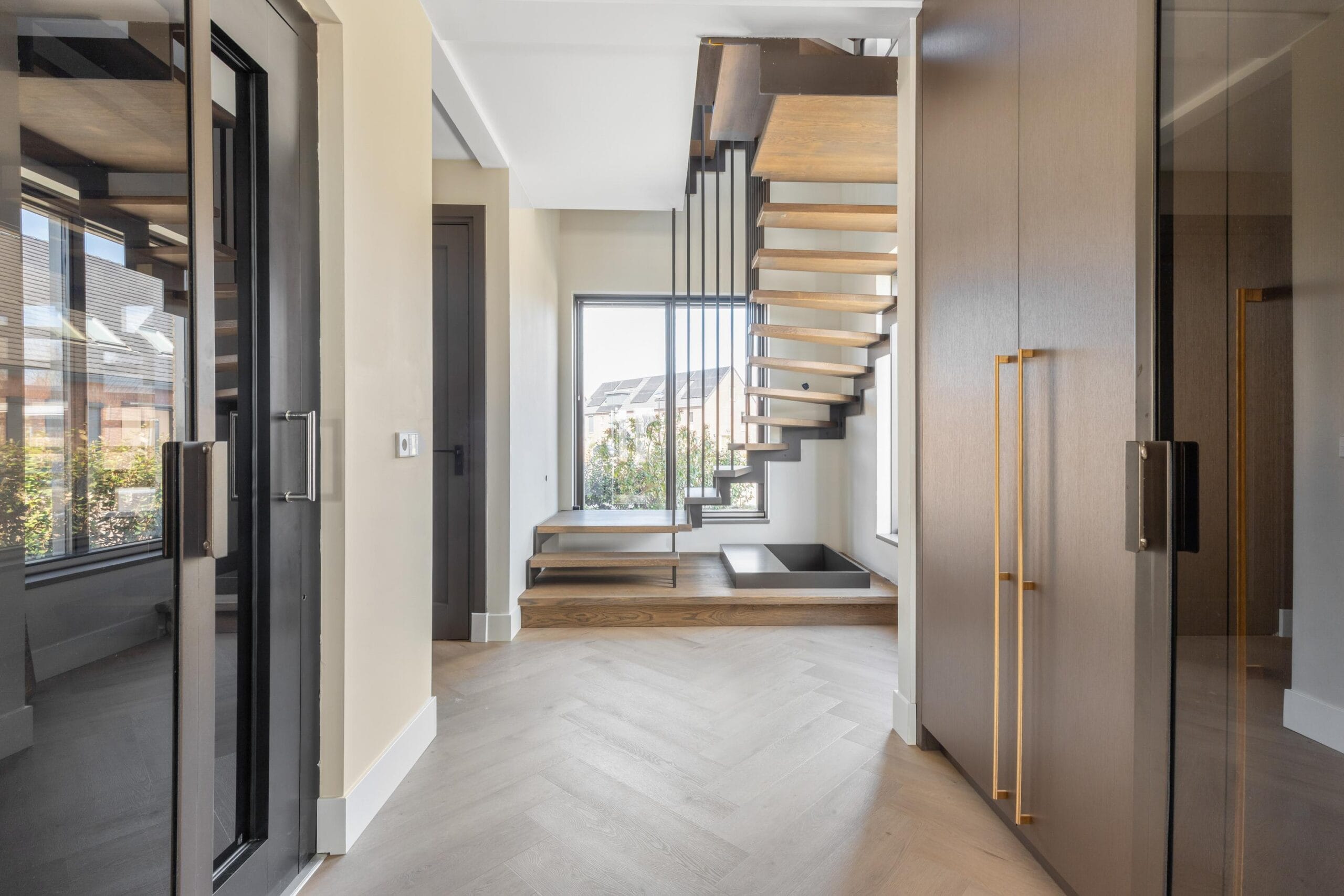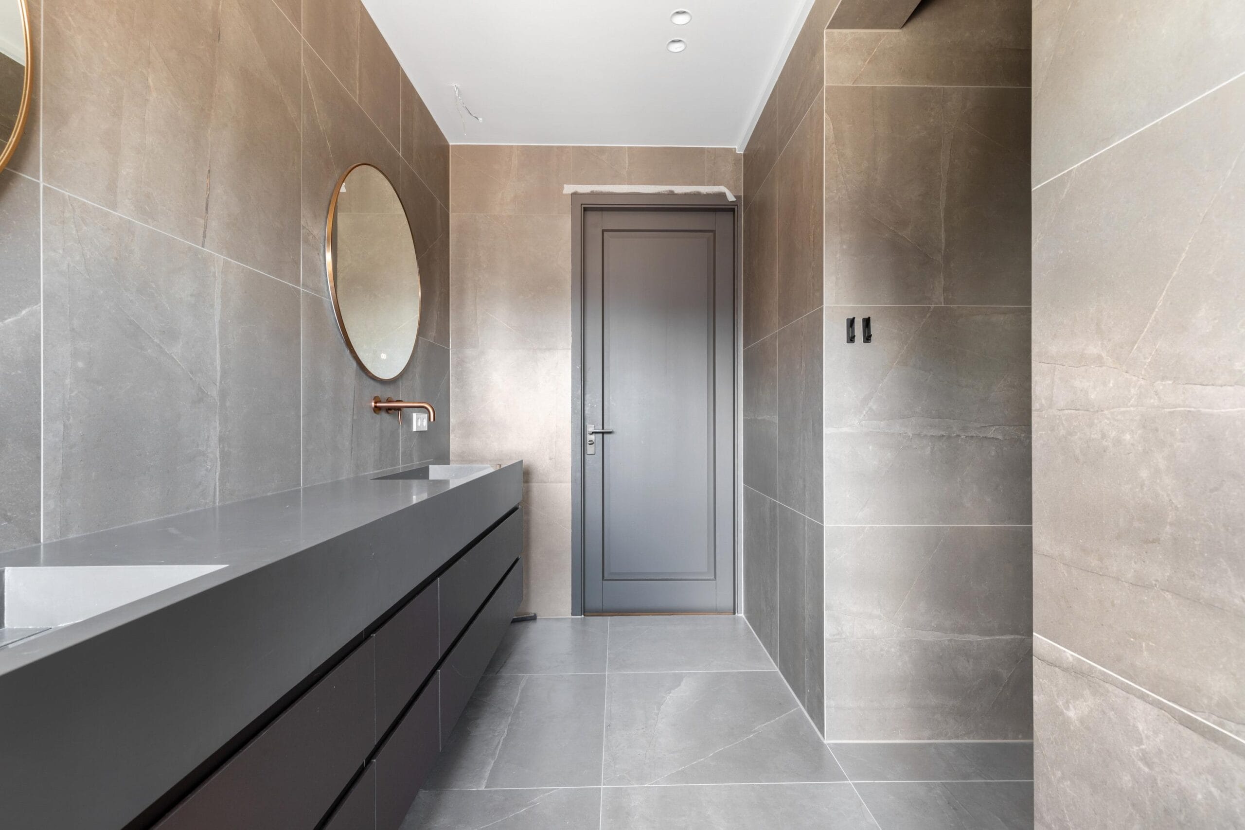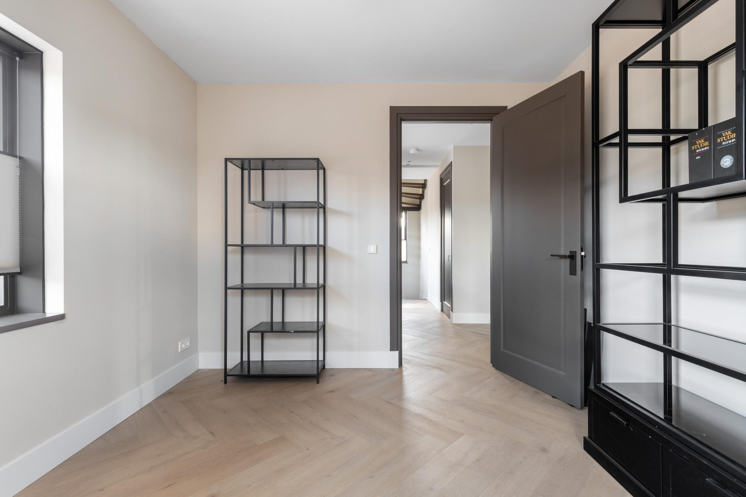 You reach the first floor via the stairs or the elevator. This is the floor with the most bedrooms, a separate toilet and a luxurious bathroom. Of the 4 bedrooms, 2 have their own walk-in closet. In short, plenty of space for a large family or multiple hobby rooms. The bathroom exudes a luxurious atmosphere due to the use of dark natural stone tiles, a double sink and a wonderfully spacious rain shower.
