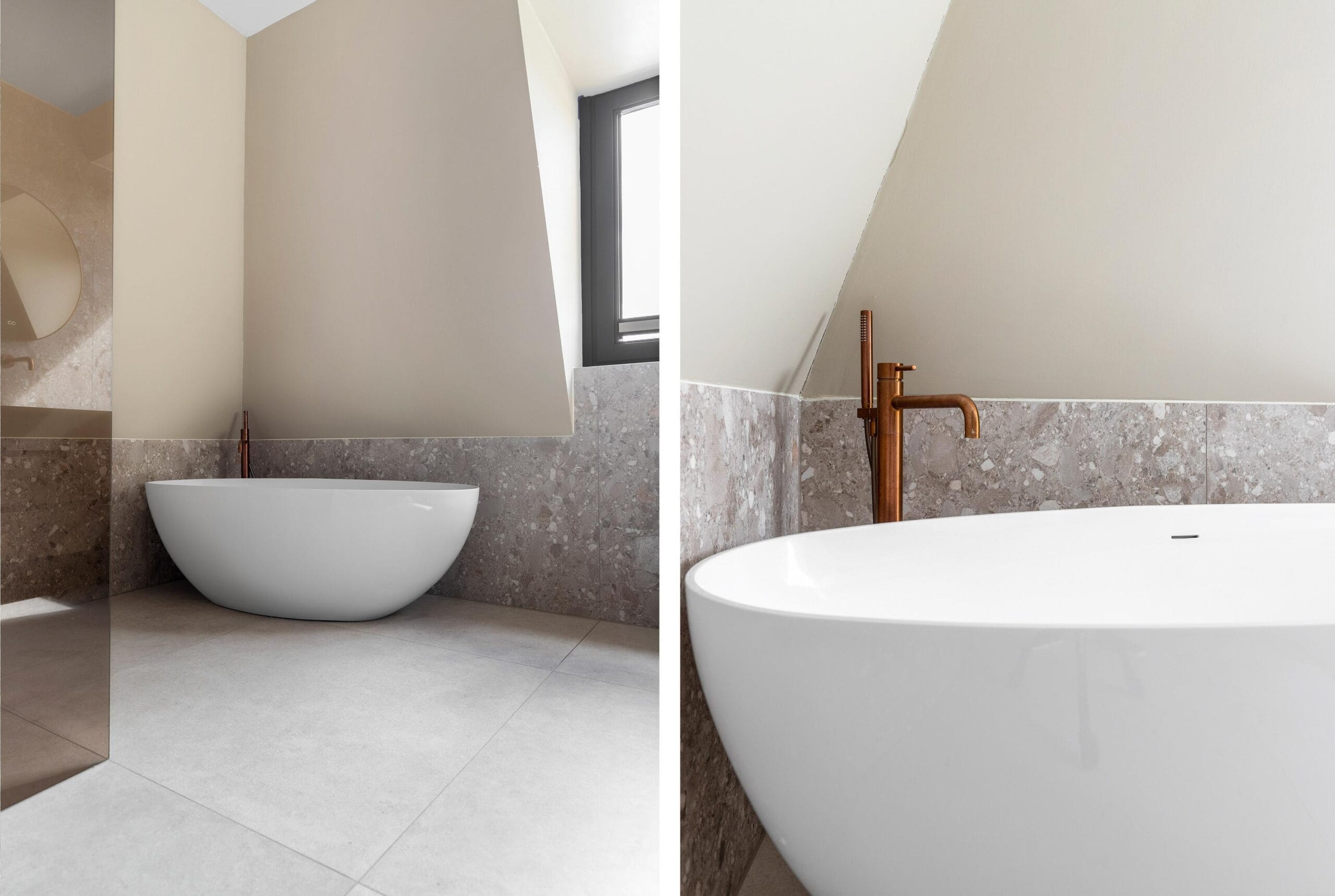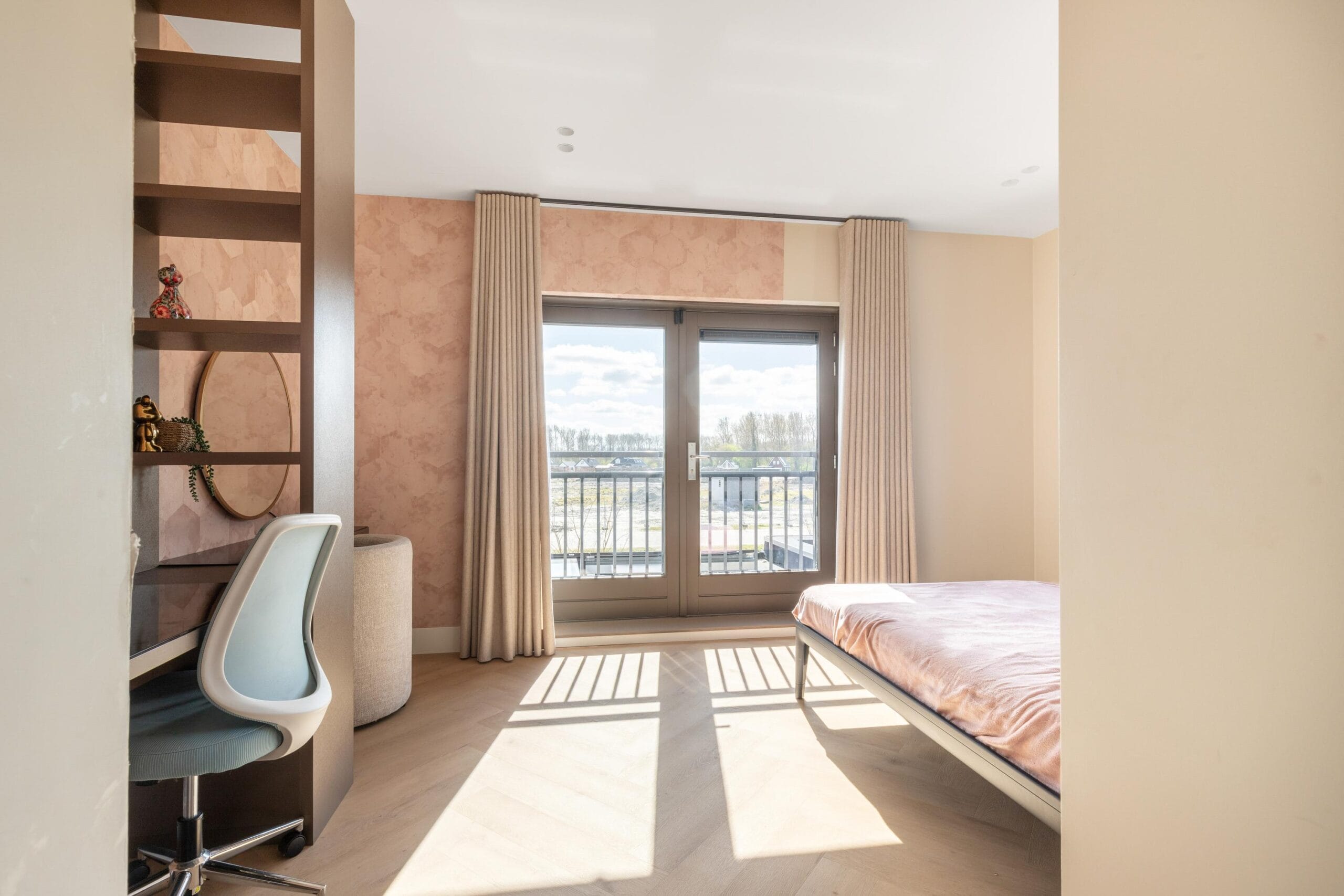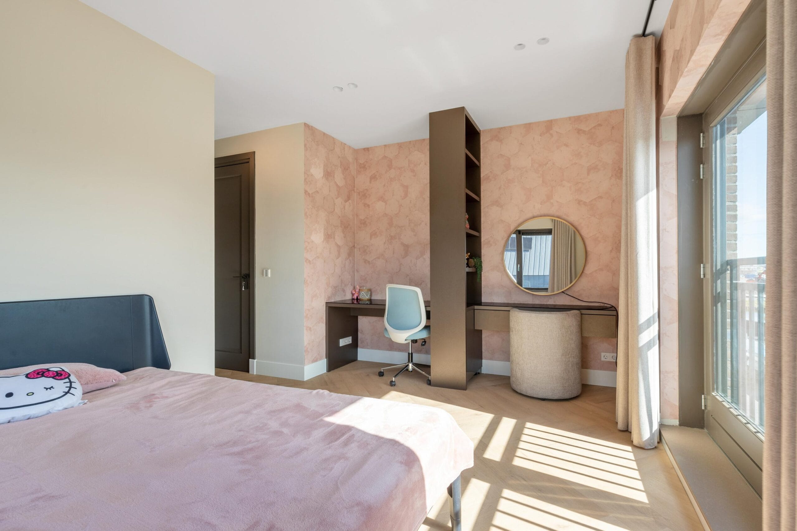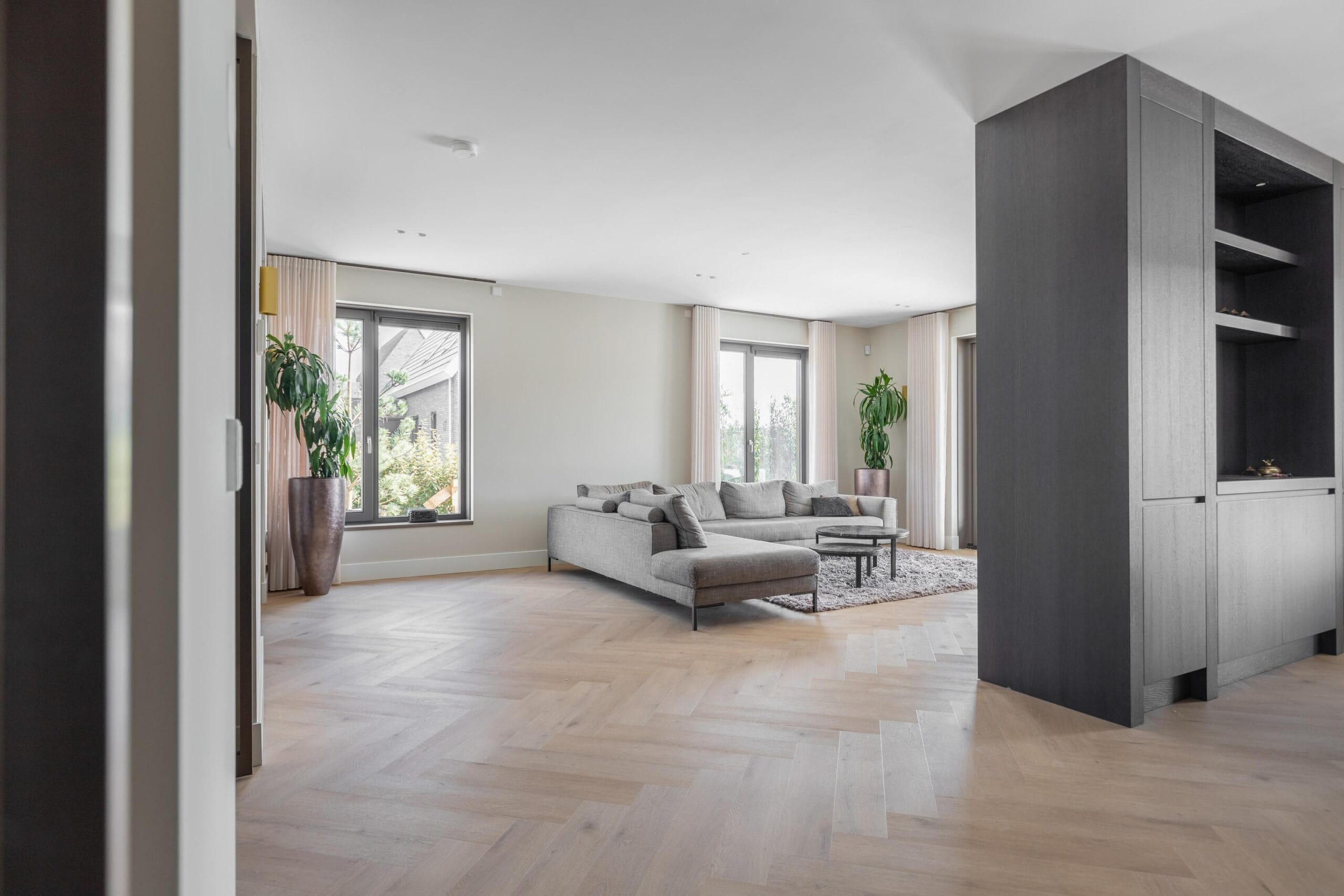 You reach the first floor via the stairs or the elevator. This is the floor with the most bedrooms, a separate toilet and a luxurious bathroom. Of the 4 bedrooms, 2 have their own walk-in closet. In short, plenty of space for a large family or multiple hobby rooms. The bathroom exudes a luxurious atmosphere due to the use of dark natural stone tiles, a double sink and a wonderfully spacious rain shower.