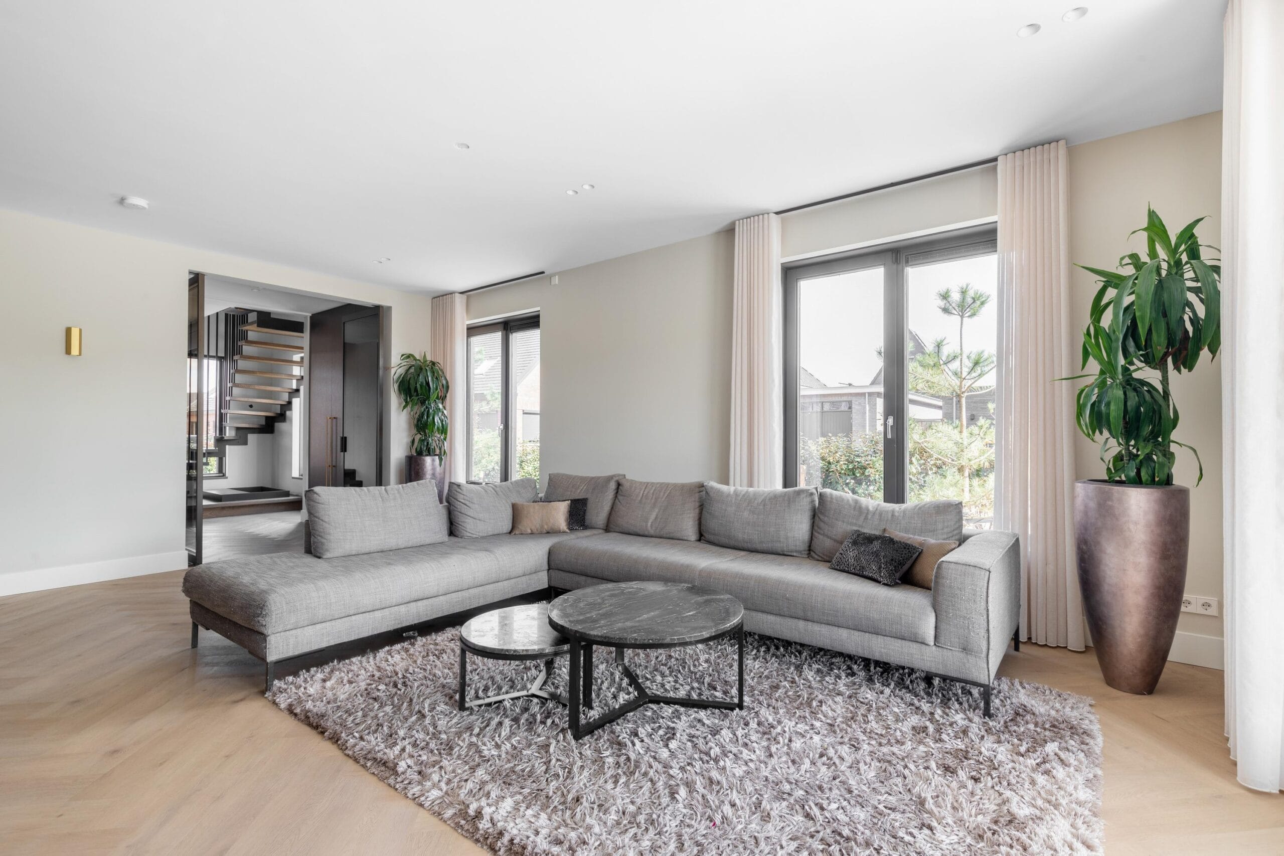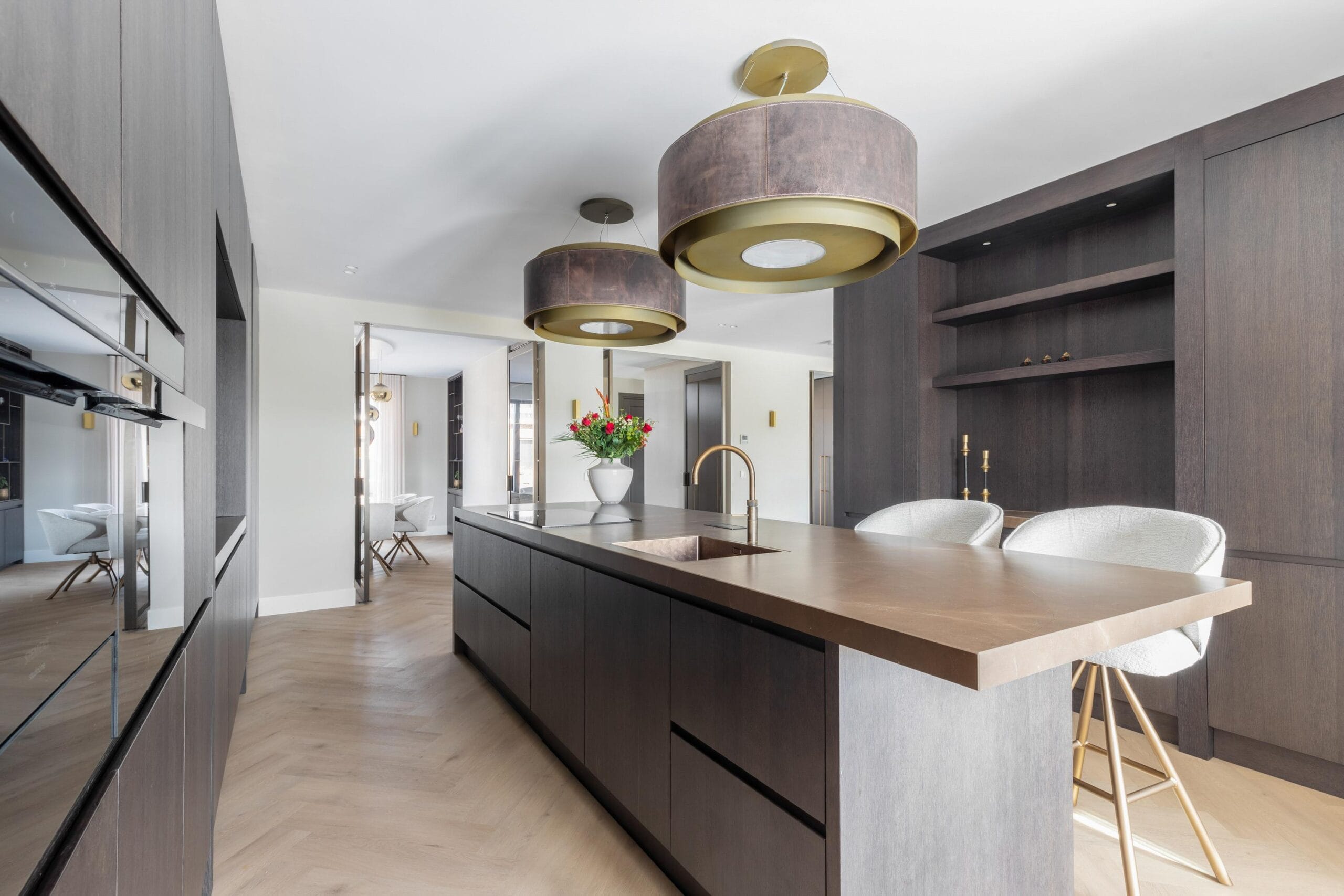 When you park your car on your own property in front of the house, you are immediately in front of a stately building that exudes class. The wooden double doors greet you as you walk towards the house. Through these enormous double doors you enter the prestigious reception hall, where you can look all the way up to the ridge of the house. This entrance is not inferior to a hotel lobby, due to its luxurious appearance. Here you will find a sturdy spiral staircase but also a private passenger lift, which will easily take you to one of the upper floors. Walk through one of the steel doors and enter the main room of the house: the living room. This is a very spacious living room that is completely right from top to bottom. Some highlights of this space: a glass gas fireplace between the living room and the kitchen, through which you can look straight, double doors to the garden, both in the living room and in the kitchen diner and the various luxurious built-in cupboards! The designer open kitchen is equipped with high-quality built-in aperture and not to forget 2 designer extractors above the cooking island.