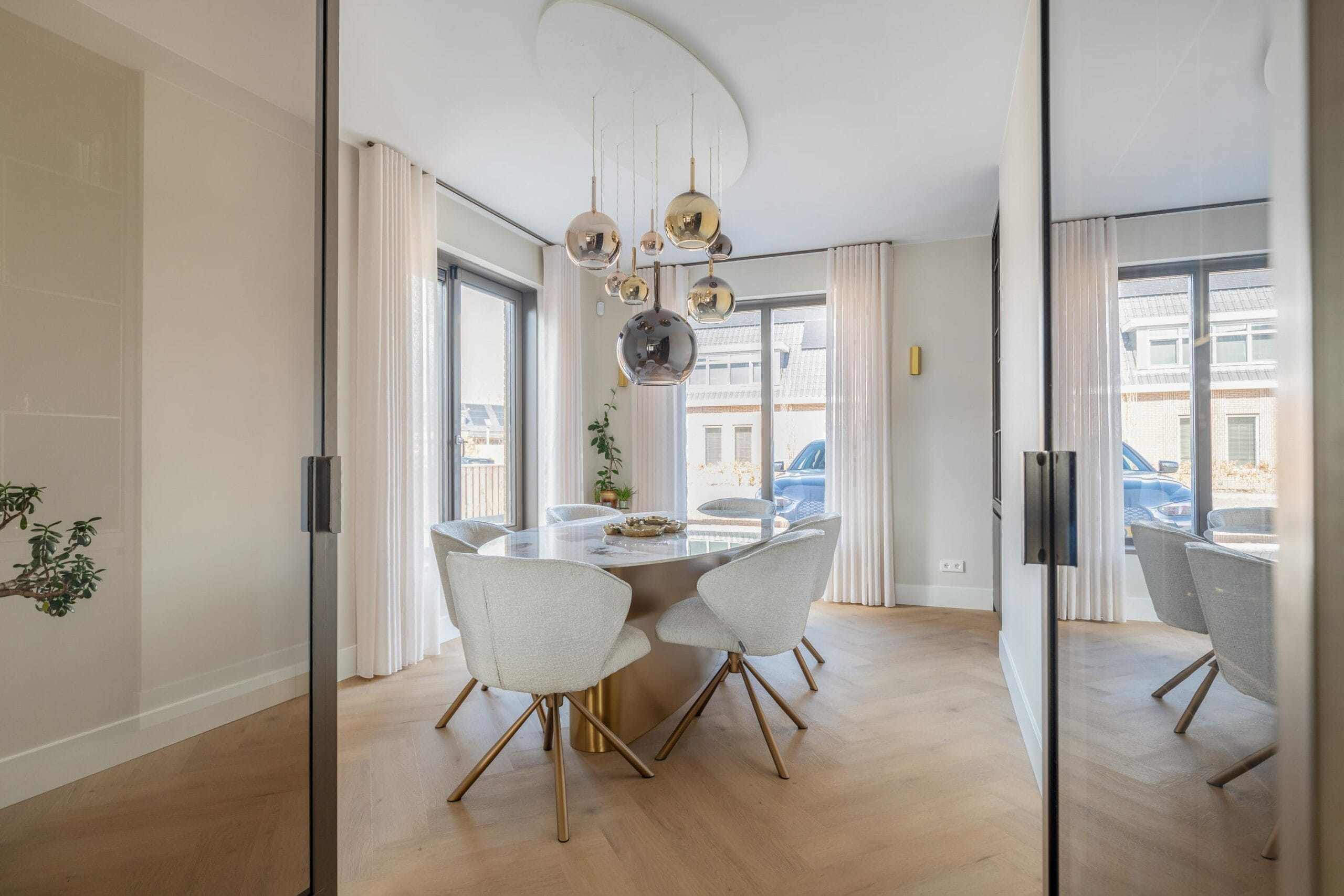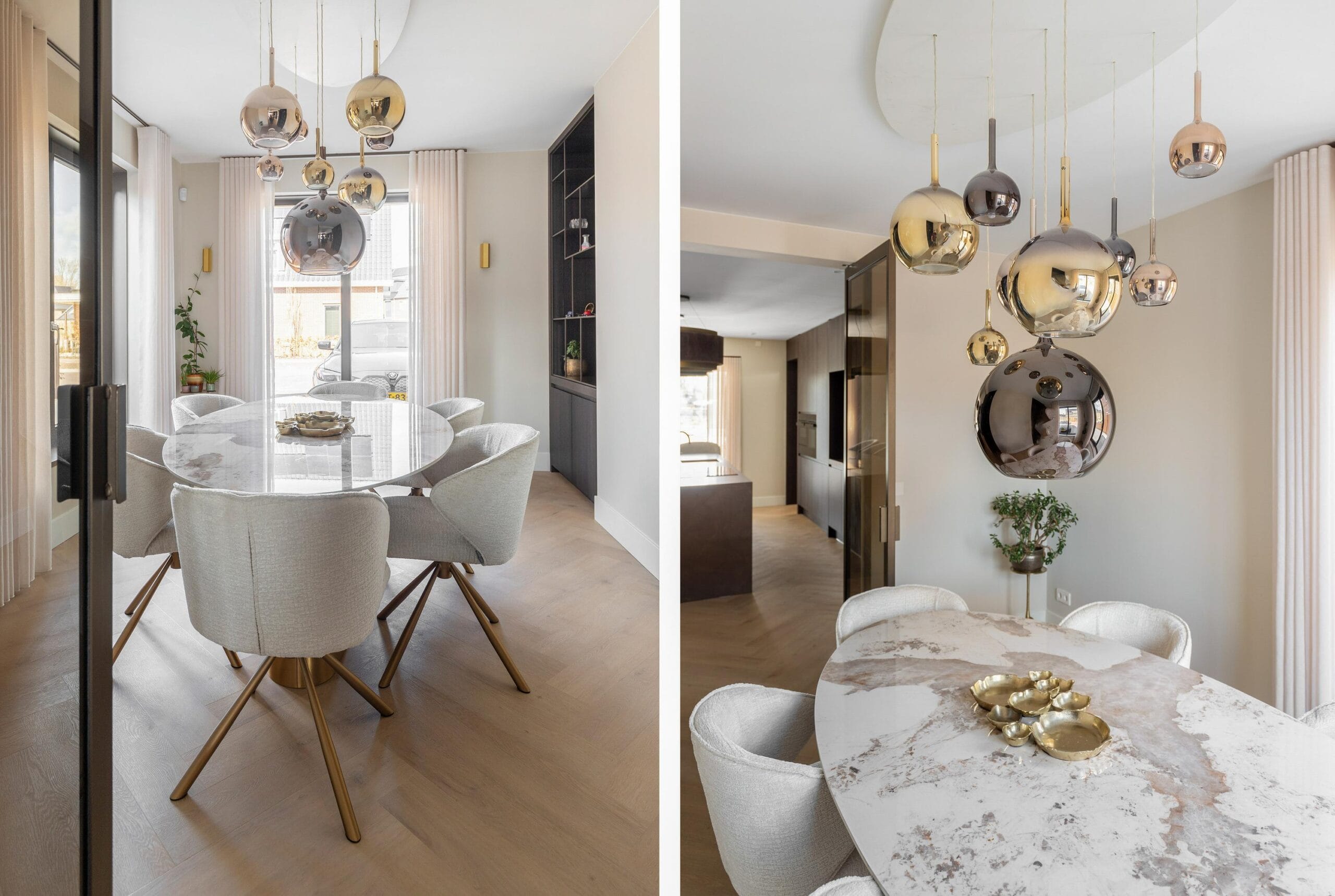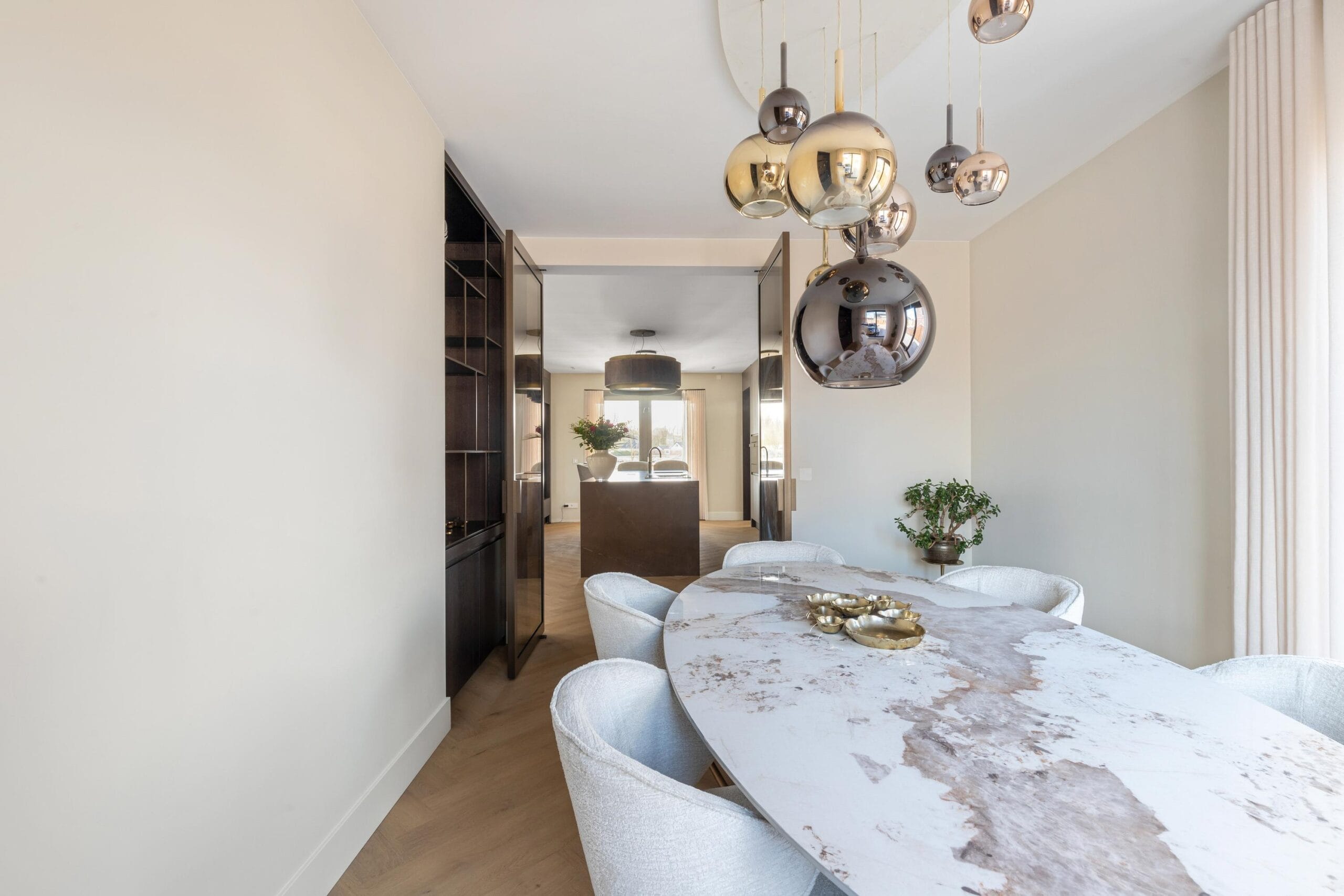 Aan het zeer royale kookeiland is het goed toeven aan het einde van de dag met een lekker glas wijn tijdens het koken. Indien je een grotere groep gasten hebt, kun je ook plaatsnemen aan de grote tafel in de naastgelegen eetkamer, die met gemak groepen tot 12 gasten accommodeert. Ook de grotere gelegenheden worden ‘appeltje eitje’ met een naast gelegen 2e keuken/butlerpantry- of anders in te richten- multifunctionele ruimte. Toch een kantoor aan huis? Of liever een praktijkruimte? De mogelijkheden zijn eindeloos!