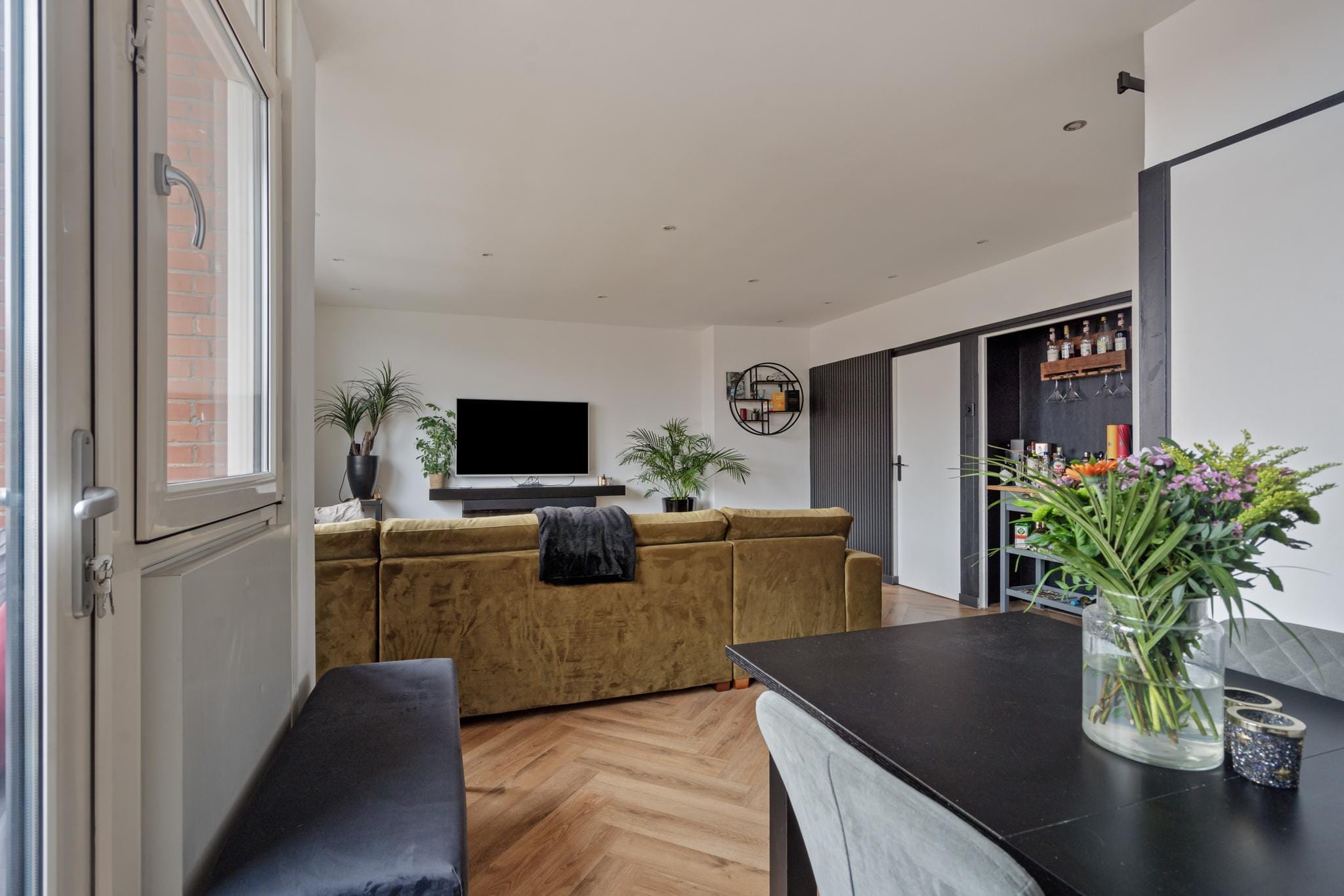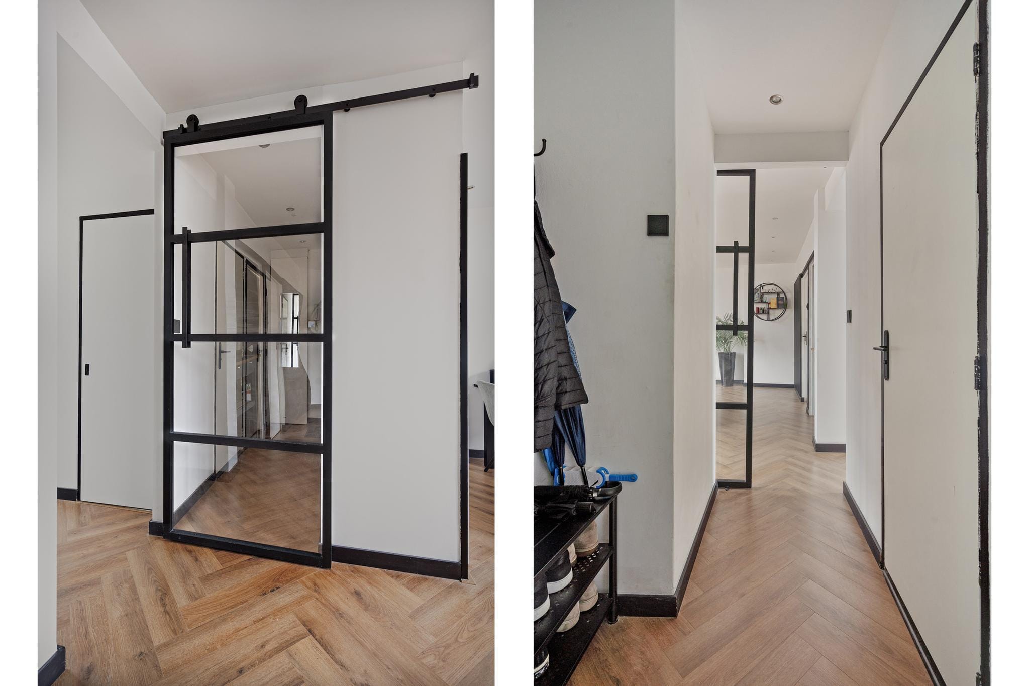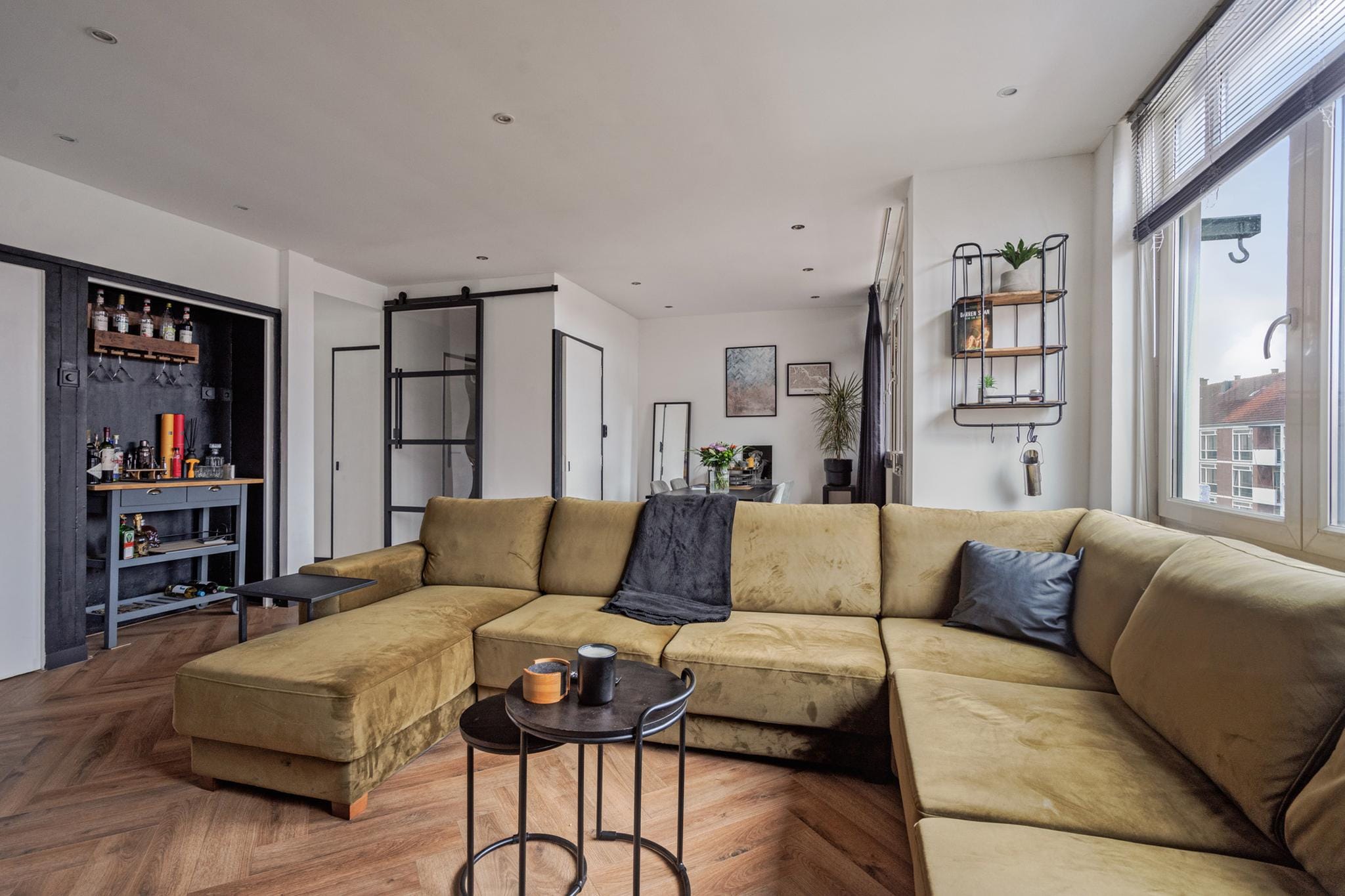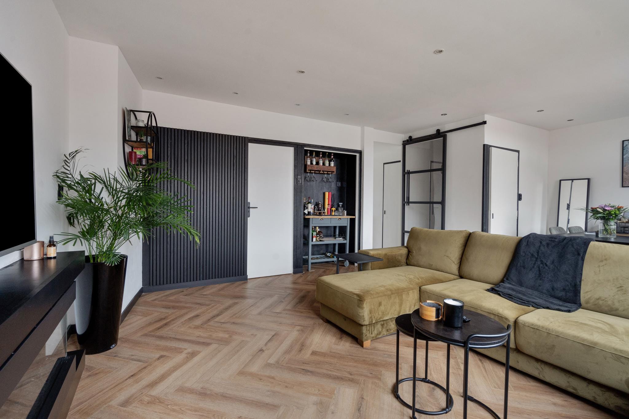 The central entrance with mailbox and intercom system provides access to the stairwell. This takes you to the apartment on the 3rd floor. Upon entering, the hall has a spacious appearance, due to the modern industrial sliding door that leads to the living room. Because the walls in the living room have been broken through, this room also has a spacious layout, and an open kitchen has been created. A tasteful herringbone floor with underfloor heating has been laid everywhere. A Cinewall including electric fireplace was installed in 2022. The perfect place to have drinks with friends and family at the end of the working week. On the other side of the room there is room for a large dining table where you can easily dine with six to eight people. Next to the dining table you will find the outside door to the first balcony. This is located on the east, so this is where you can start your summer day with a delicious cup of coffee! At the rear of the living room is the largest bedroom. Thanks to the surface area of 13 m2, a king-size bed, wardrobe, desk and the like can easily fit here.