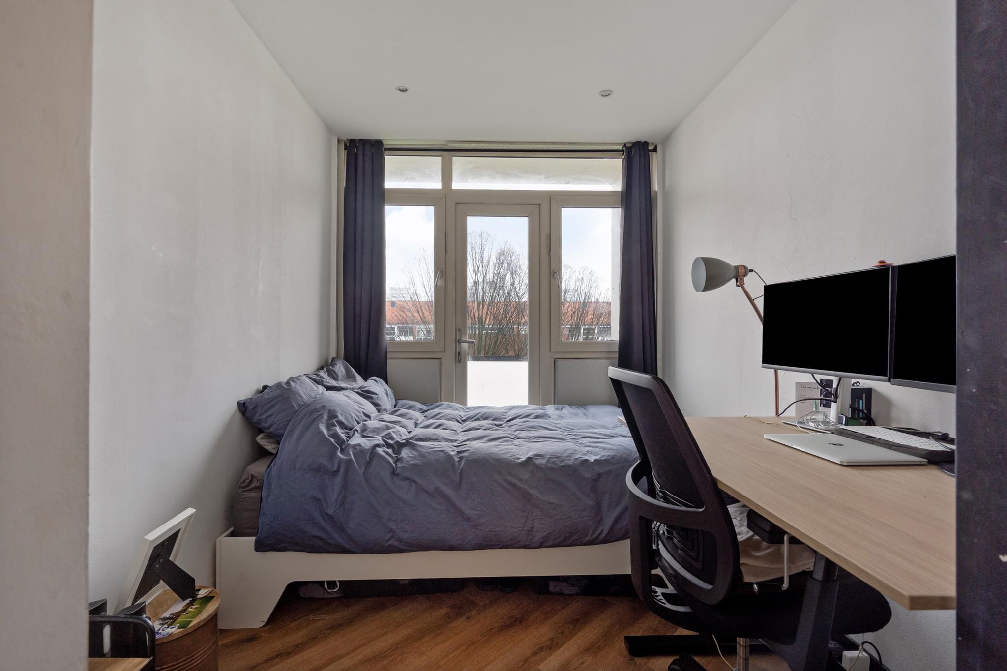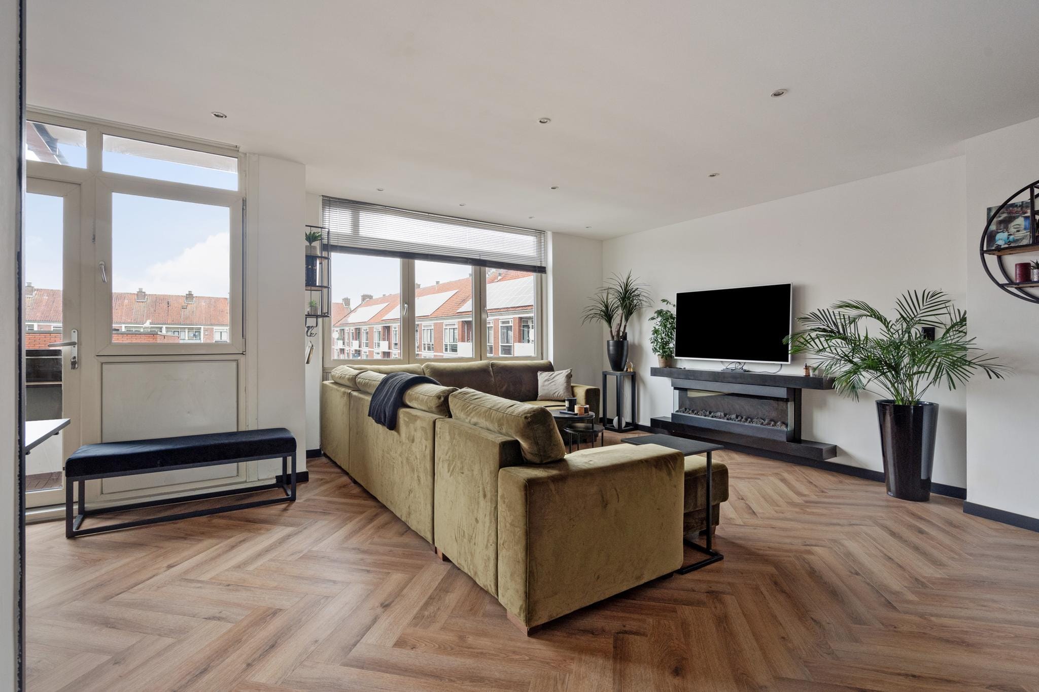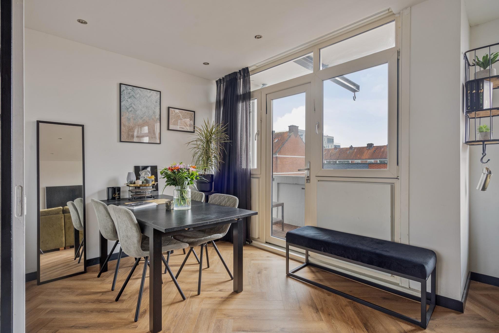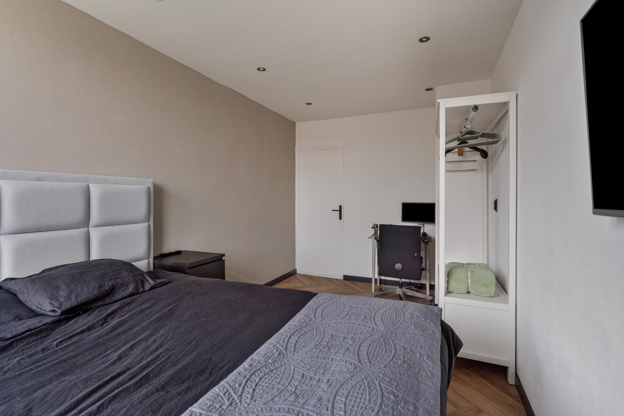 The central entrance with mailbox and intercom system provides access to the stairwell. This takes you to the apartment on the 3rd floor. Upon entering, the hall has a spacious appearance, due to the modern industrial sliding door that leads to the living room. Because the walls in the living room have been broken through, this room also has a spacious layout, and an open kitchen has been created. A tasteful herringbone floor with underfloor heating has been laid everywhere. A Cinewall including electric fireplace was installed in 2022. The perfect place to have drinks with friends and family at the end of the working week. On the other side of the room there is room for a large dining table where you can easily dine with six to eight people. Next to the dining table you will find the outside door to the first balcony. This is located on the east, so this is where you can start your summer day with a delicious cup of coffee! At the rear of the living room is the largest bedroom. Thanks to the surface area of 13 m2, a king-size bed, wardrobe, desk and the like can easily fit here.