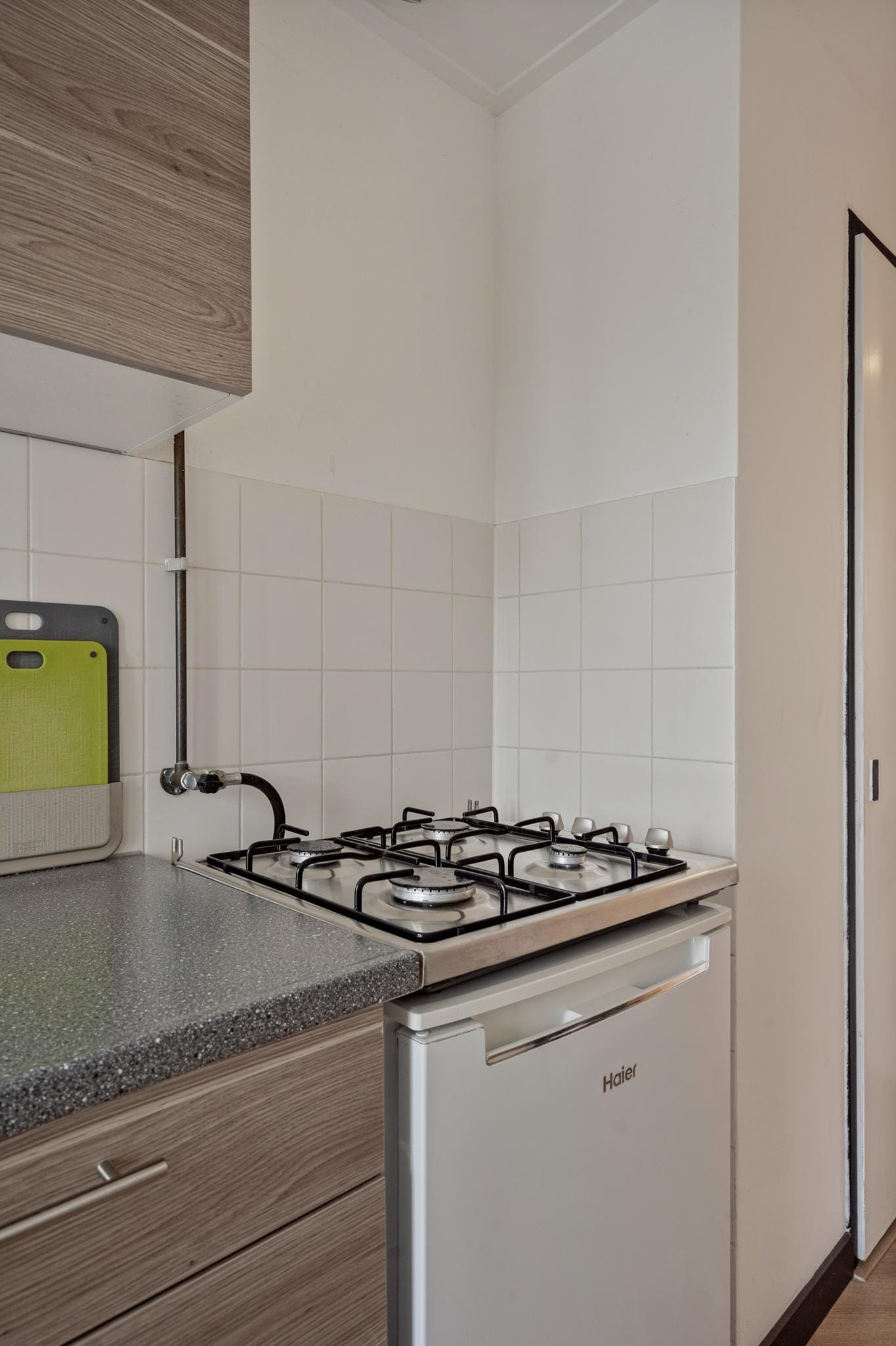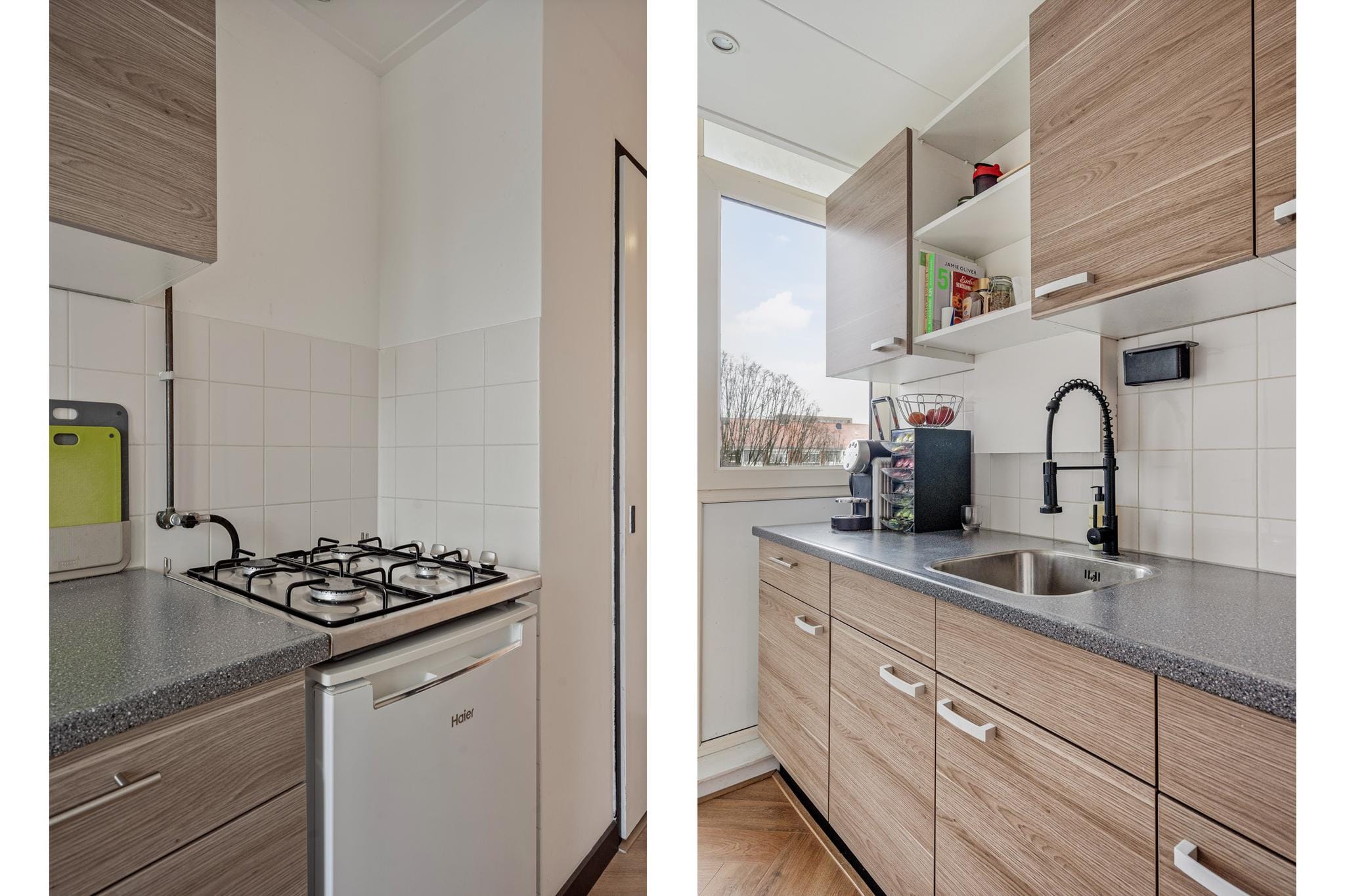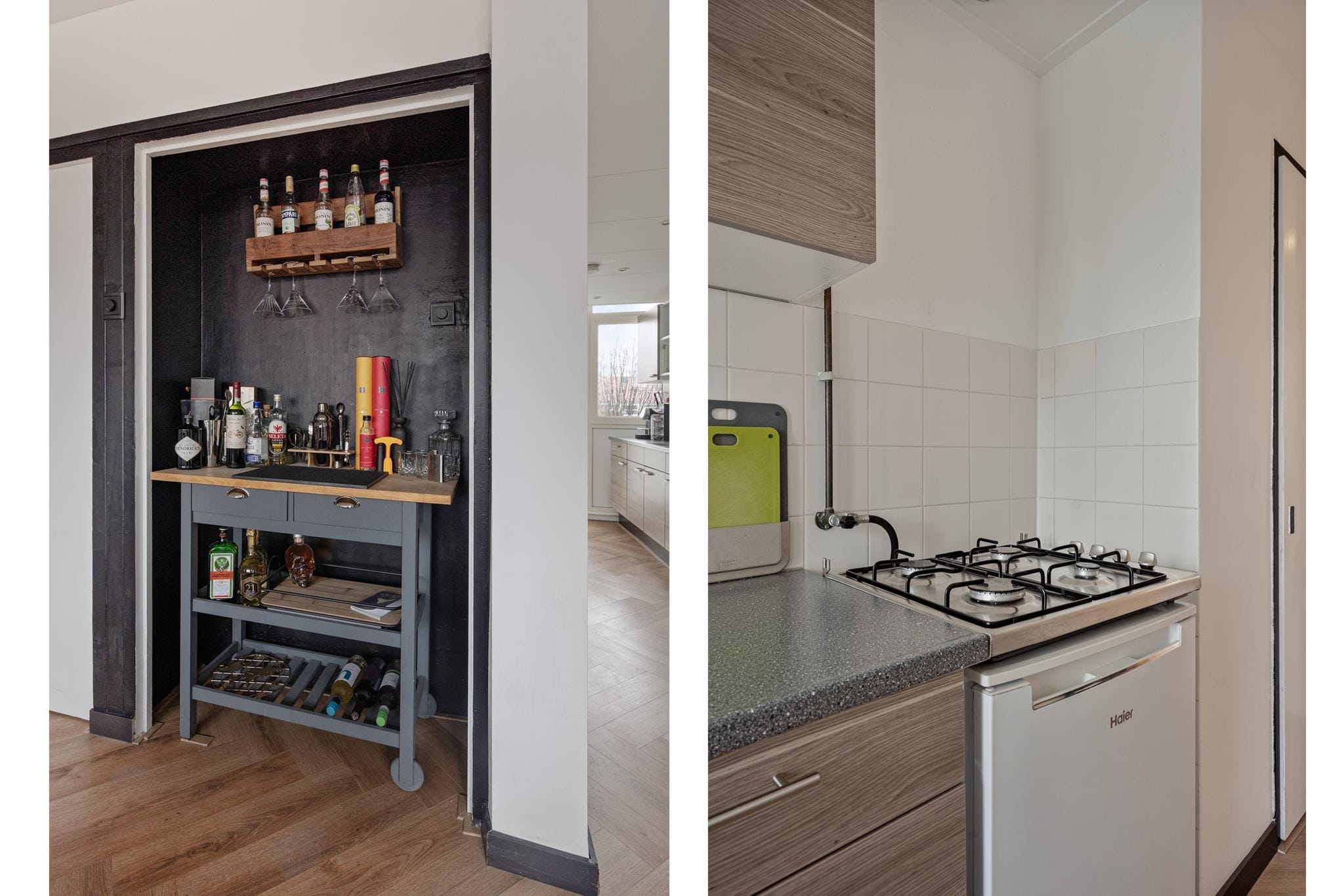 De open keuken aan de voorzijde van het appartementencomplex heeft veel natuurlijk belichting door het raam en de deur die leidt naar het tweede balkon. Het beschikt over een vierpits kookplaat, koelkast, wasbak met mengkraan en vaatwasser die nieuw is geplaatst in 2022. Aan de zijkant van de keuken bevindt zich de deur naar de wasruimte inclusief wasmachine. Daarnaast is in de keuken de toegang naar de badkamer. Deze is tevens gerenoveerd in 2021 en dit is bij binnenkomst direct te zien. De moderne tegels die zowel op de vloer als de muren zijn geplaatst geven de ruimte een luxe uitstraling. Daarnaast is het voorzien van regendouche, navulbare zeephouders, badkamermeubel, spiegel en elektrische handdoekenrek. In de hal bevindt zich het vrijstaande en in 2021 gerenoveerde toilet. De moderne uitstraling van de badkamer is hier weer terug te zien. Aan deze kant van de hal is de tweede slaapkamer te vinden. Deze heeft net als de keuken toegang naar het balkon aan de voorzijde van het appartement. Dit balkon is gelegen op het westen, dus aan het eind van een zomerse dag geniet hier juist van de ondergaande zon!