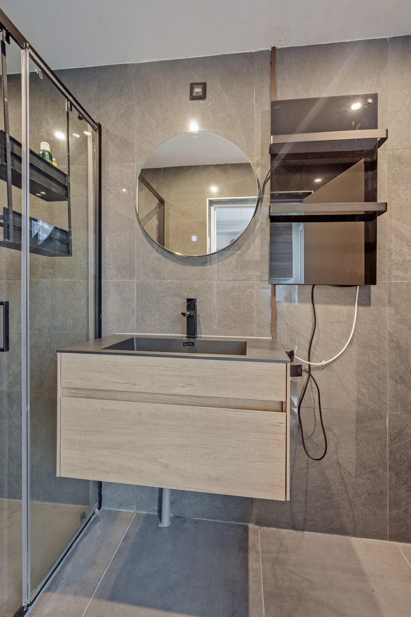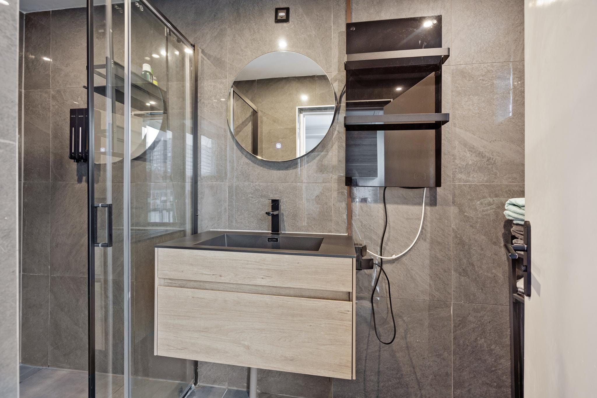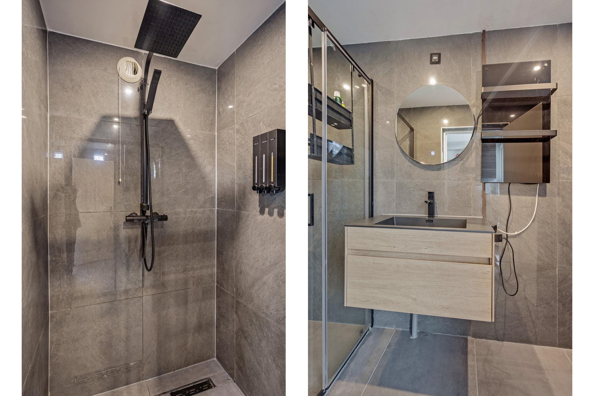 De open keuken aan de voorzijde van het appartementencomplex heeft veel natuurlijk belichting door het raam en de deur die leidt naar het tweede balkon. Het beschikt over een vierpits kookplaat, koelkast, wasbak met mengkraan en vaatwasser die nieuw is geplaatst in 2022. Aan de zijkant van de keuken bevindt zich de deur naar de wasruimte inclusief wasmachine. Daarnaast is in de keuken de toegang naar de badkamer. Deze is tevens gerenoveerd in 2021 en dit is bij binnenkomst direct te zien. De moderne tegels die zowel op de vloer als de muren zijn geplaatst geven de ruimte een luxe uitstraling. Daarnaast is het voorzien van regendouche, navulbare zeephouders, badkamermeubel, spiegel en elektrische handdoekenrek. In de hal bevindt zich het vrijstaande en in 2021 gerenoveerde toilet. De moderne uitstraling van de badkamer is hier weer terug te zien. Aan deze kant van de hal is de tweede slaapkamer te vinden. Deze heeft net als de keuken toegang naar het balkon aan de voorzijde van het appartement. Dit balkon is gelegen op het westen, dus aan het eind van een zomerse dag geniet hier juist van de ondergaande zon!