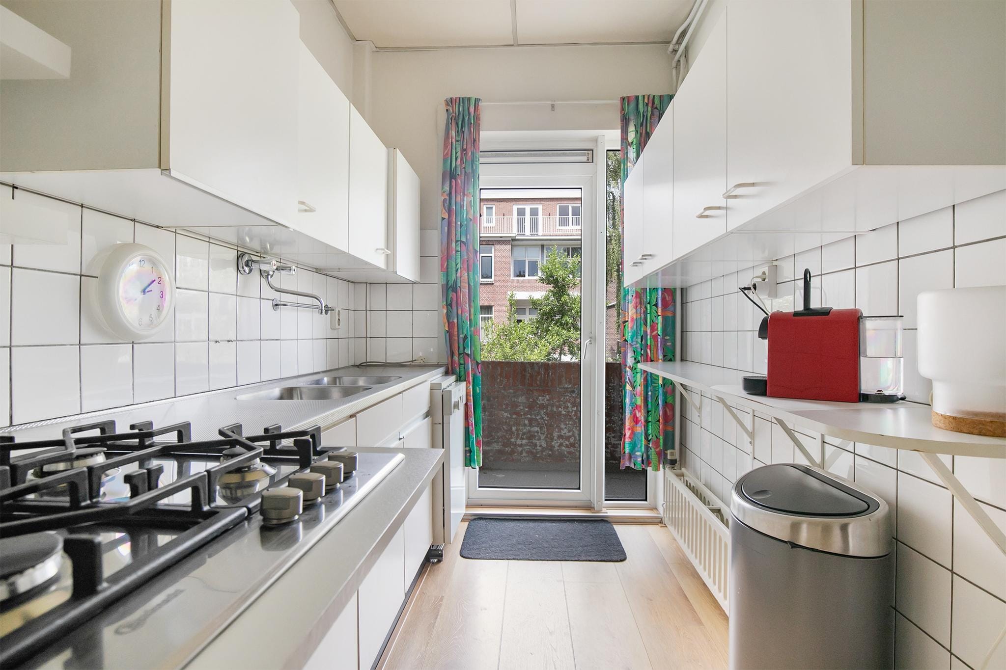 Aan beide zijden van de ruimte zijn keukenkasten, waardoor het over ruim voldoende opbergruimte beschikt. De keuken heeft tevens een vierpits kookplaat, dubbele wastafel met mengkraan, aansluiting voor een wasmachine en geeft aan de achterzijde toegang tot het balkon. Dit appartement beschikt over twee slaapkamers. De grootste 2-persoonsslaapkamer is gelegen aan de voorzijde en de tweede 1-persoonsslaapkamer aan de achterzijde naast de keuken.